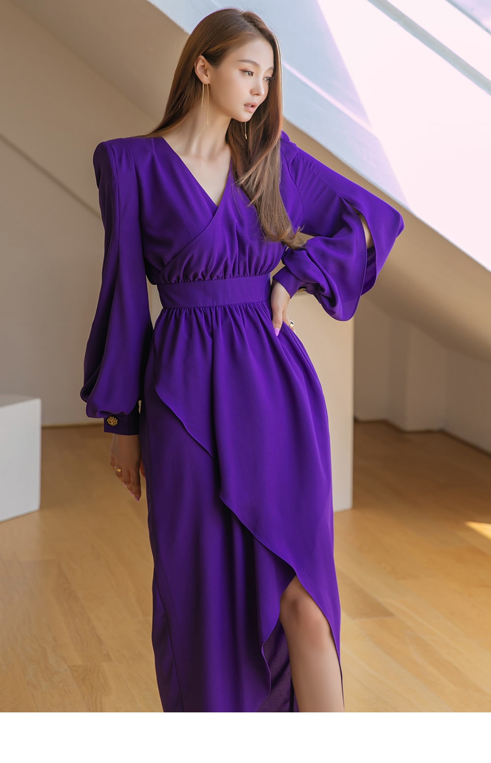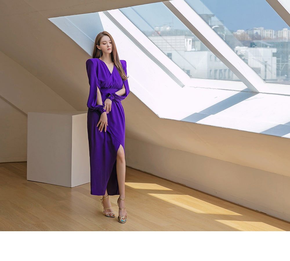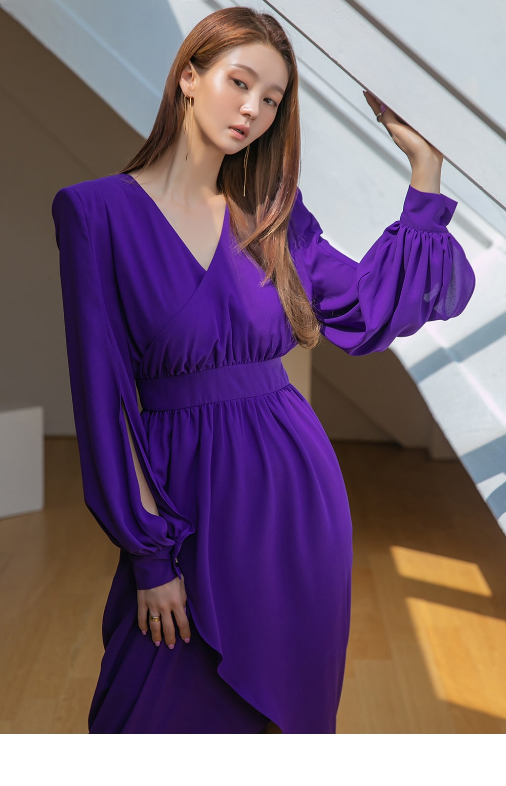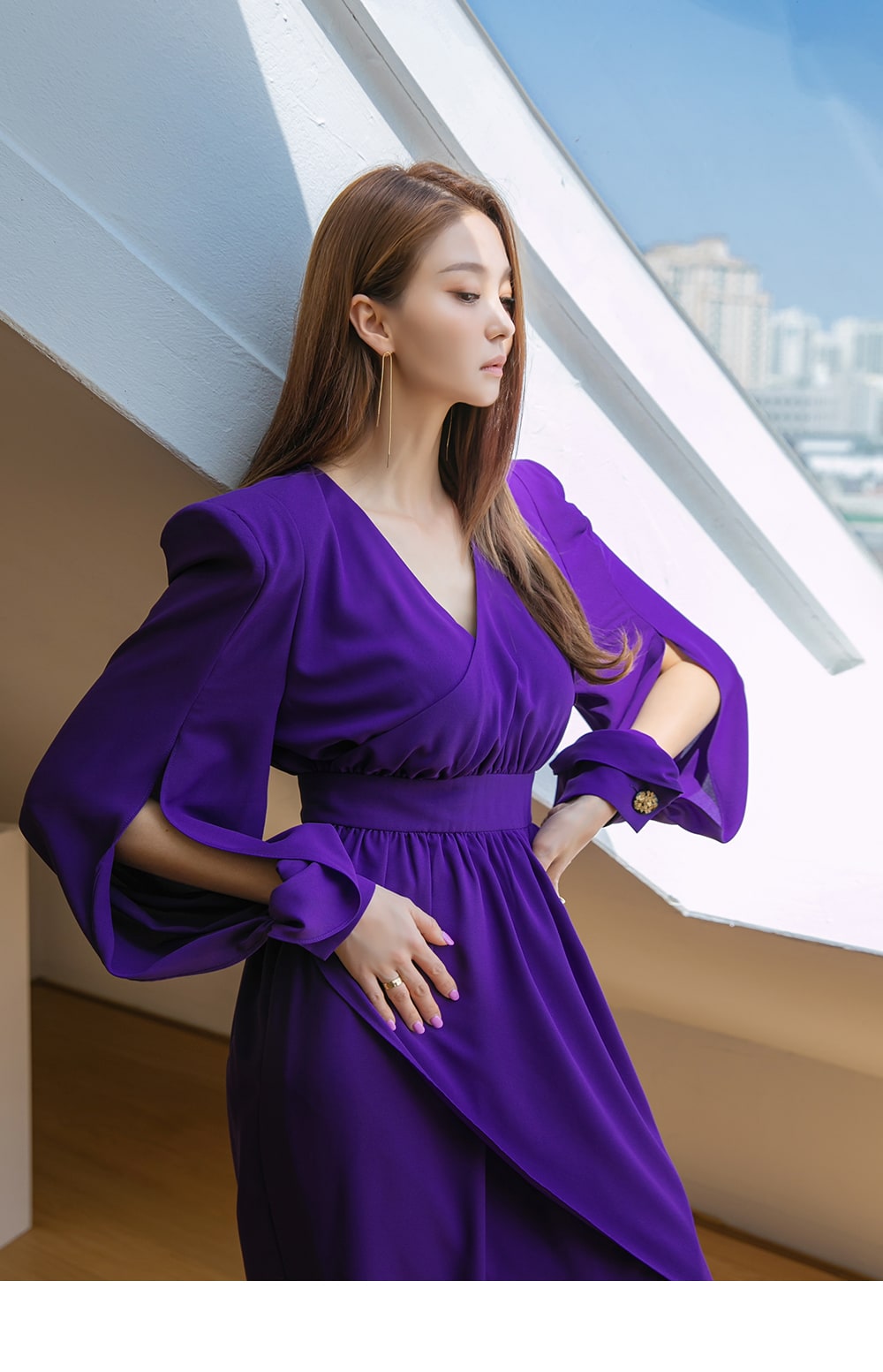 "Sleeve Slit Pad Warp Asymmetric Dress."