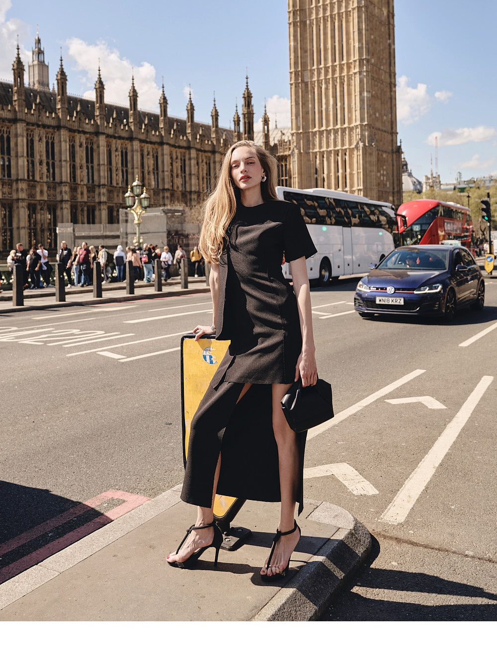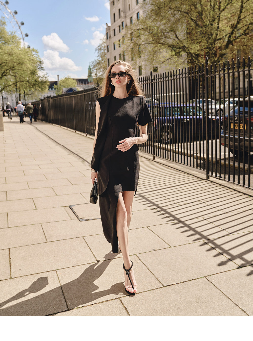The asymmetric hem and sleeve design create a distinctive silhouette,