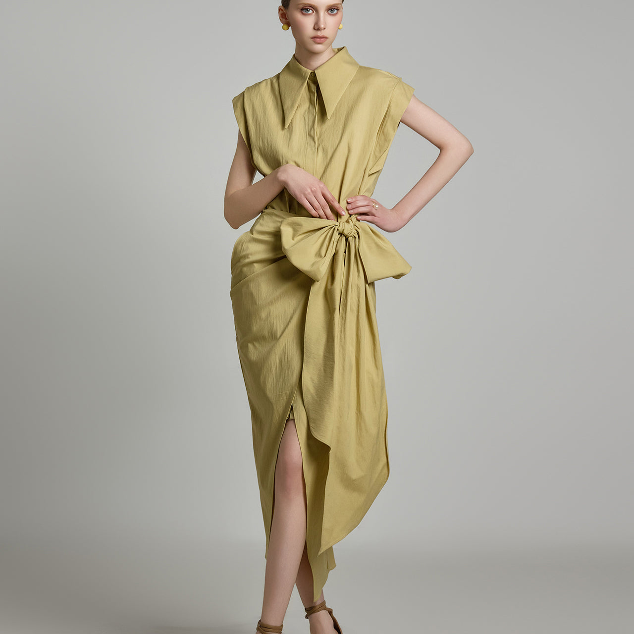 The model is 174CM tall and is wearing ONE size in Yellow Beige.