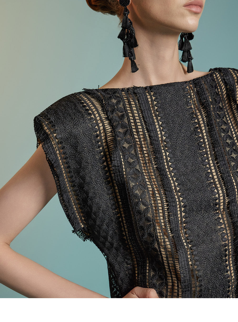 The delicate lace texture is complemented by raw-edge shoulder finishes