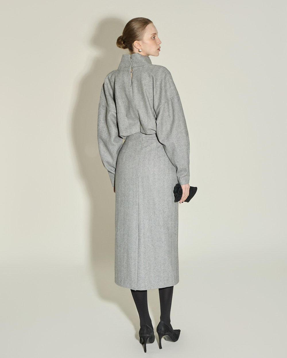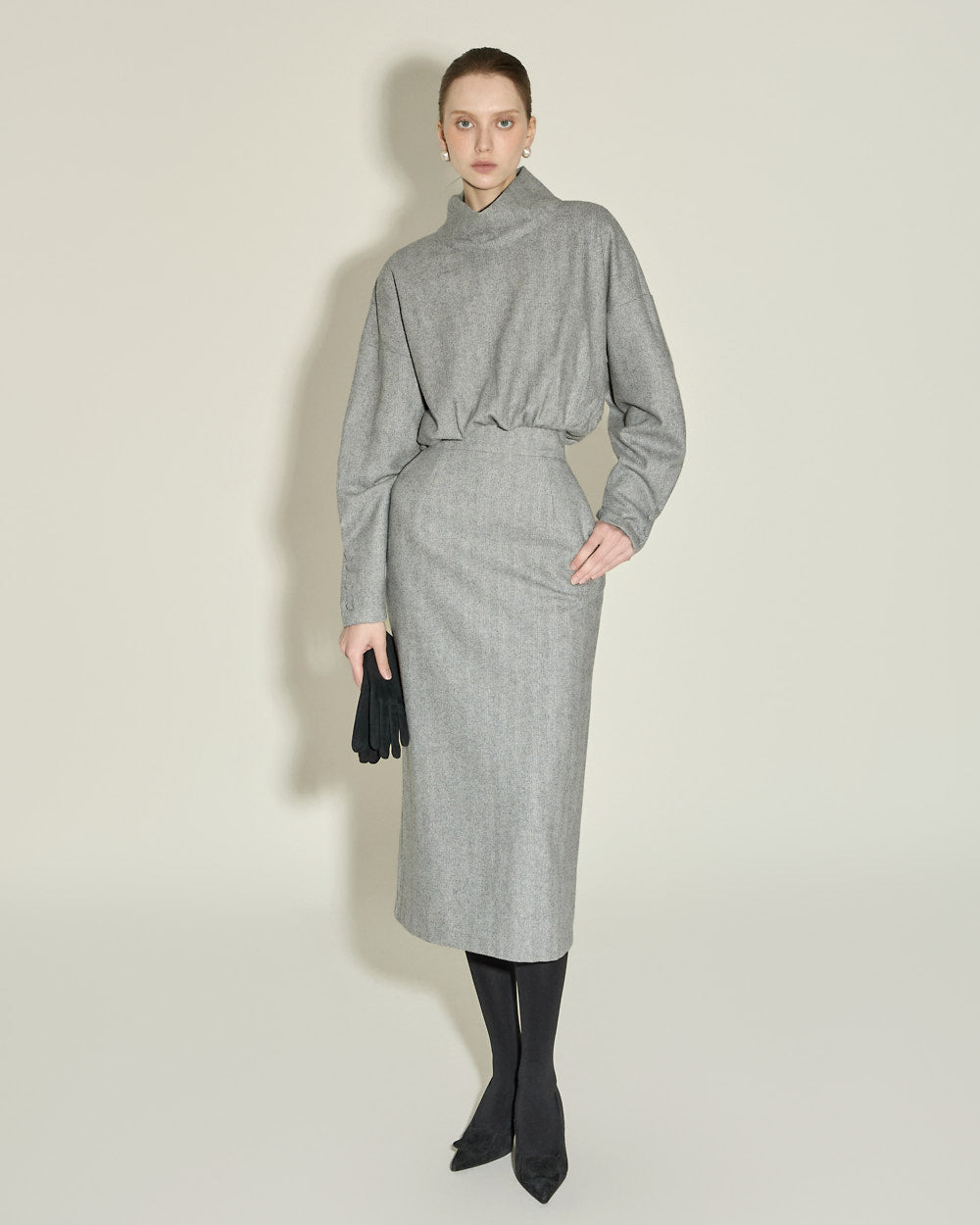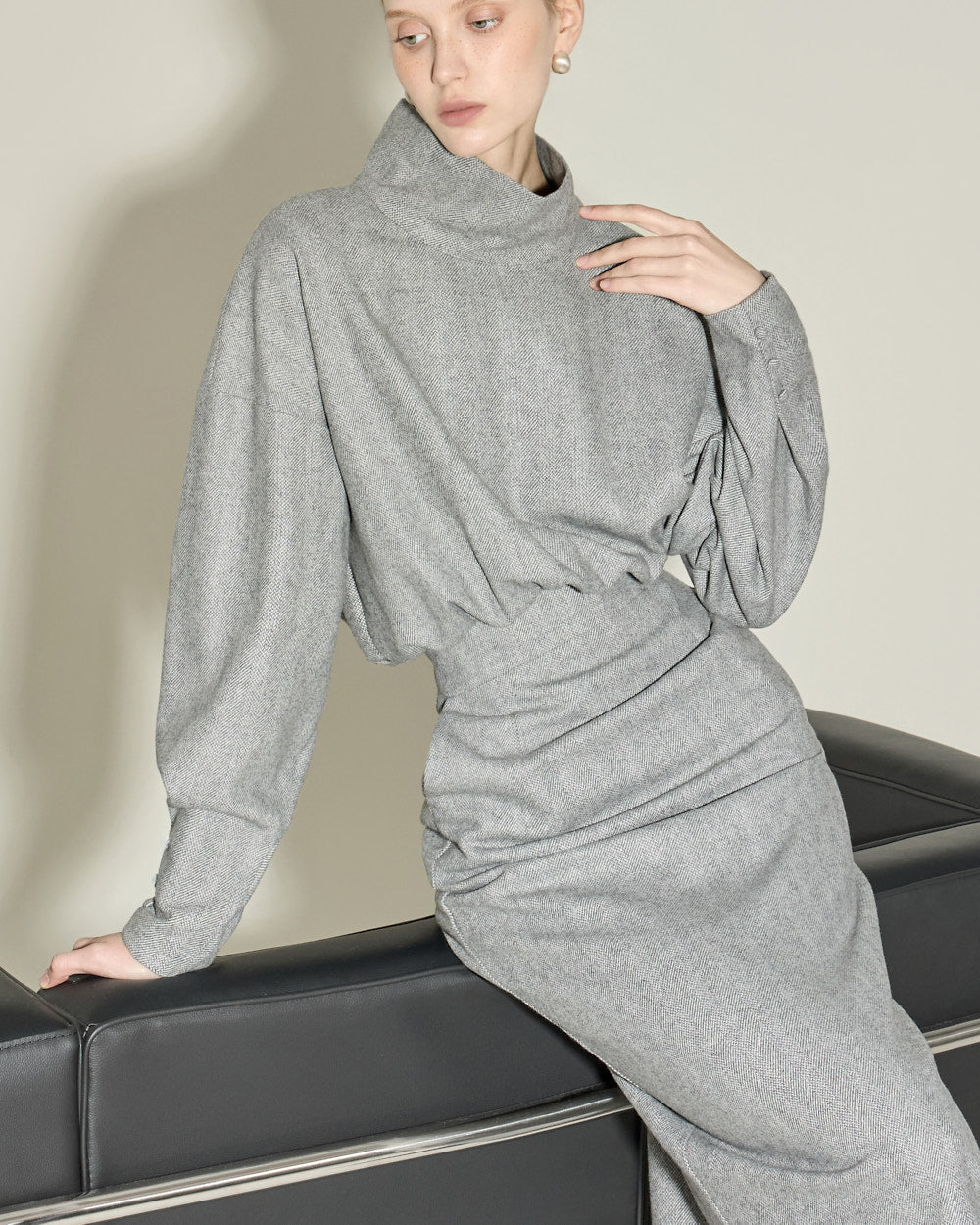 This high neck wool dress exudes a modern and feminine vibe.