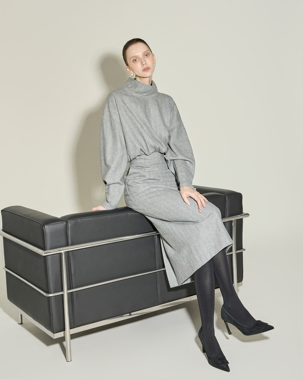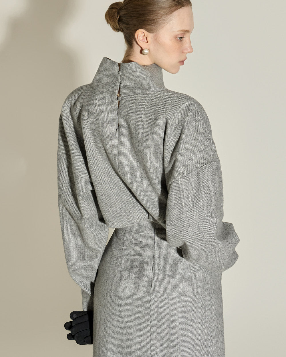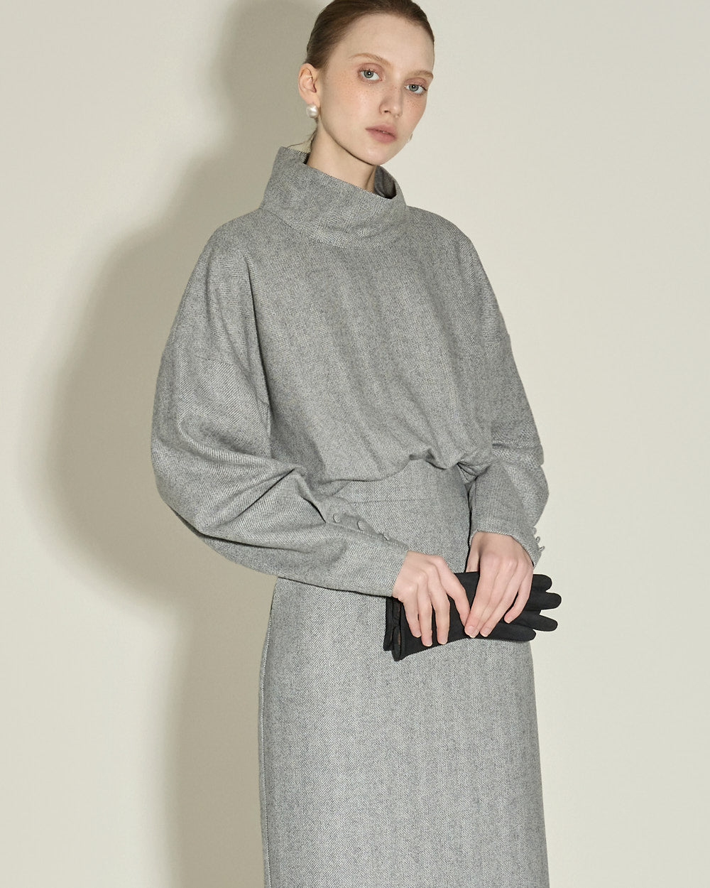 This high neck wool dress exudes a modern and feminine vibe.
