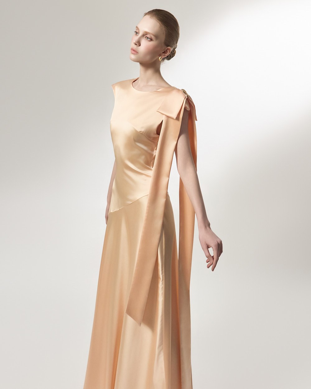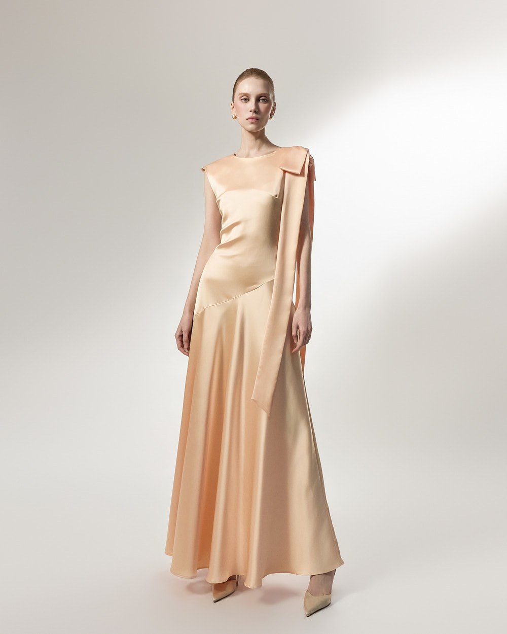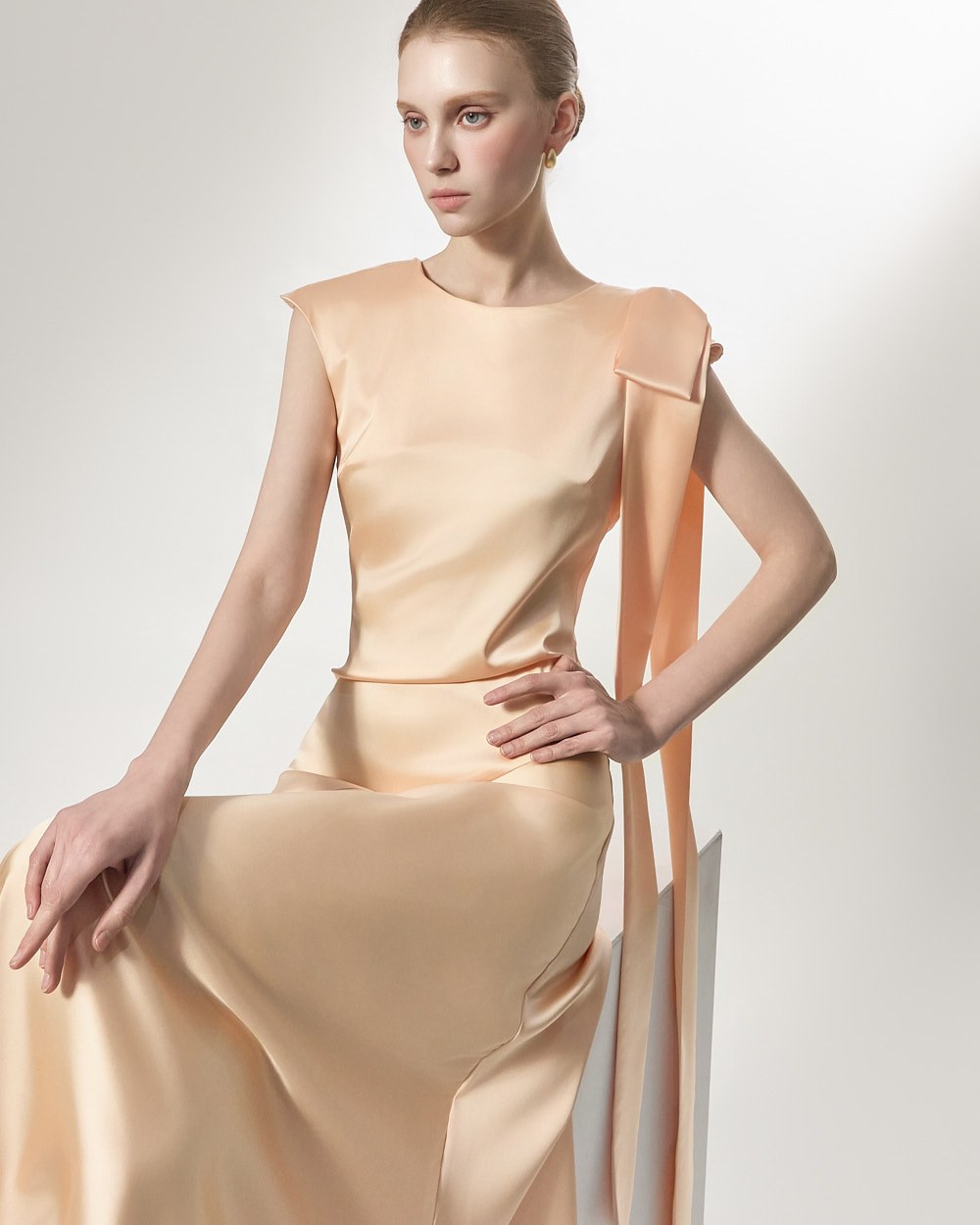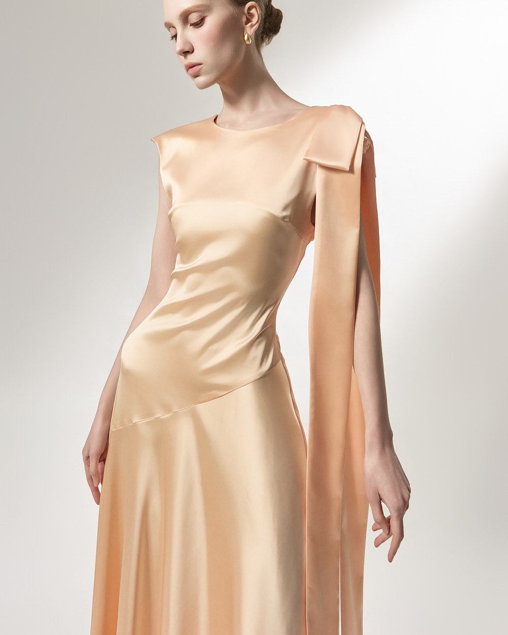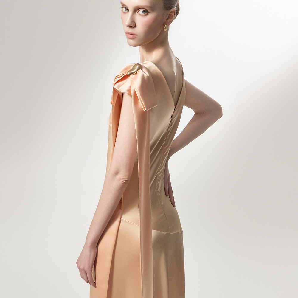 The ribbon detail, draping long along the shoulder line, adds a feminine and stylish touch,