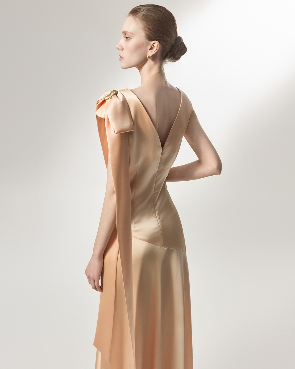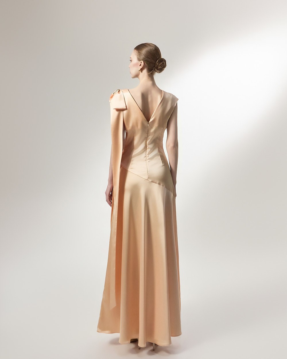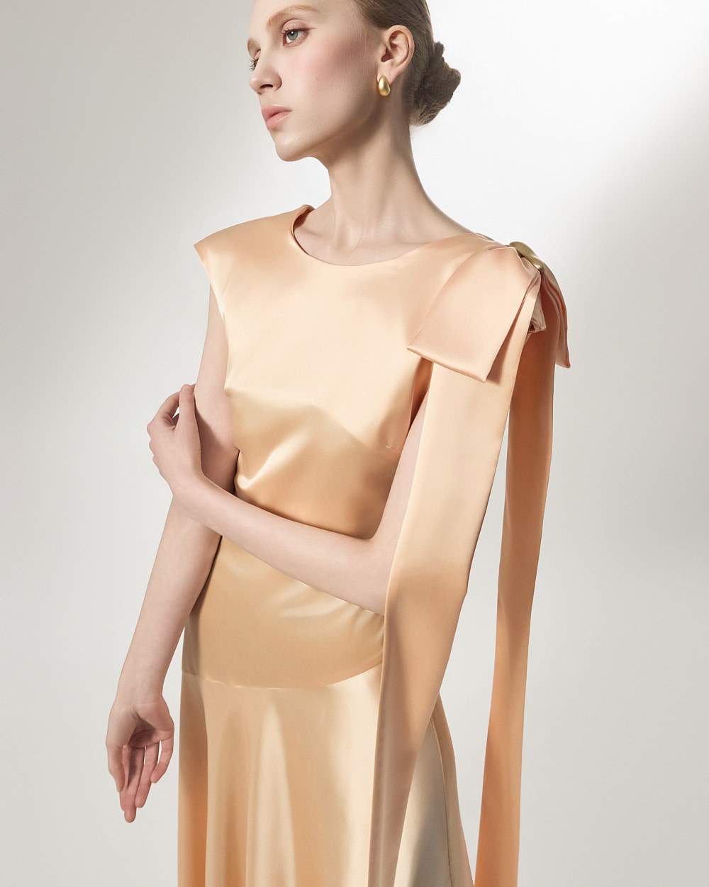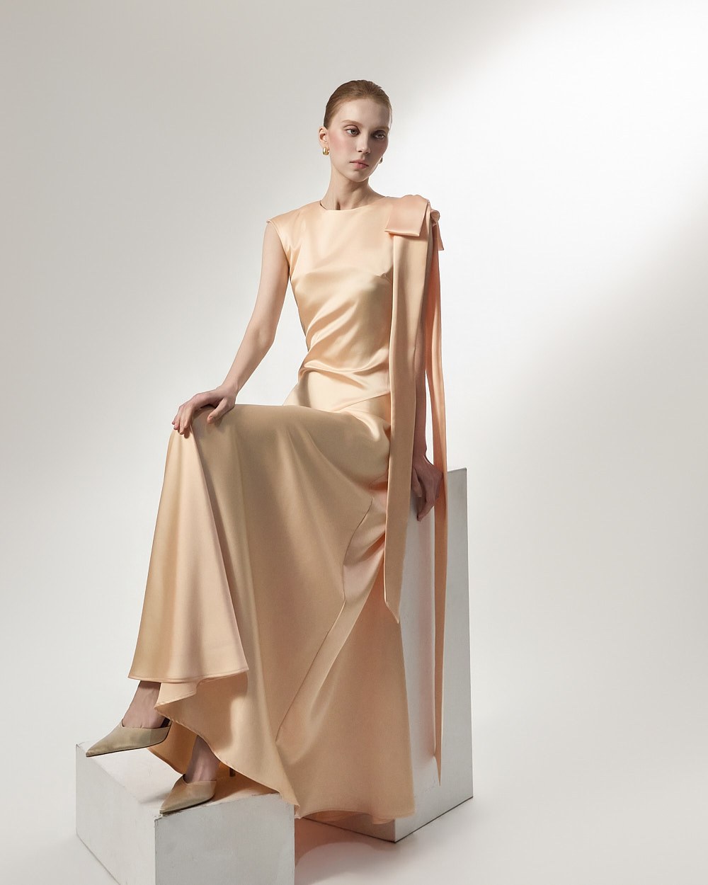 The ribbon detail, draping long along the shoulder line, adds a feminine and stylish touch,