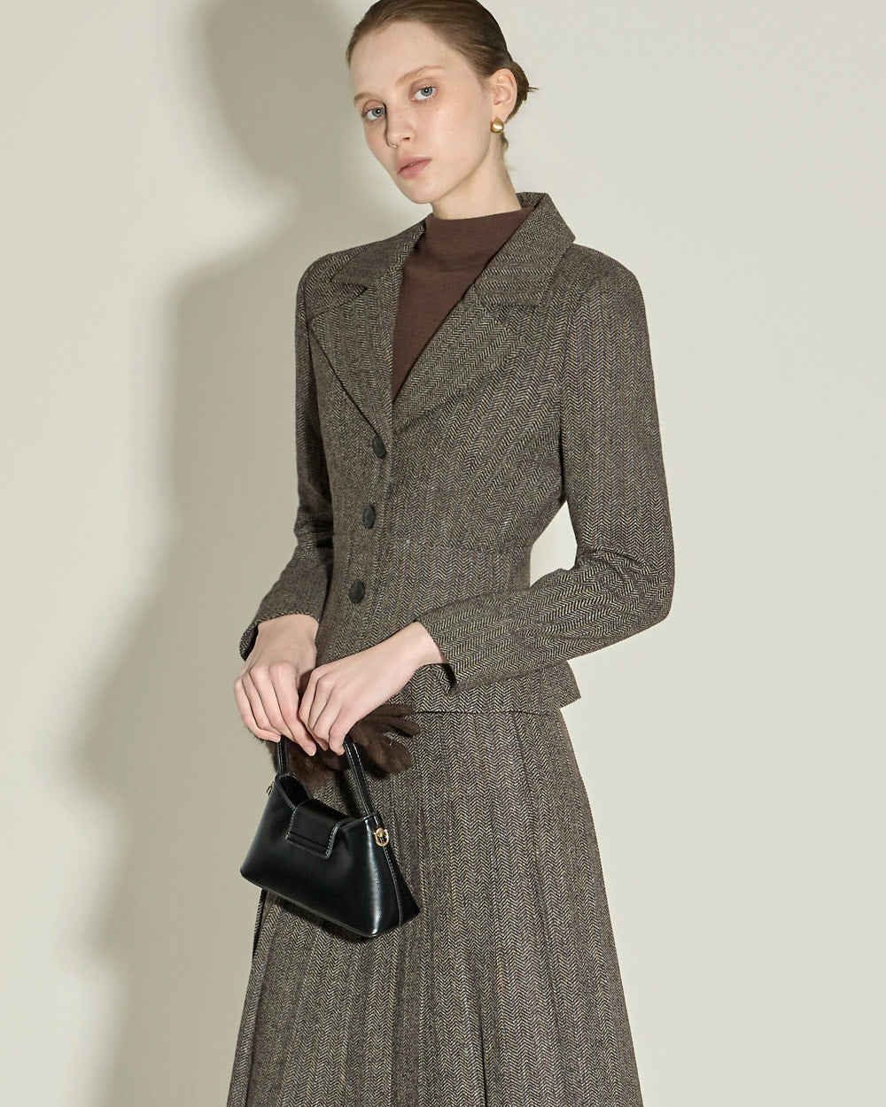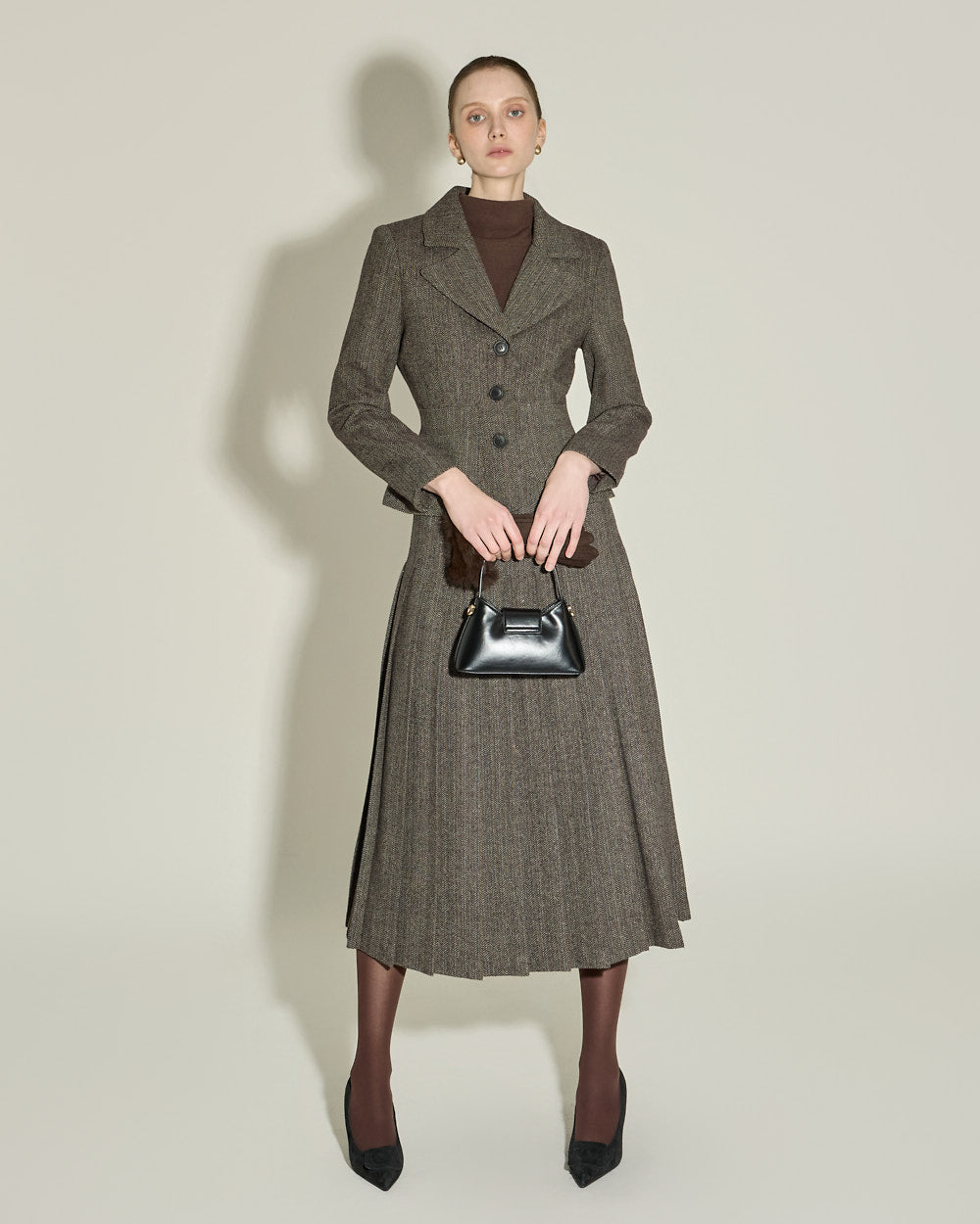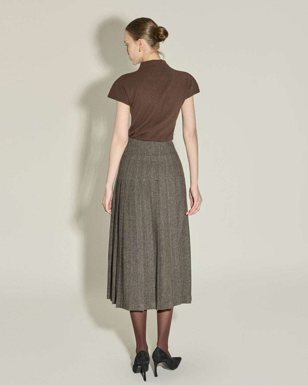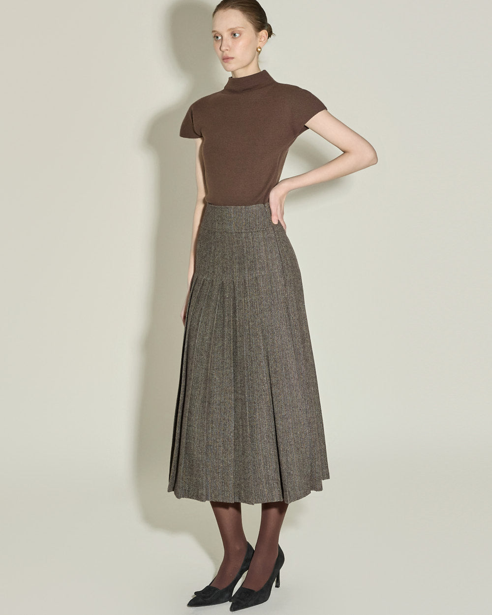 The semi-high neckline creates a sophisticated silhouette,