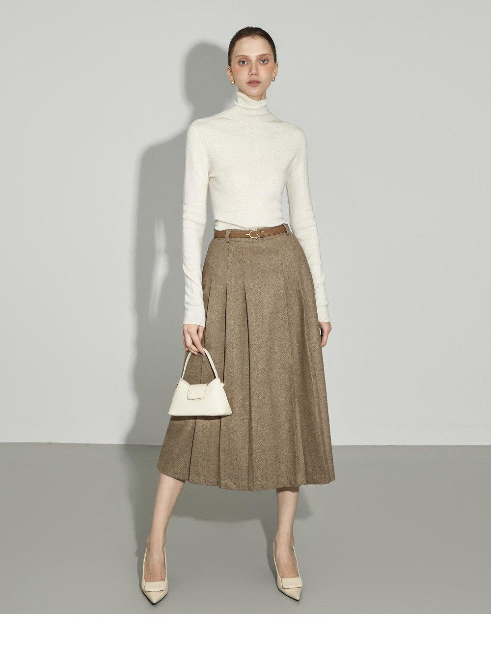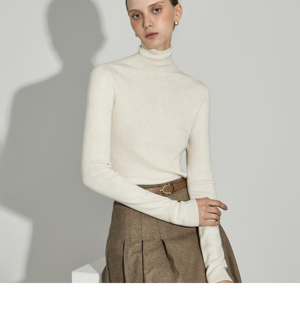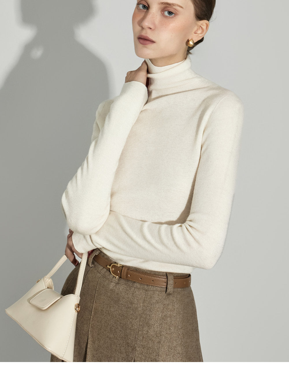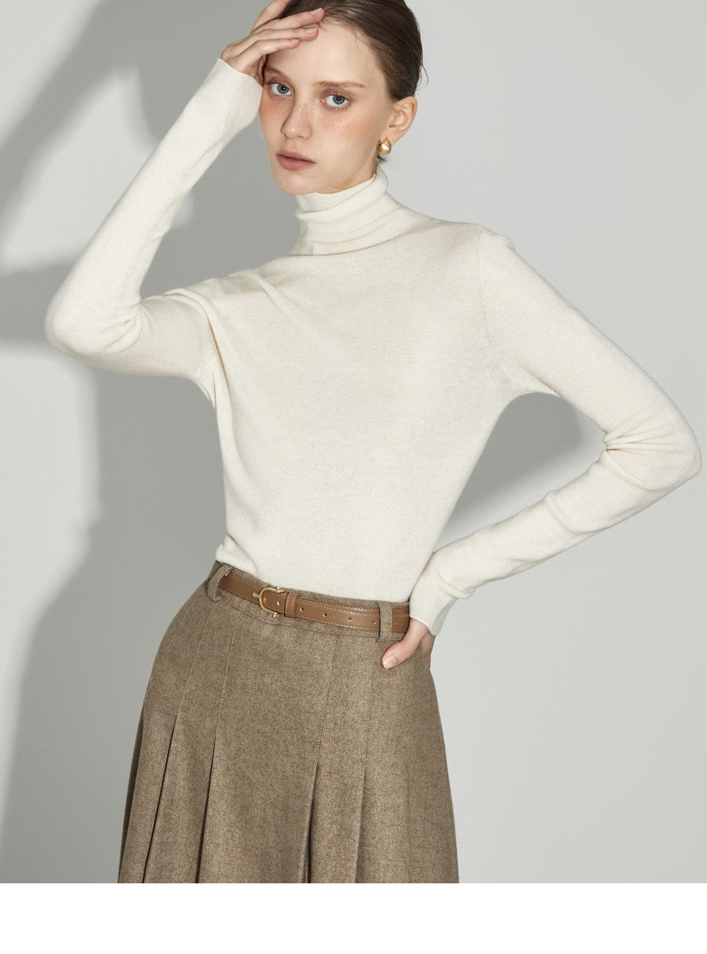 The slim fit and turtleneck design create a neat yet warm silhouette.