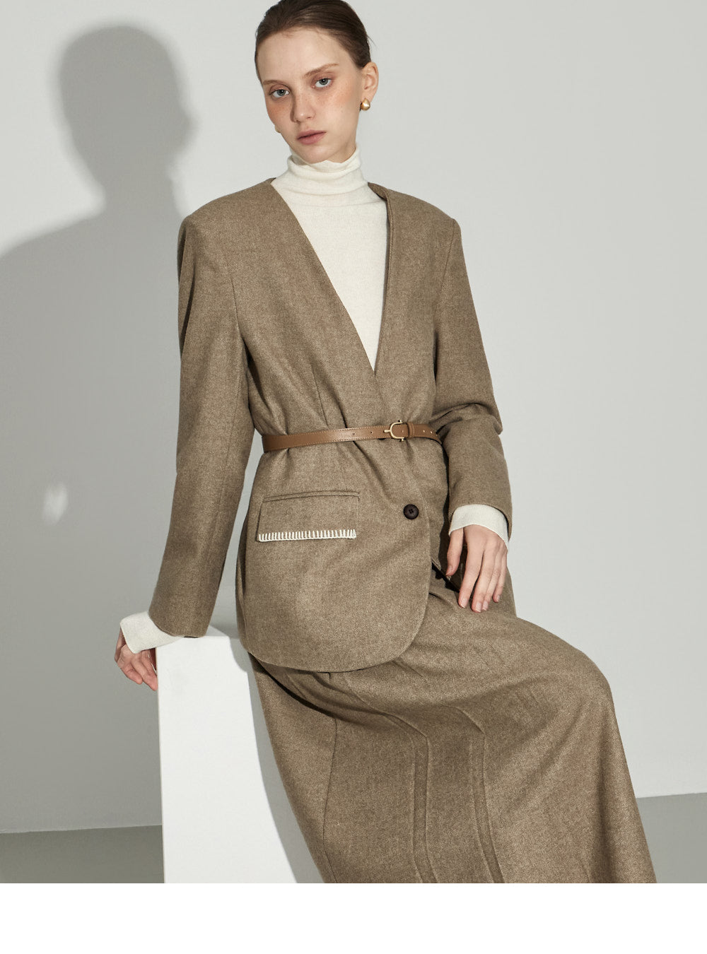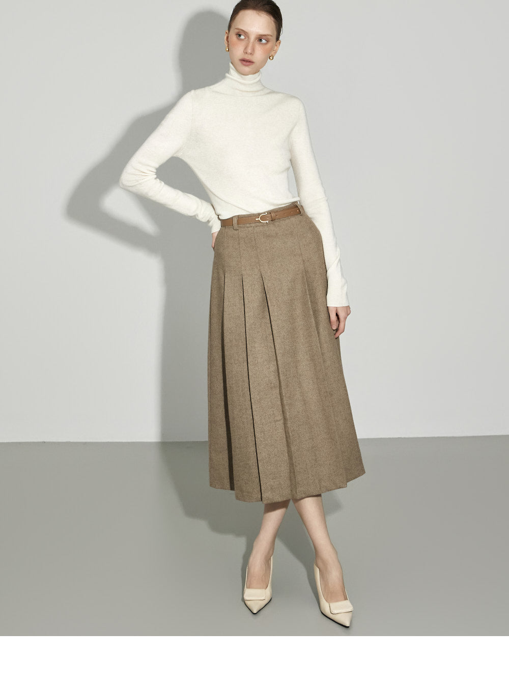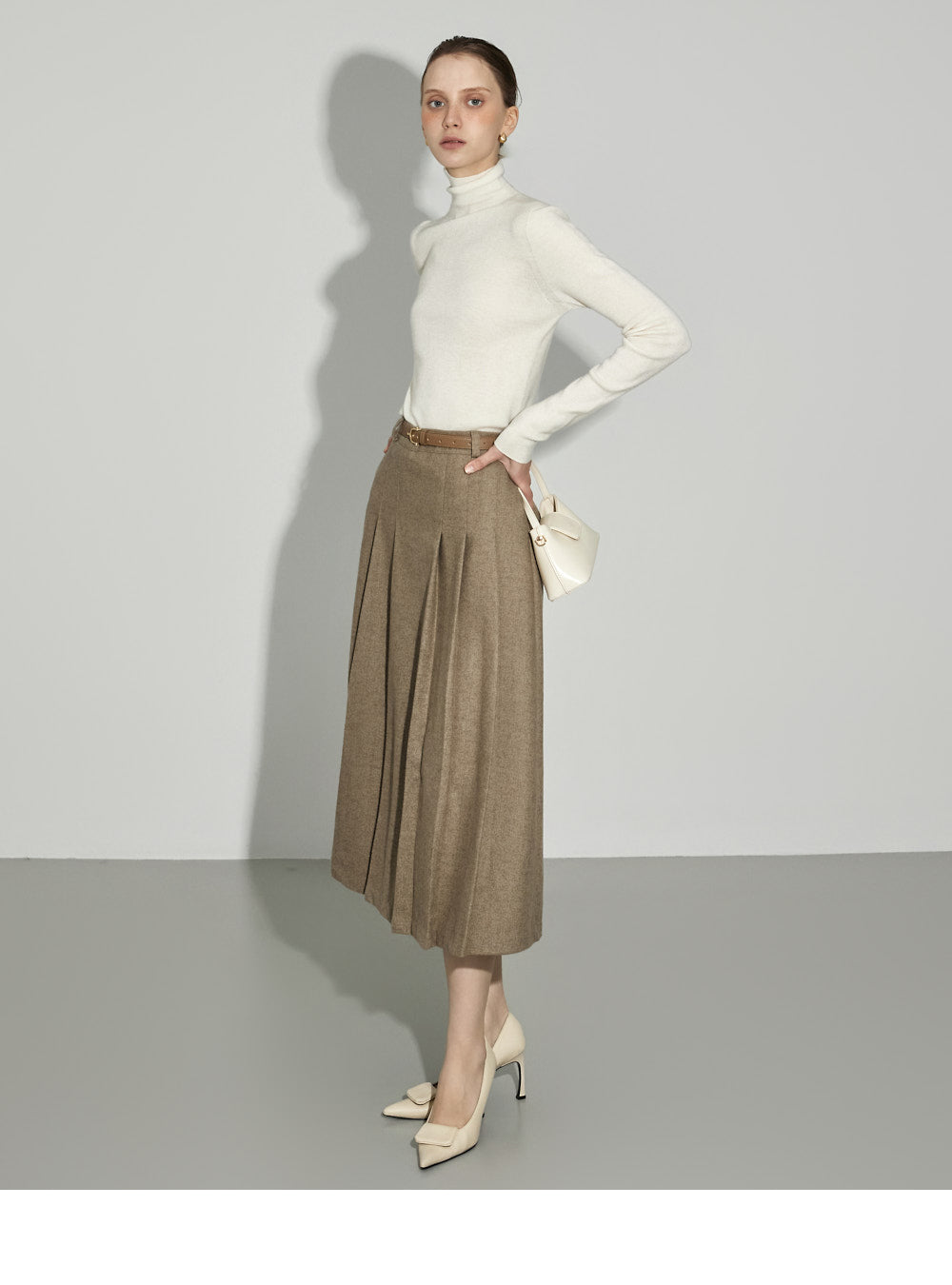 The slim fit and turtleneck design create a neat yet warm silhouette.