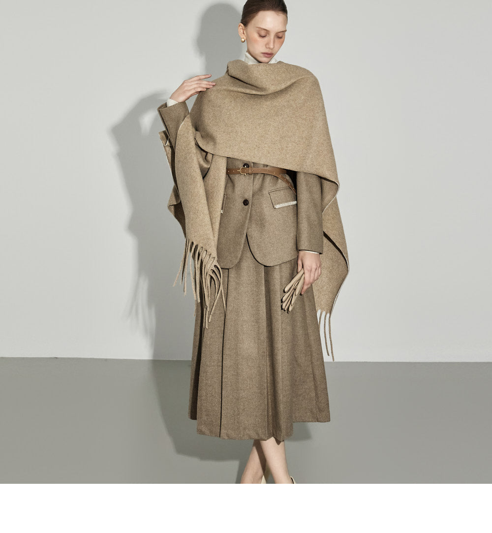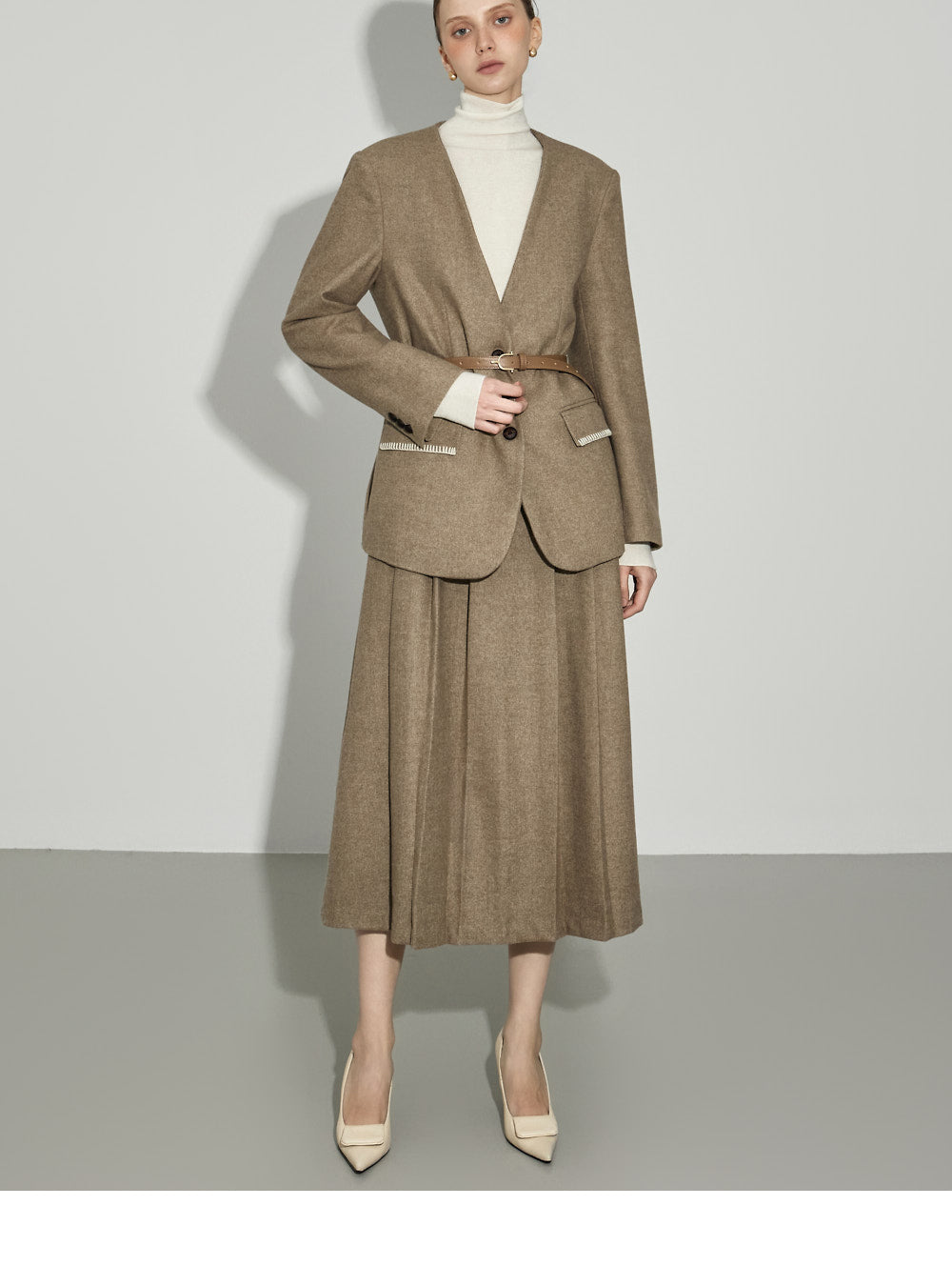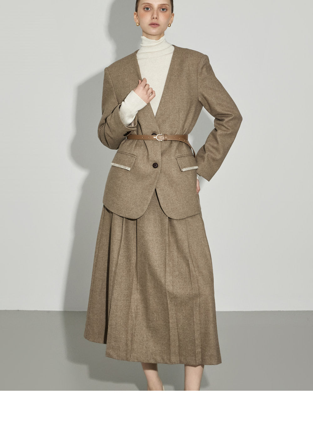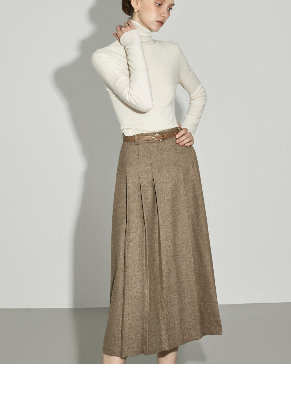 The slim fit and turtleneck design create a neat yet warm silhouette.