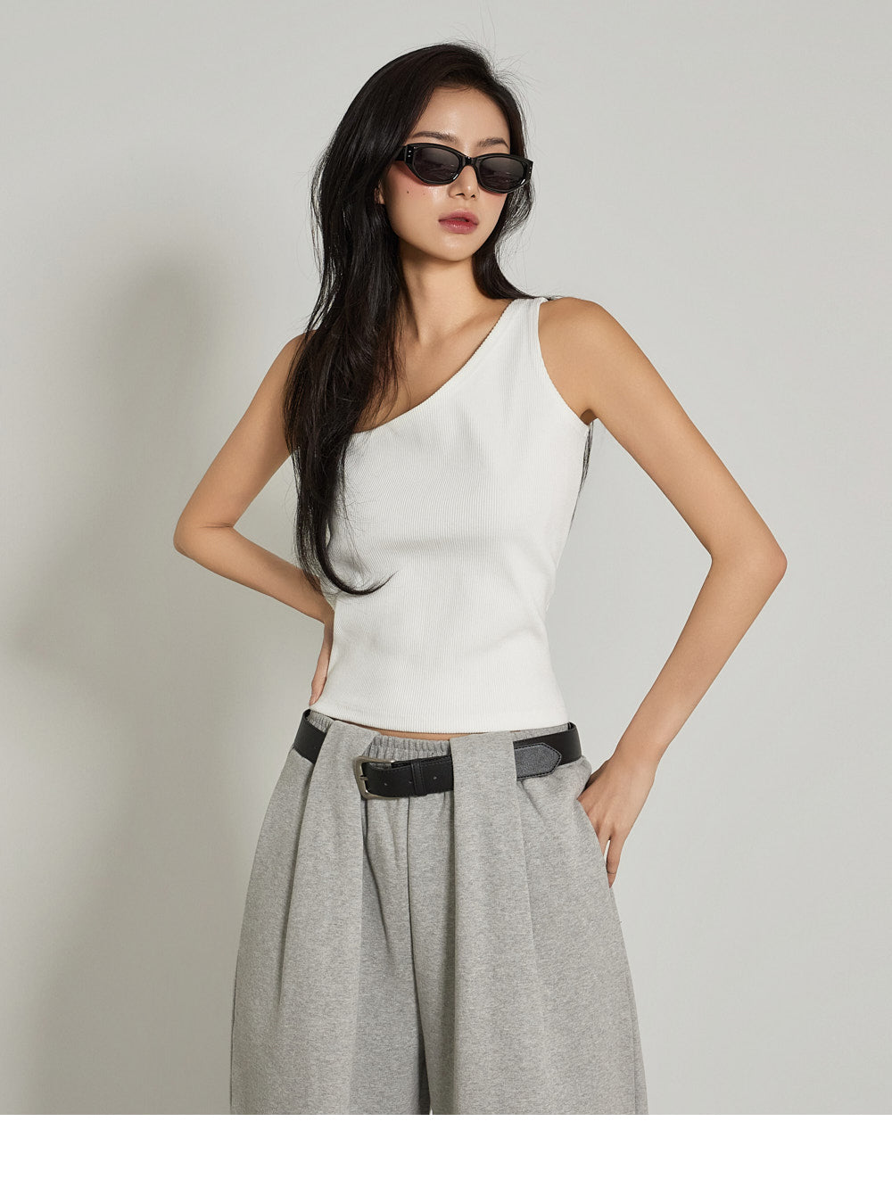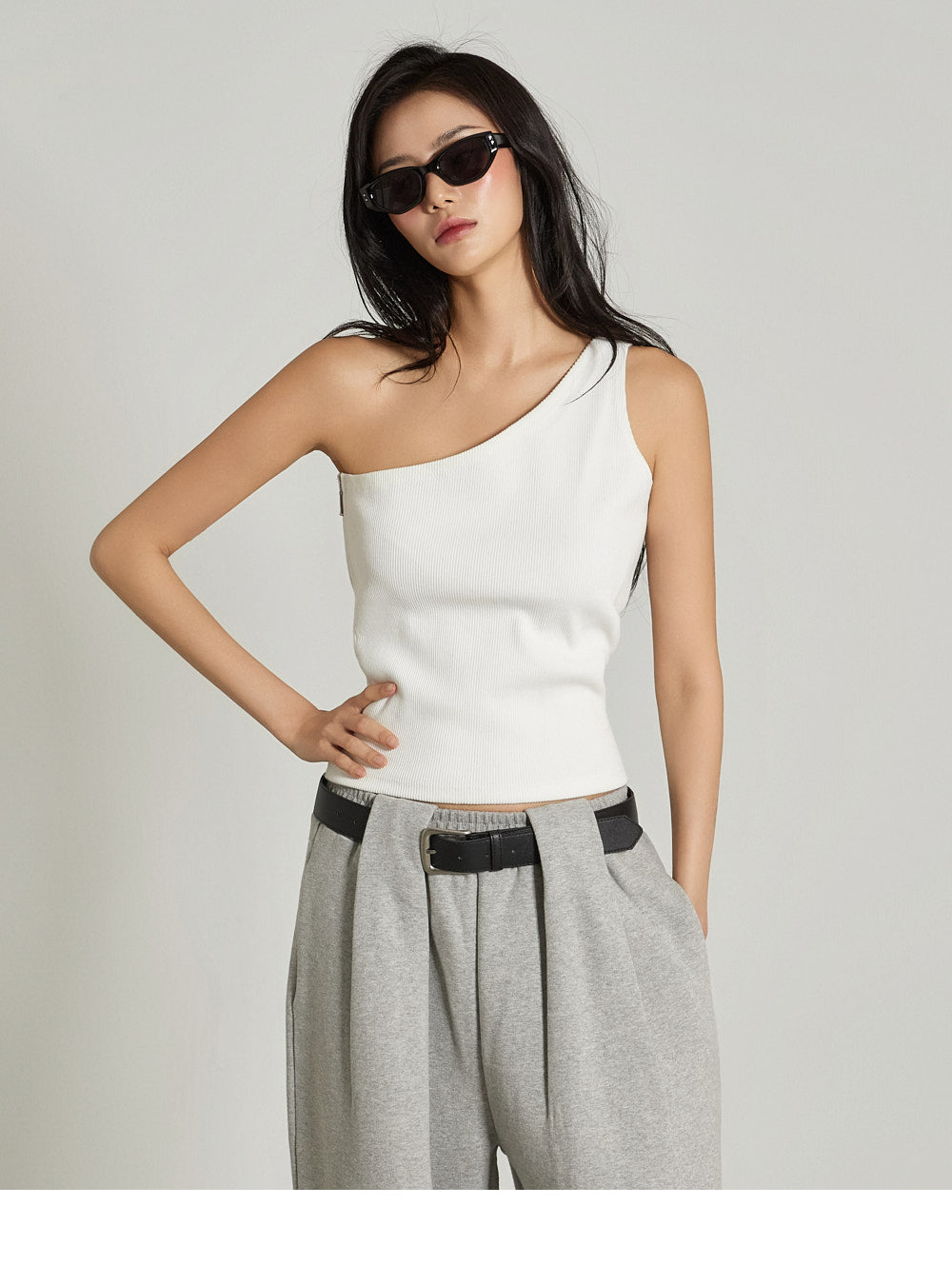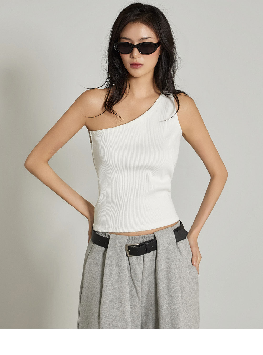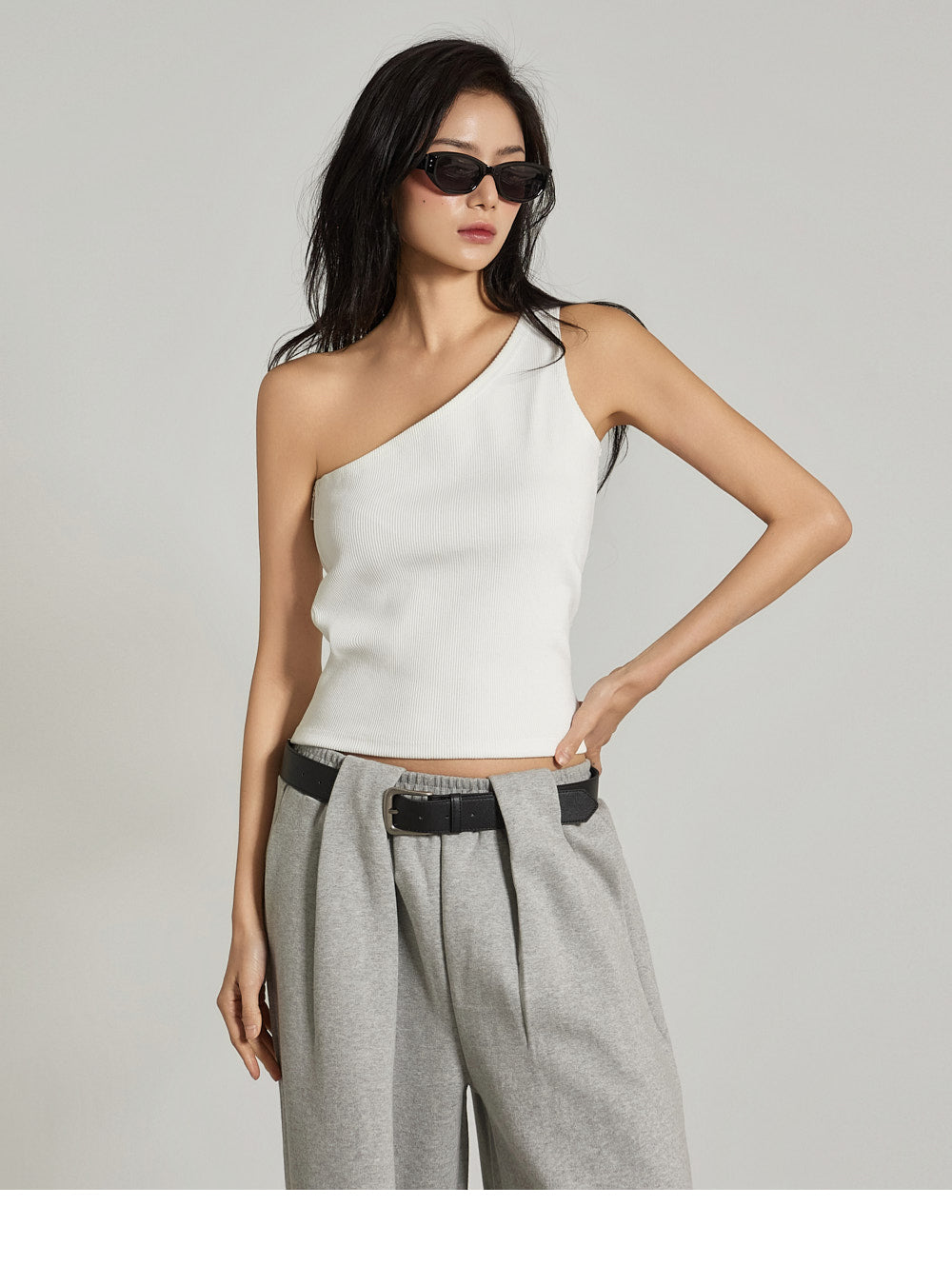The one-shoulder design and ribbed texture add a simple yet unique touch,