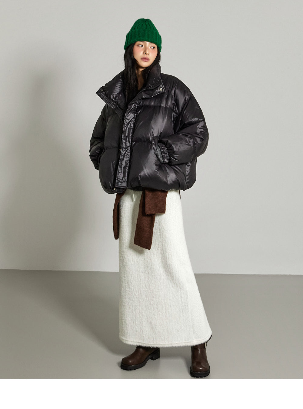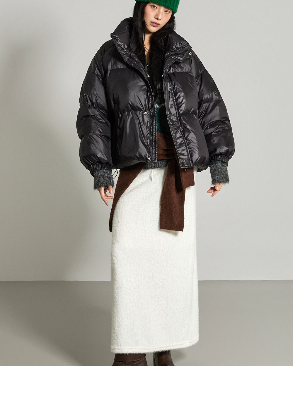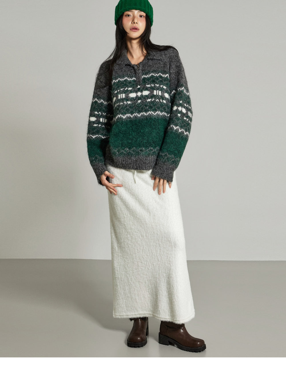 it features a cozy, hairy texture, and a loose fit for a relaxed silhouette.