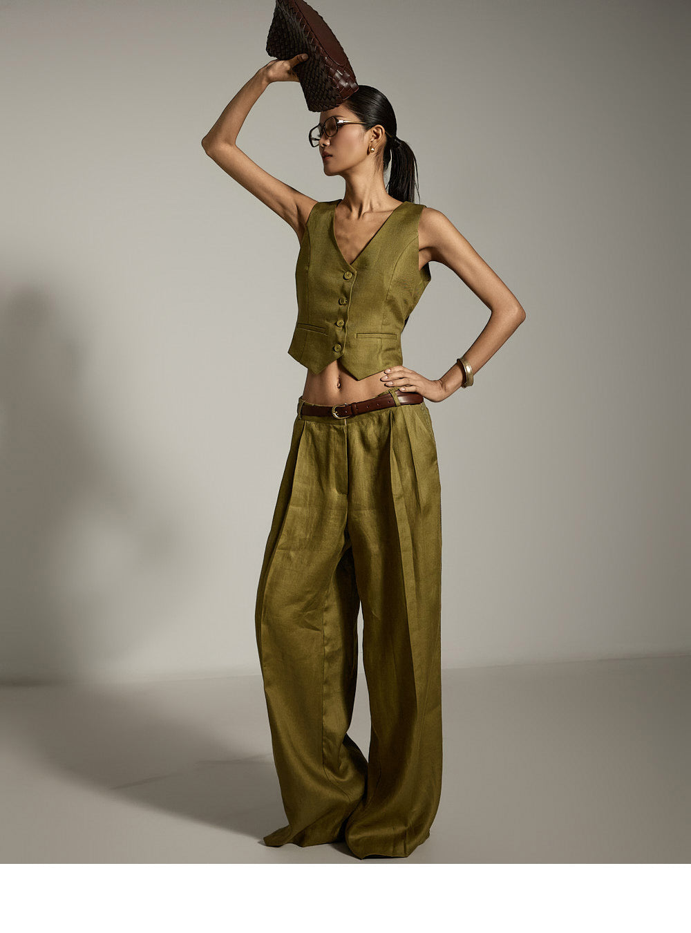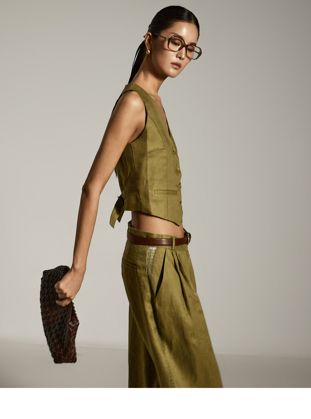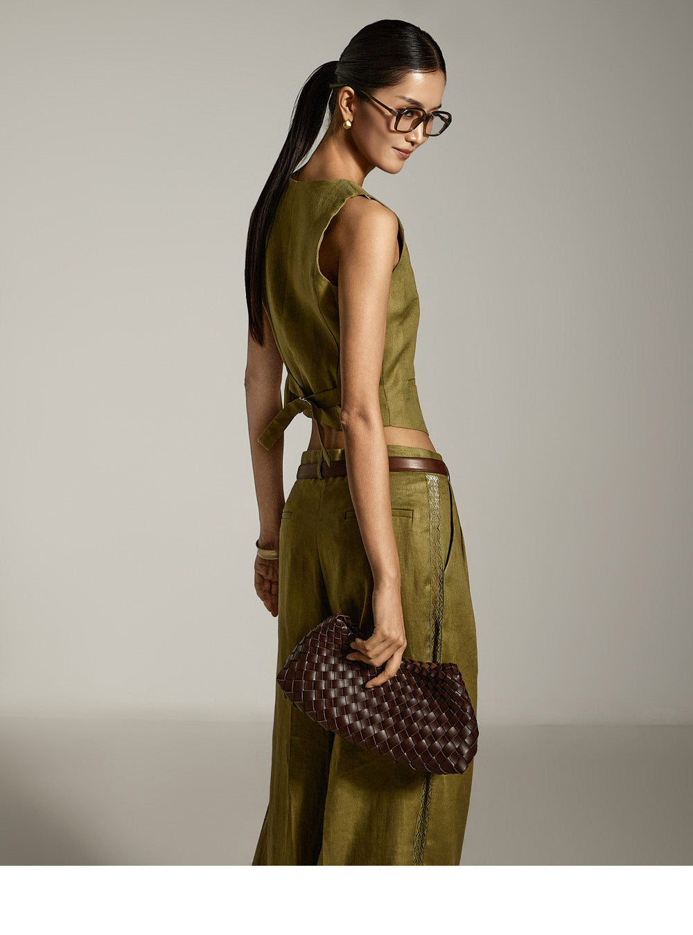 The model is 173cm tall and is wearing ONE size in KHAKI.