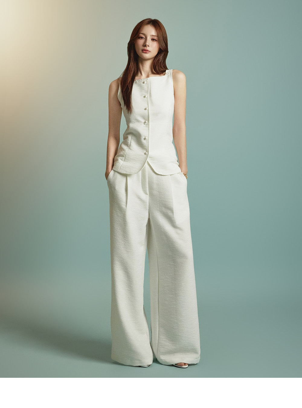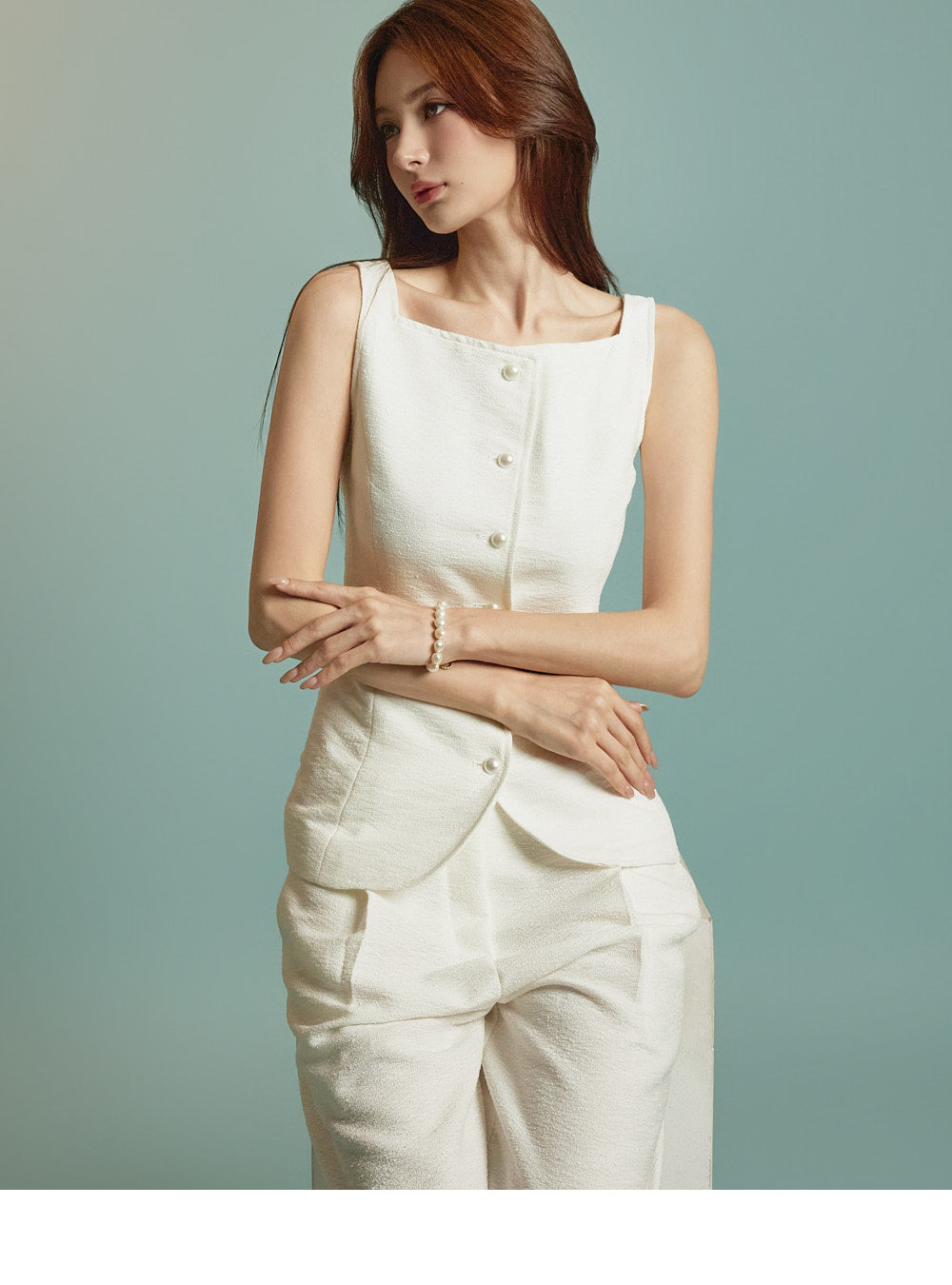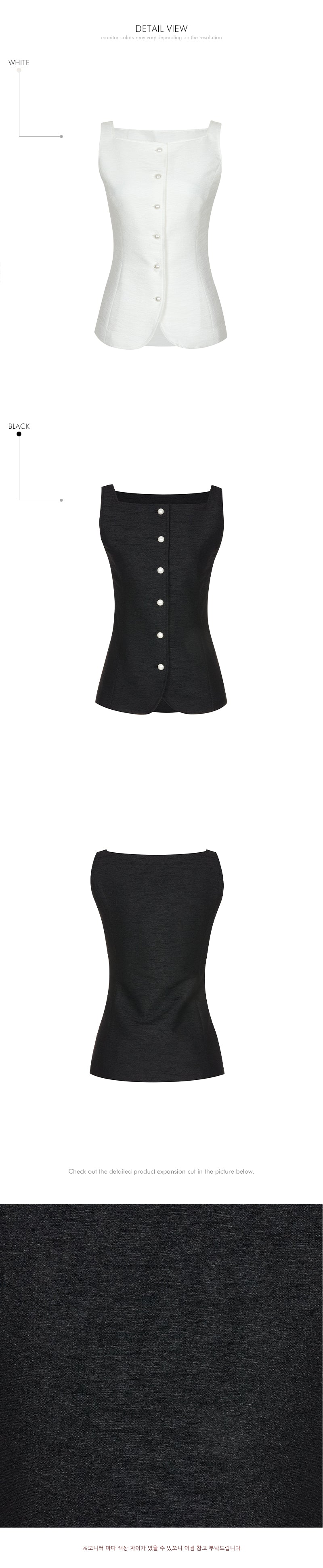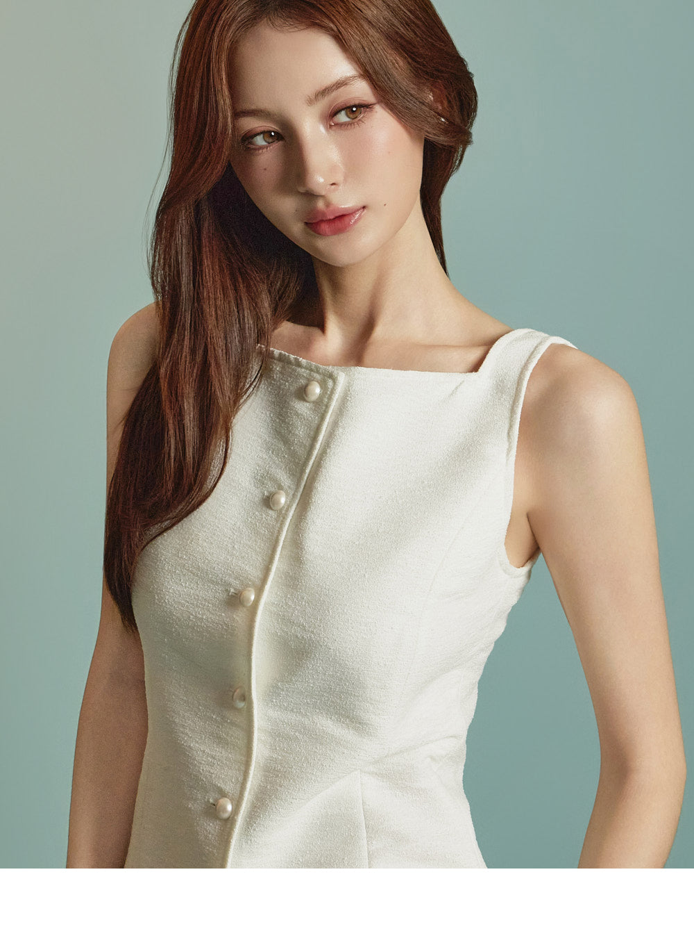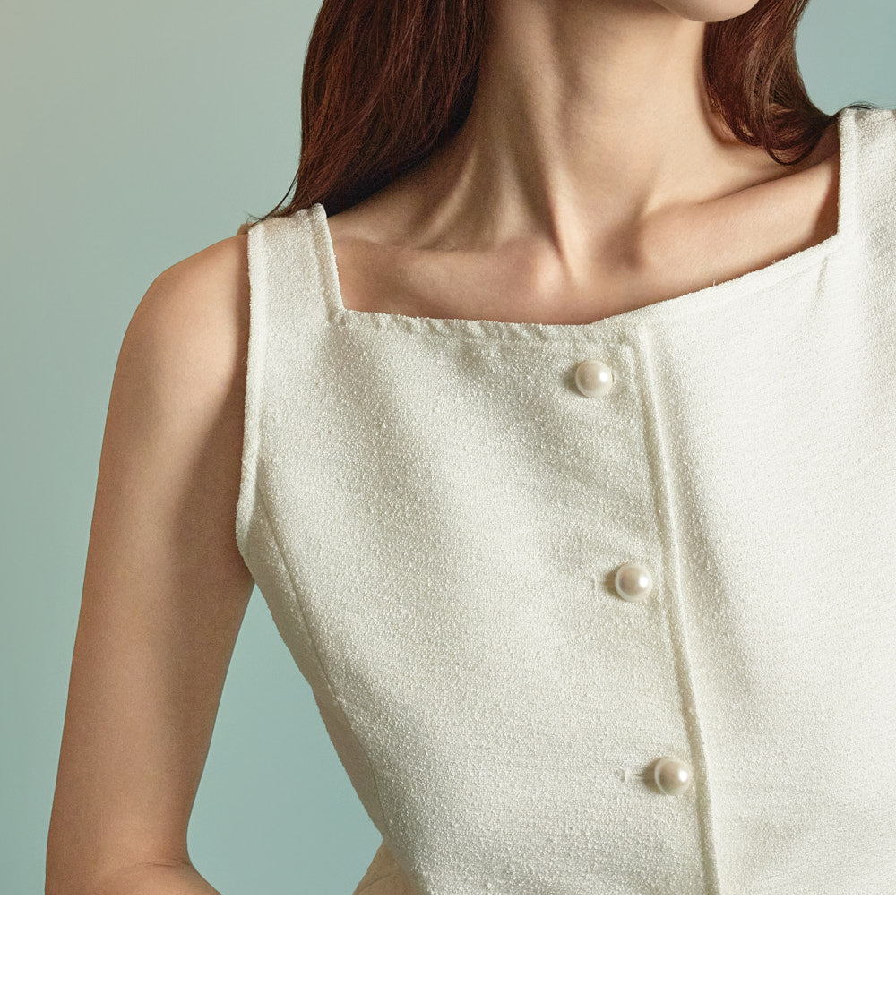 The sleeveless square-neck design highlights the neckline and shoulders,