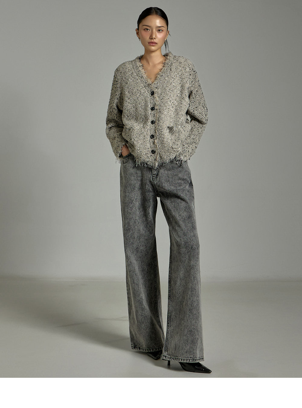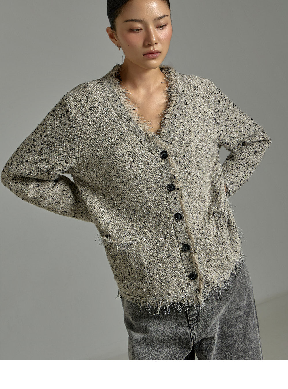 The cardigan features a front button closure and pockets on both sides for added practicality,