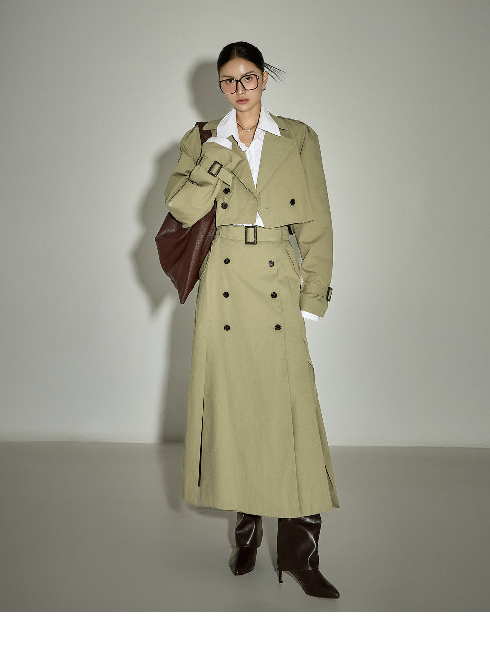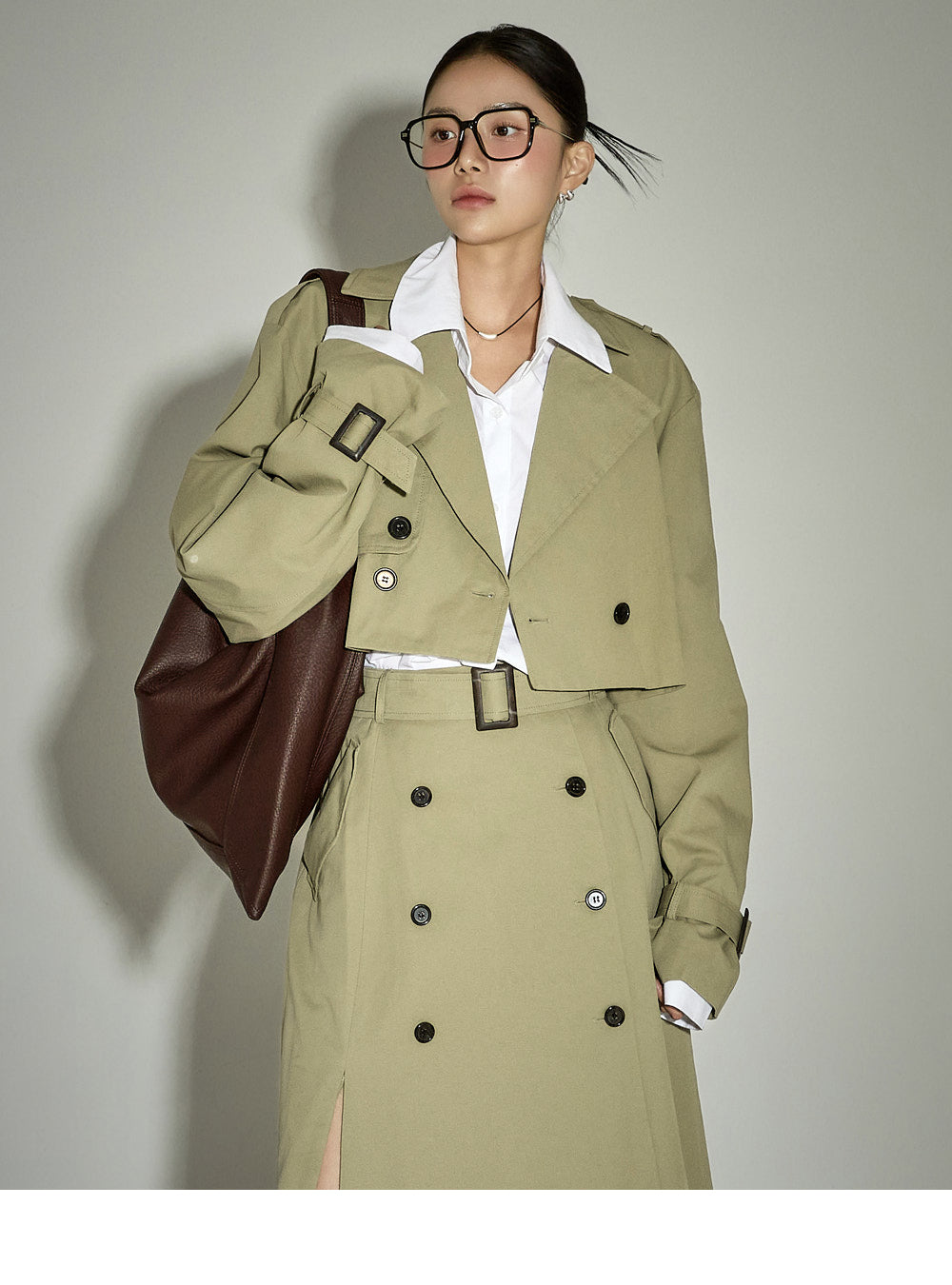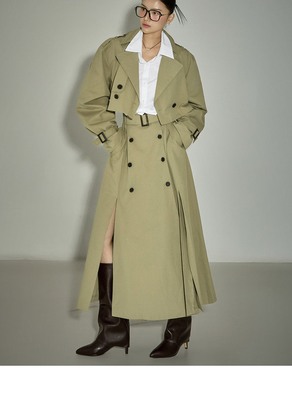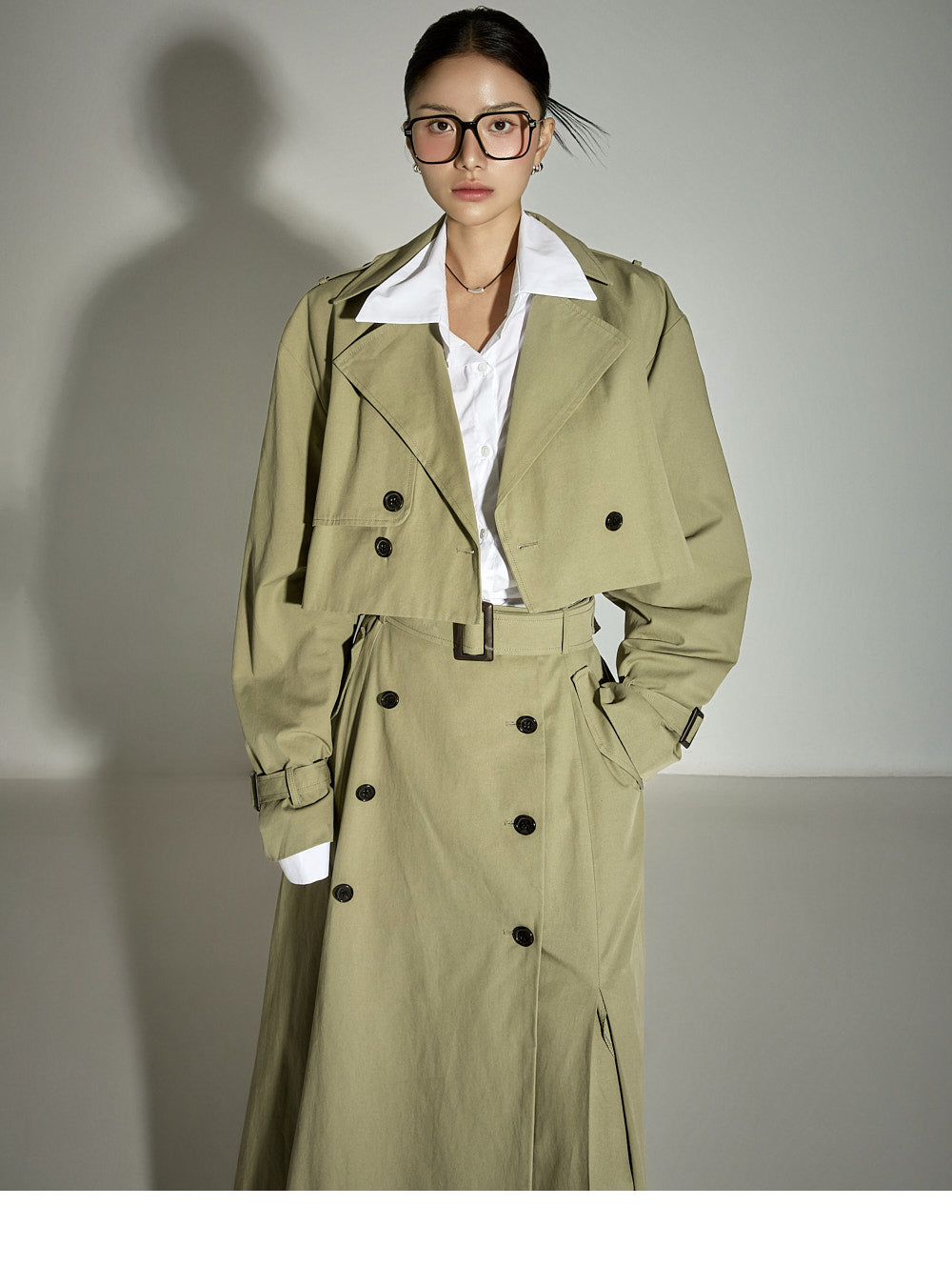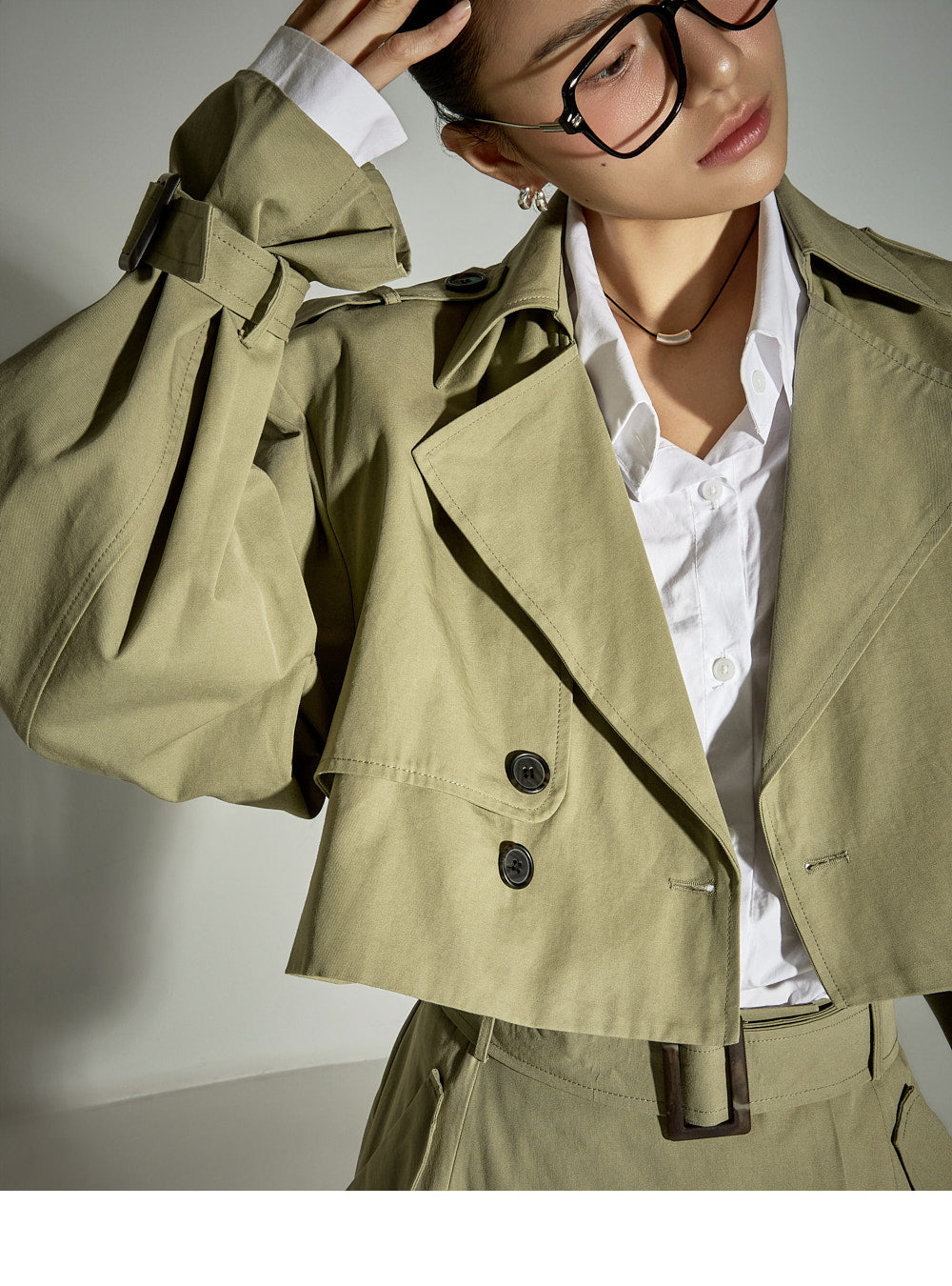 This cropped trench coat has a casual vibe.
