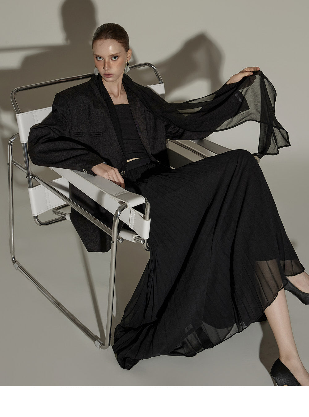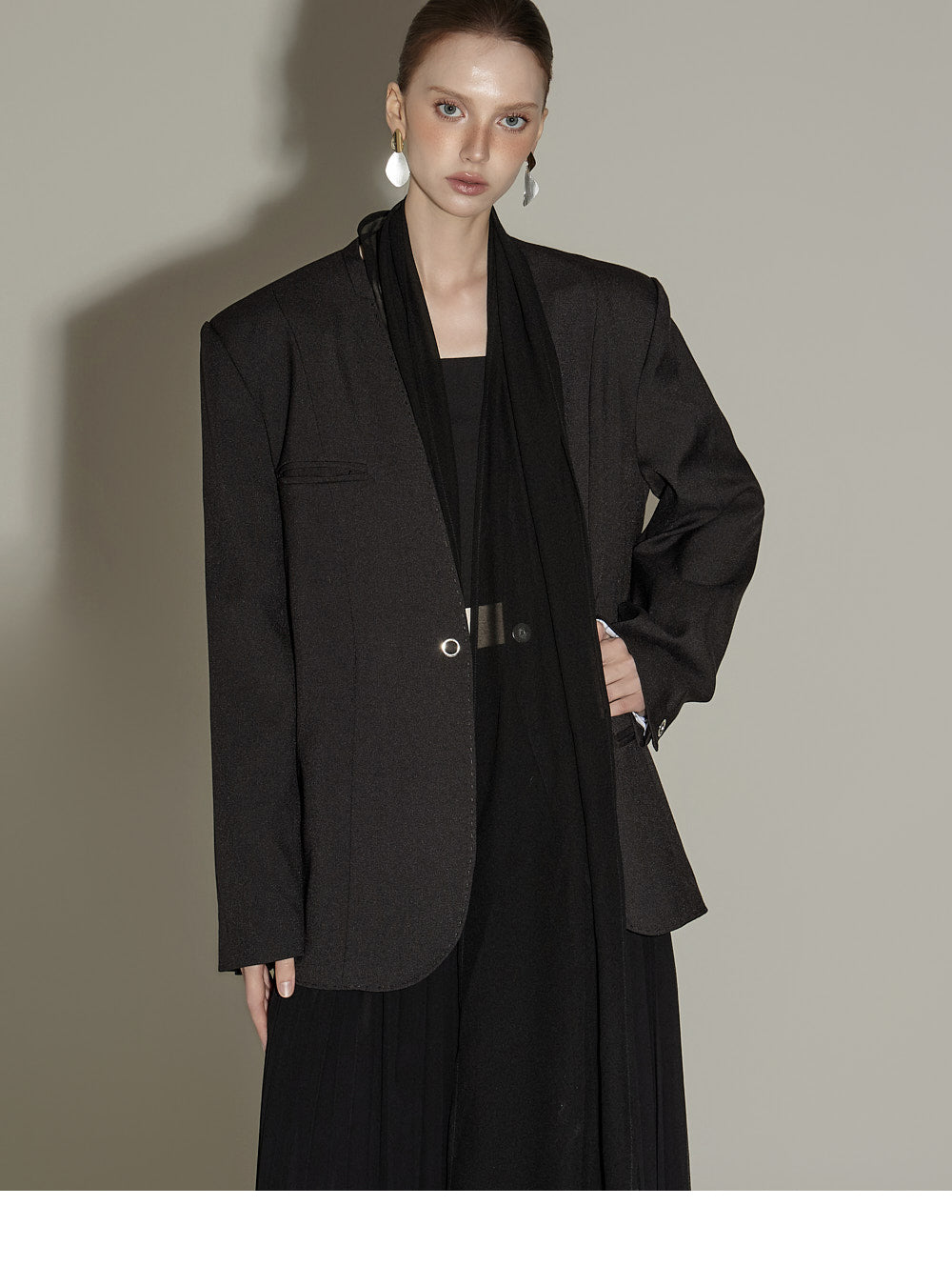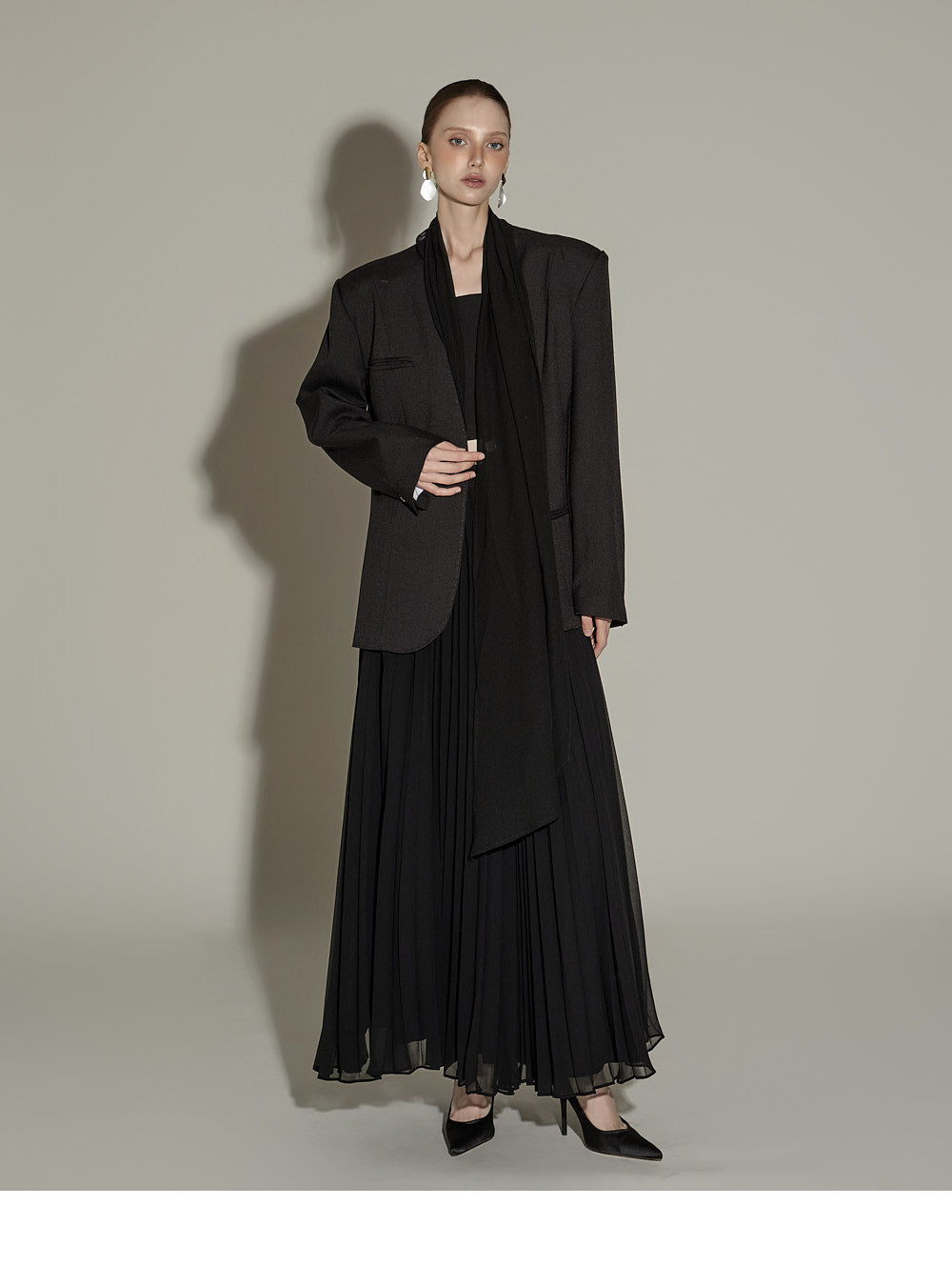 The sheer, detachable scarf detail allows for a variety of styling possibilities,
