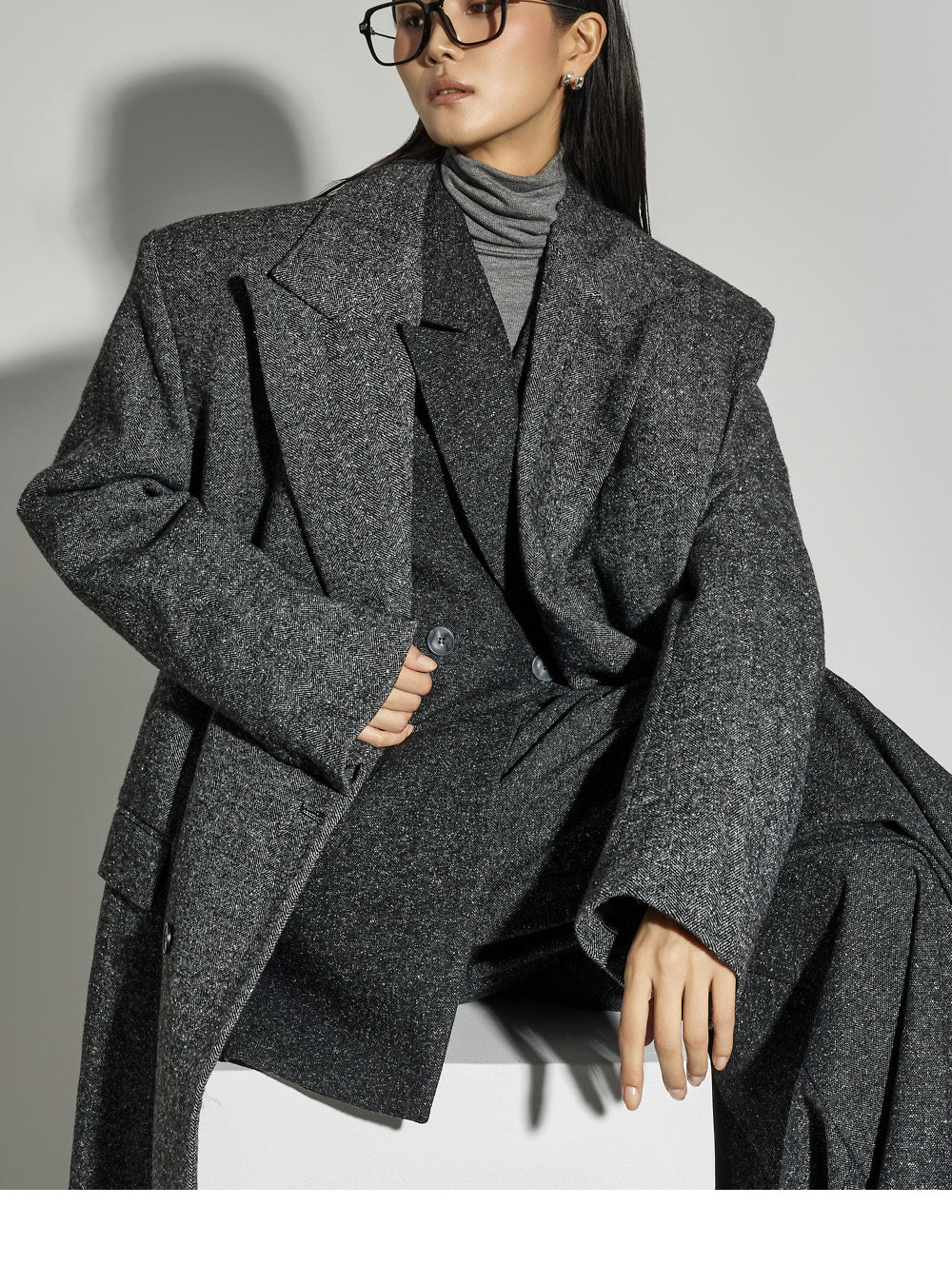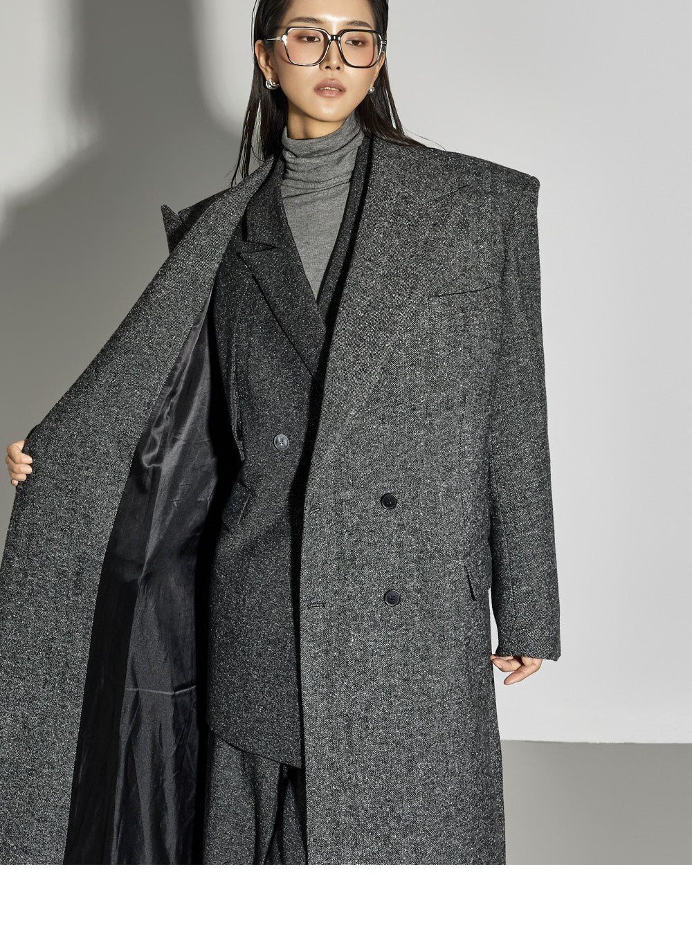 This coat exudes a mannish vibe.