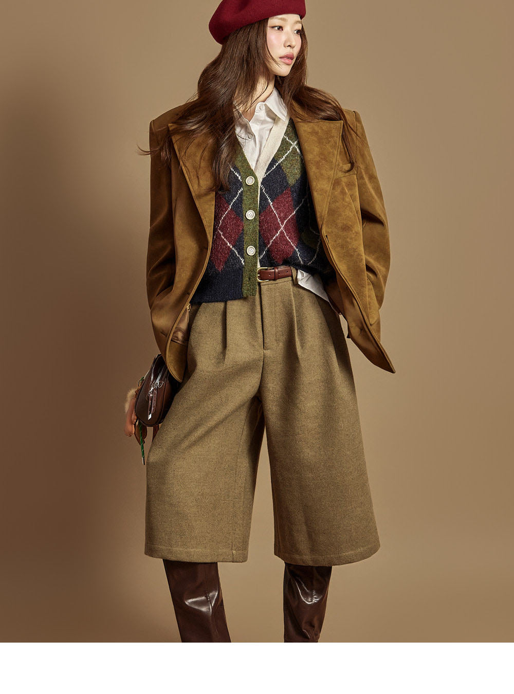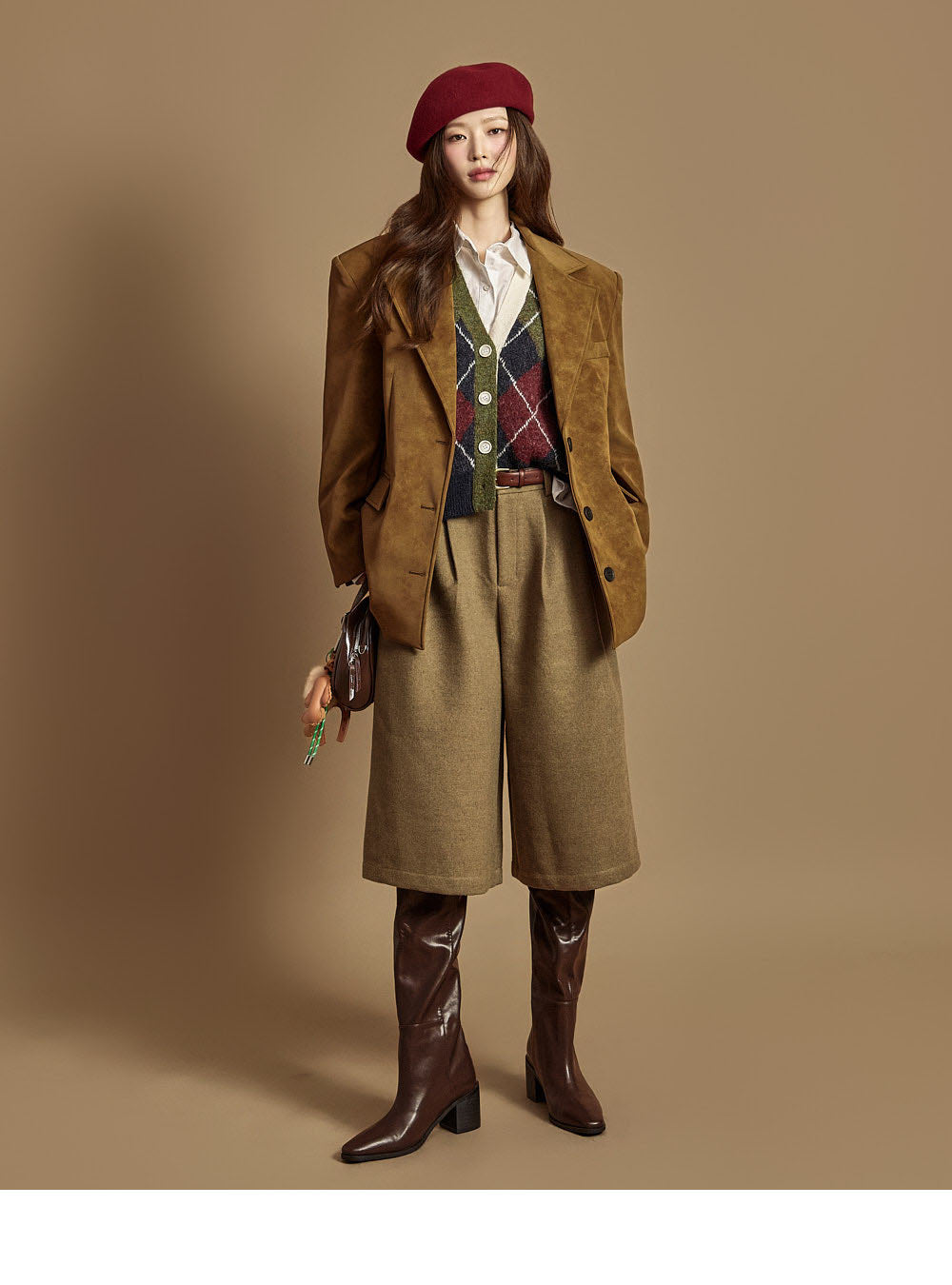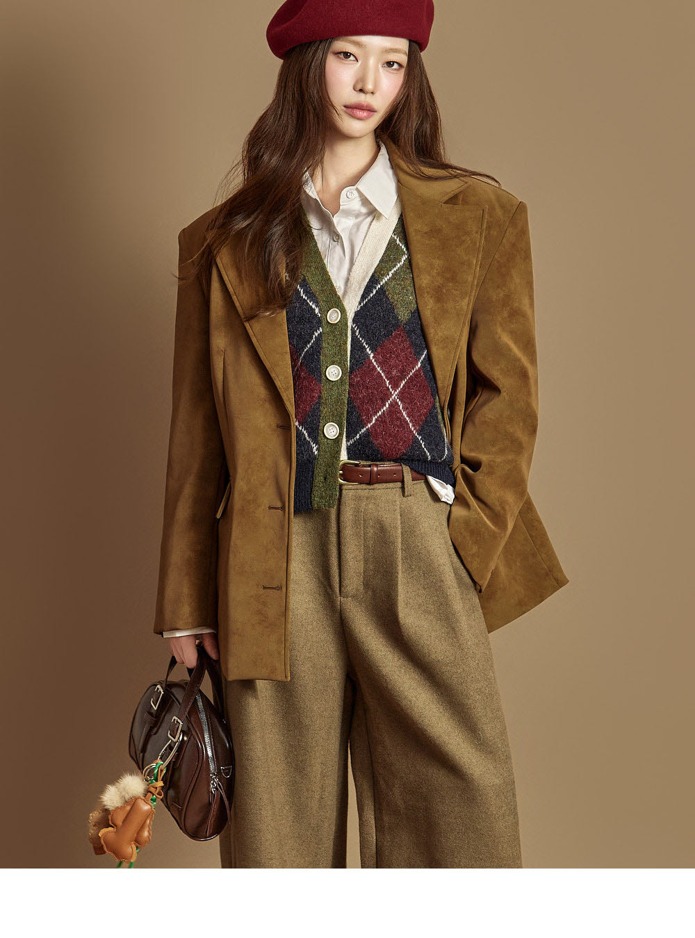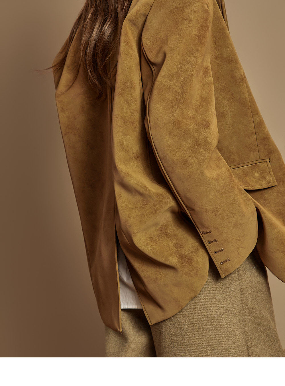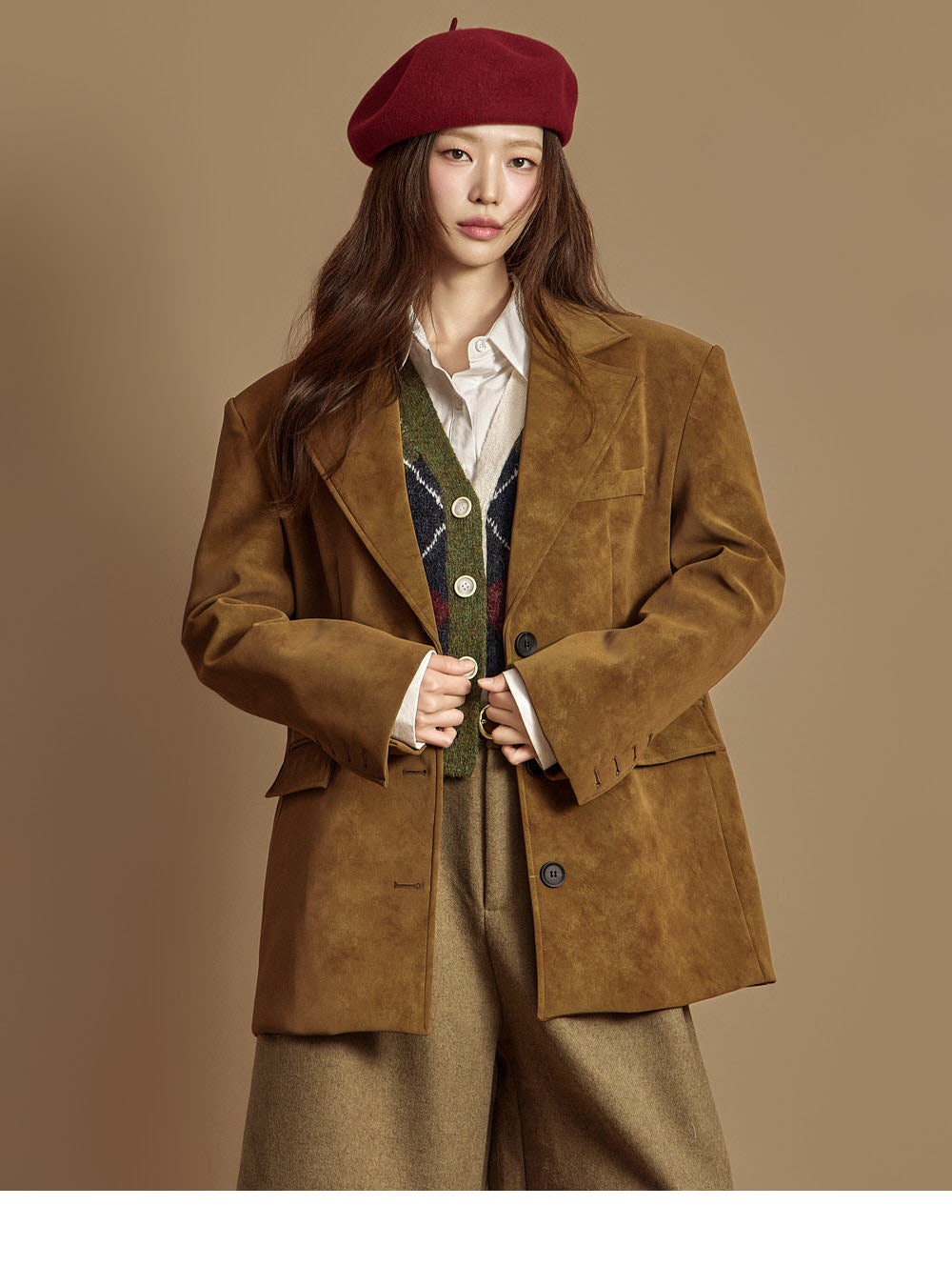 The oversized silhouette and moderate shoulder padding create a structured fit,