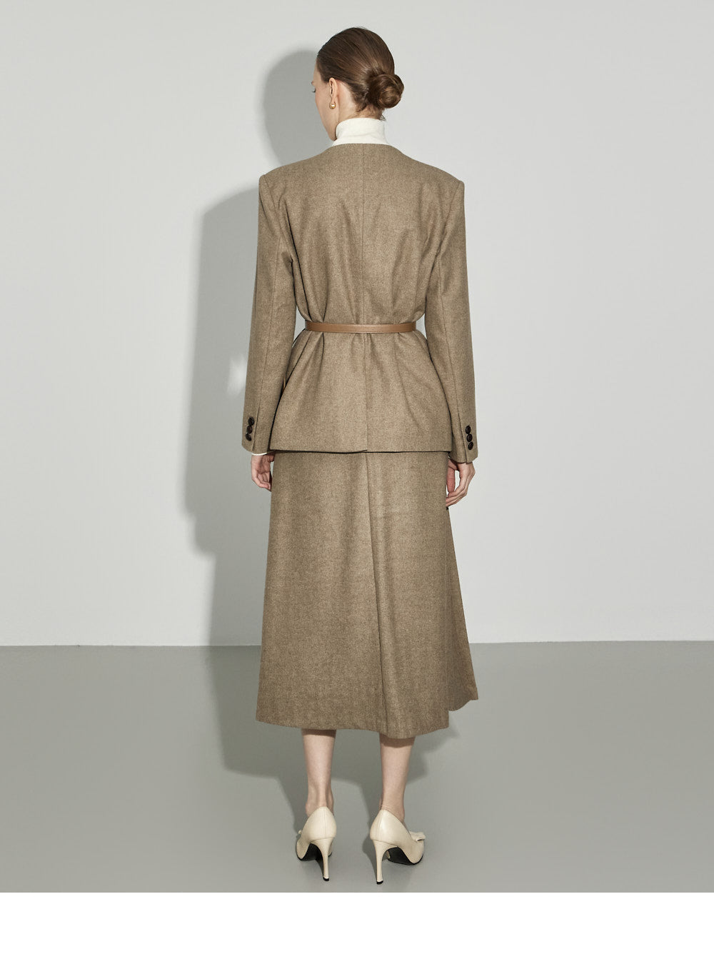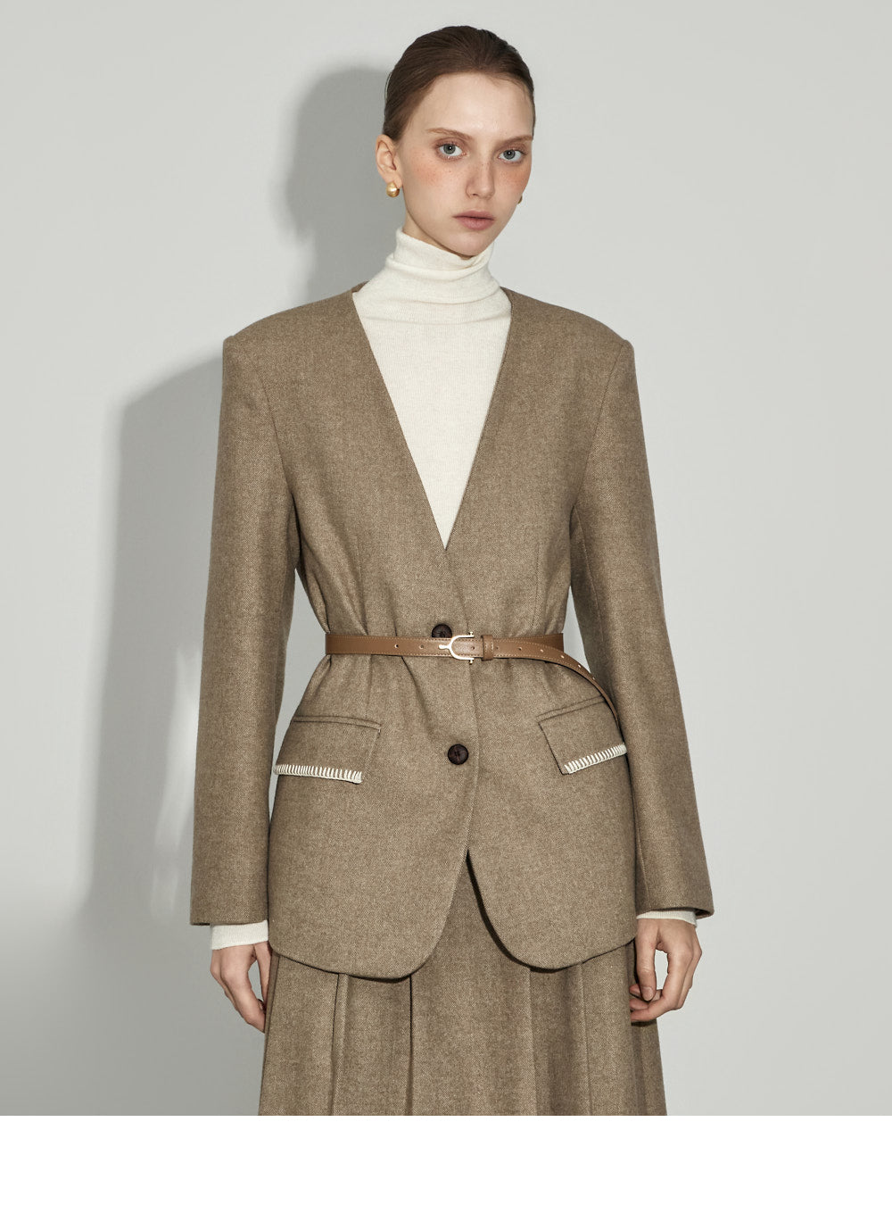 This no-collar herringbone jacket exudes a classic vibe.