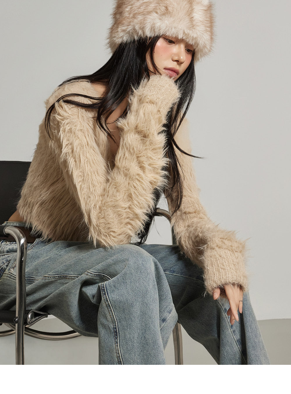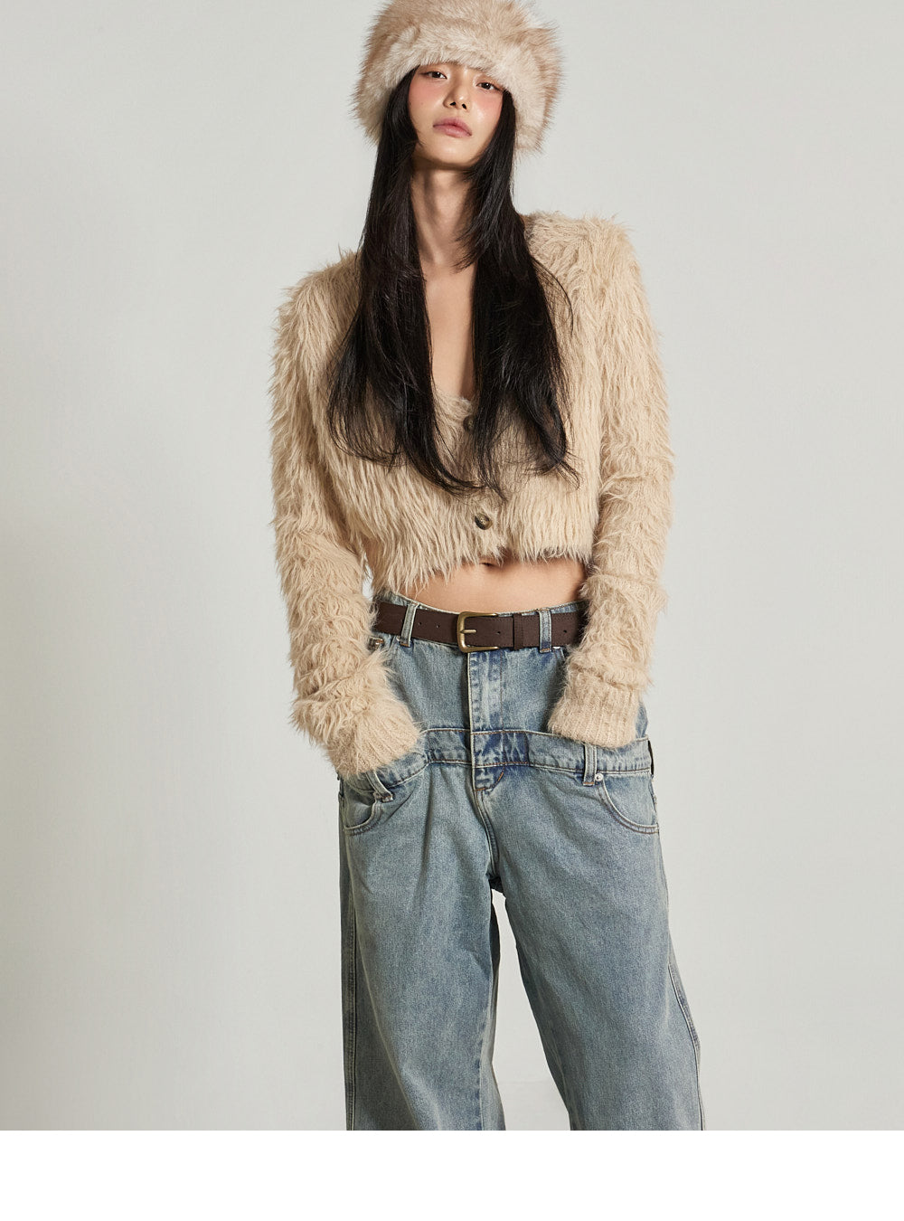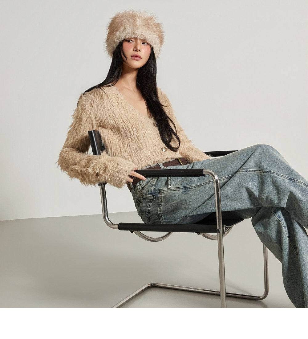 This fur crop cardigan exudes a casual vibe.