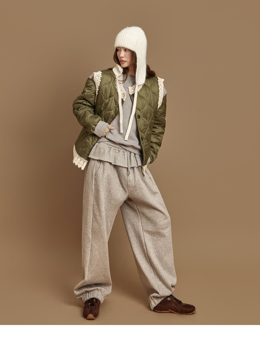 The 171cm model is wearing size ONE in the KHAKI color.