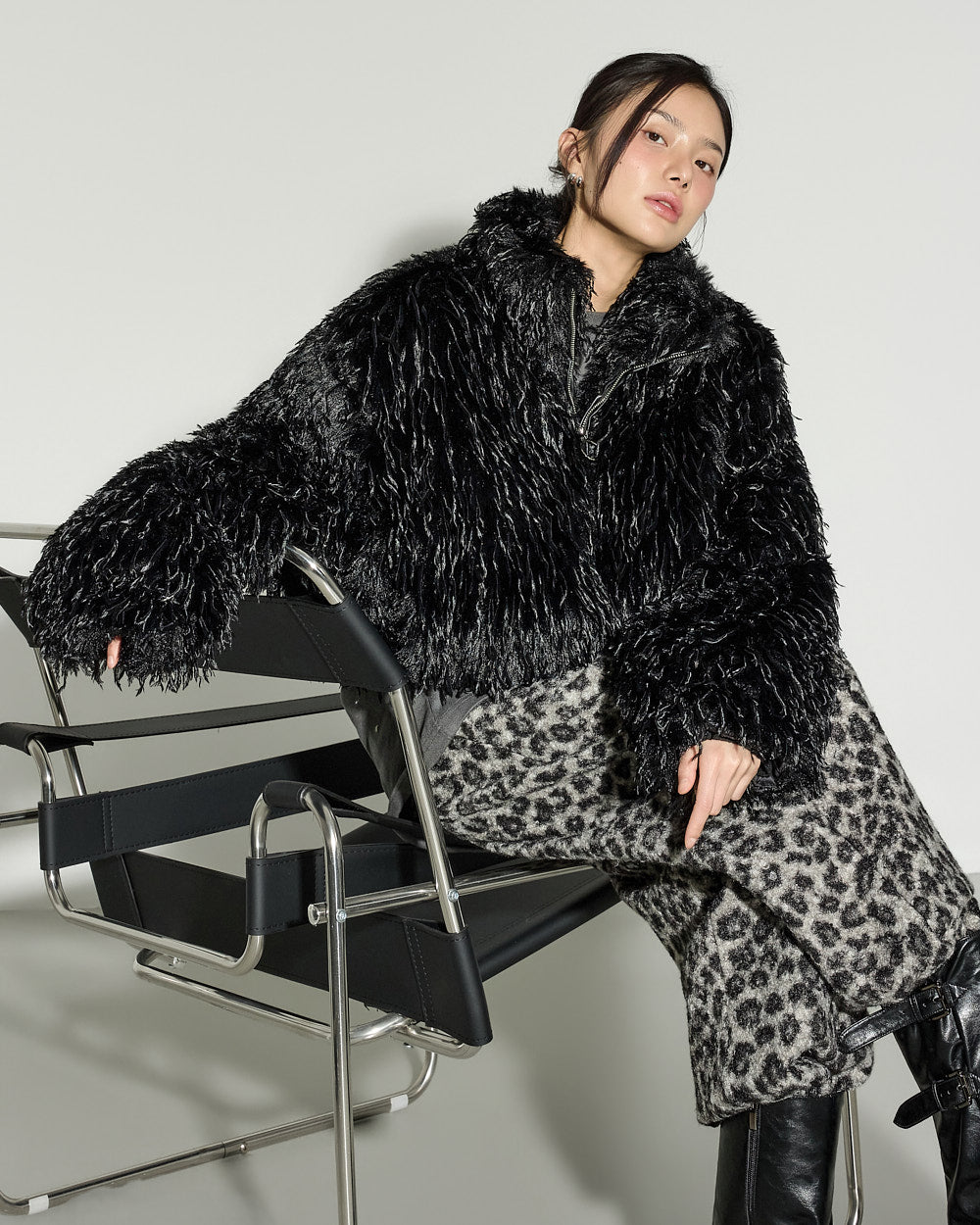 and the feather-like fur material adds a touch of flair to this outerwear.