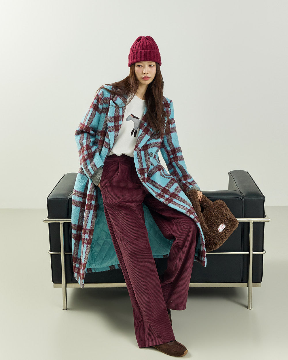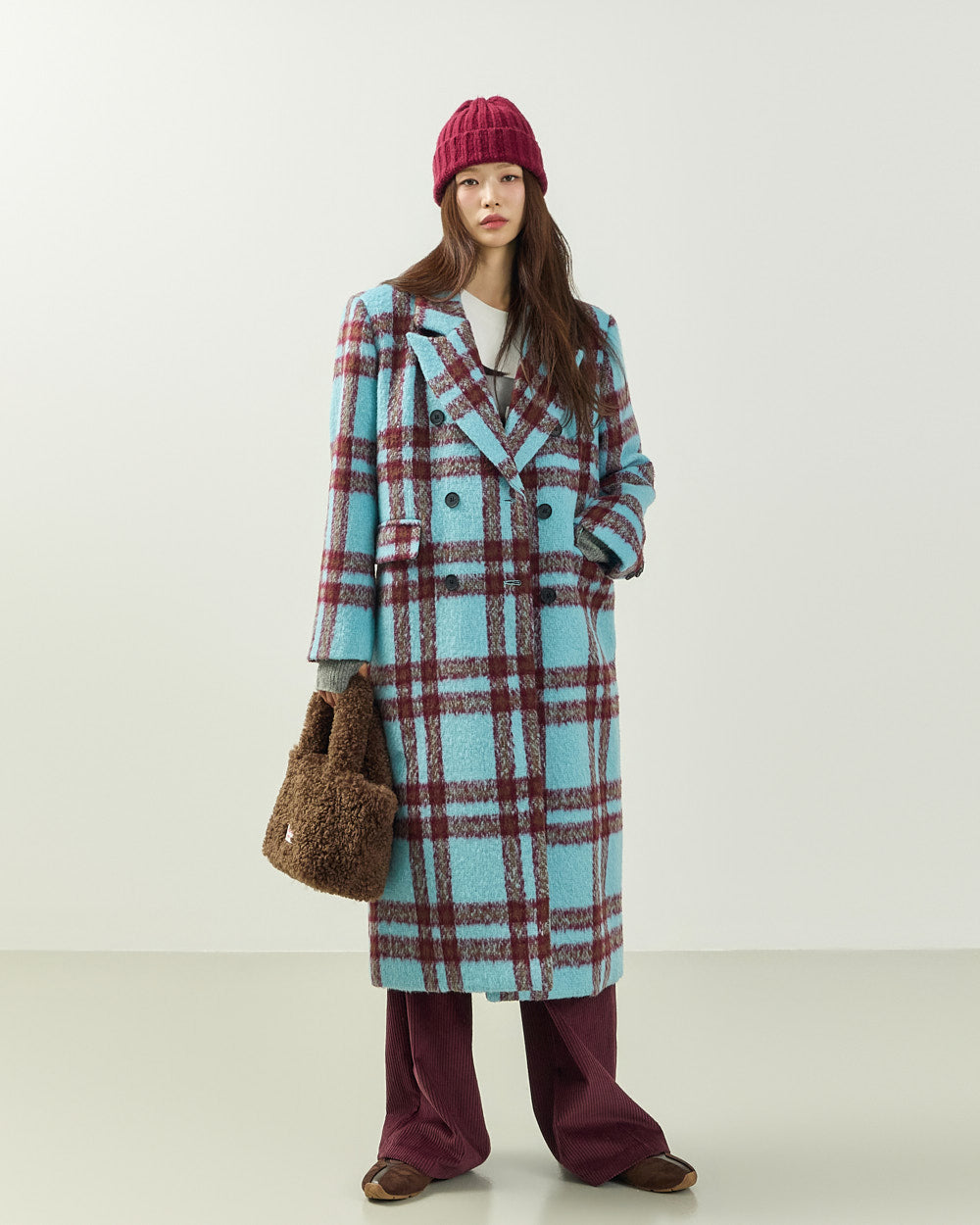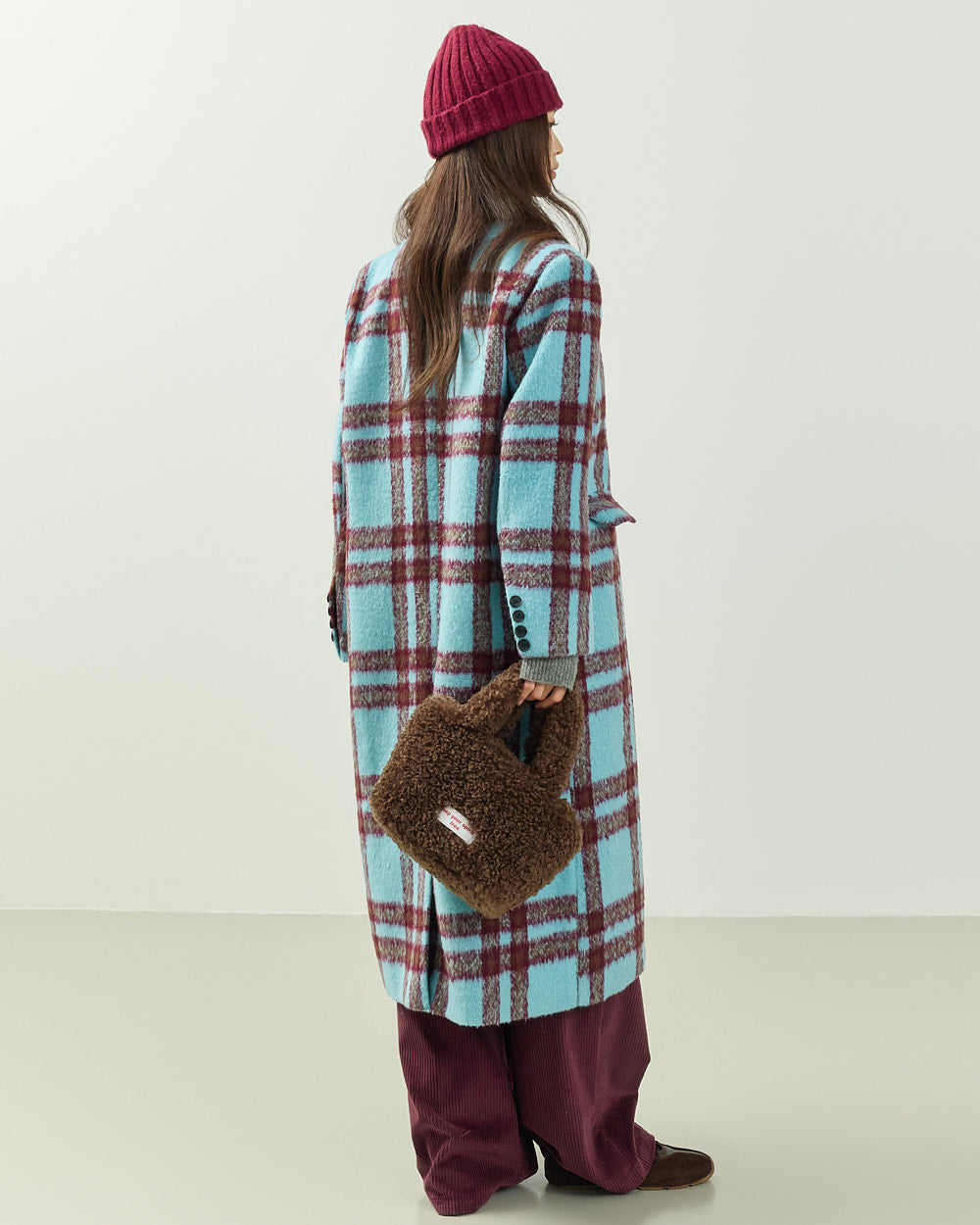 This casual mohair check long coat is perfect for both date nights and casual looks.