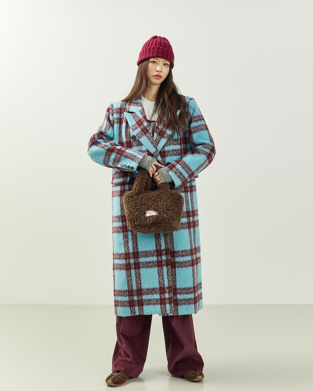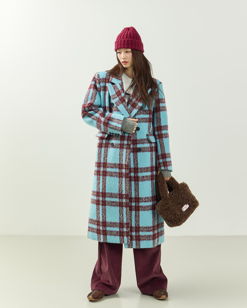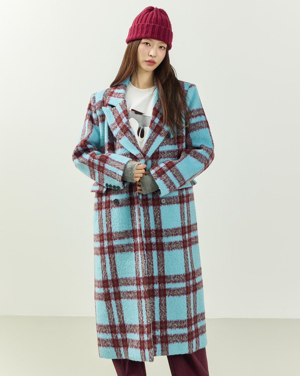 This casual mohair check long coat is perfect for both date nights and casual looks.