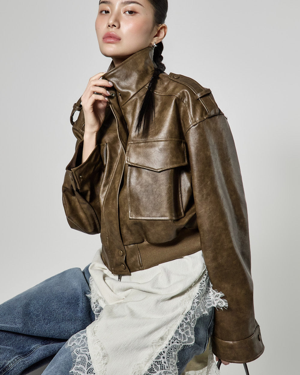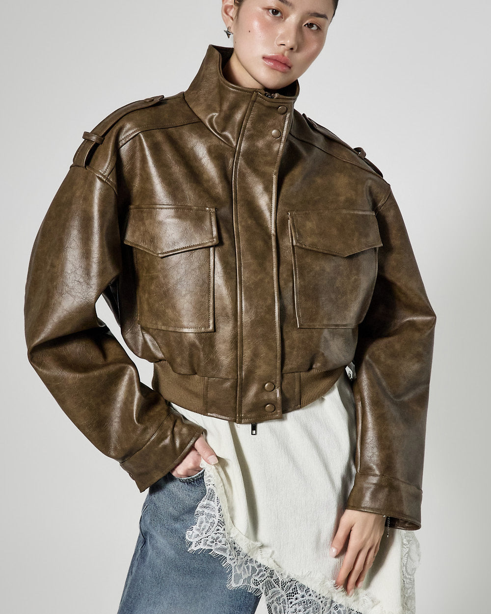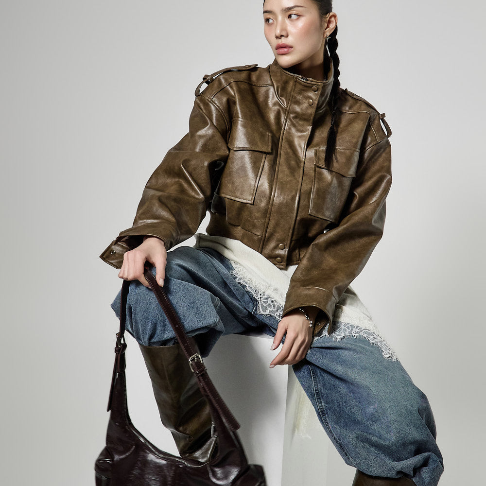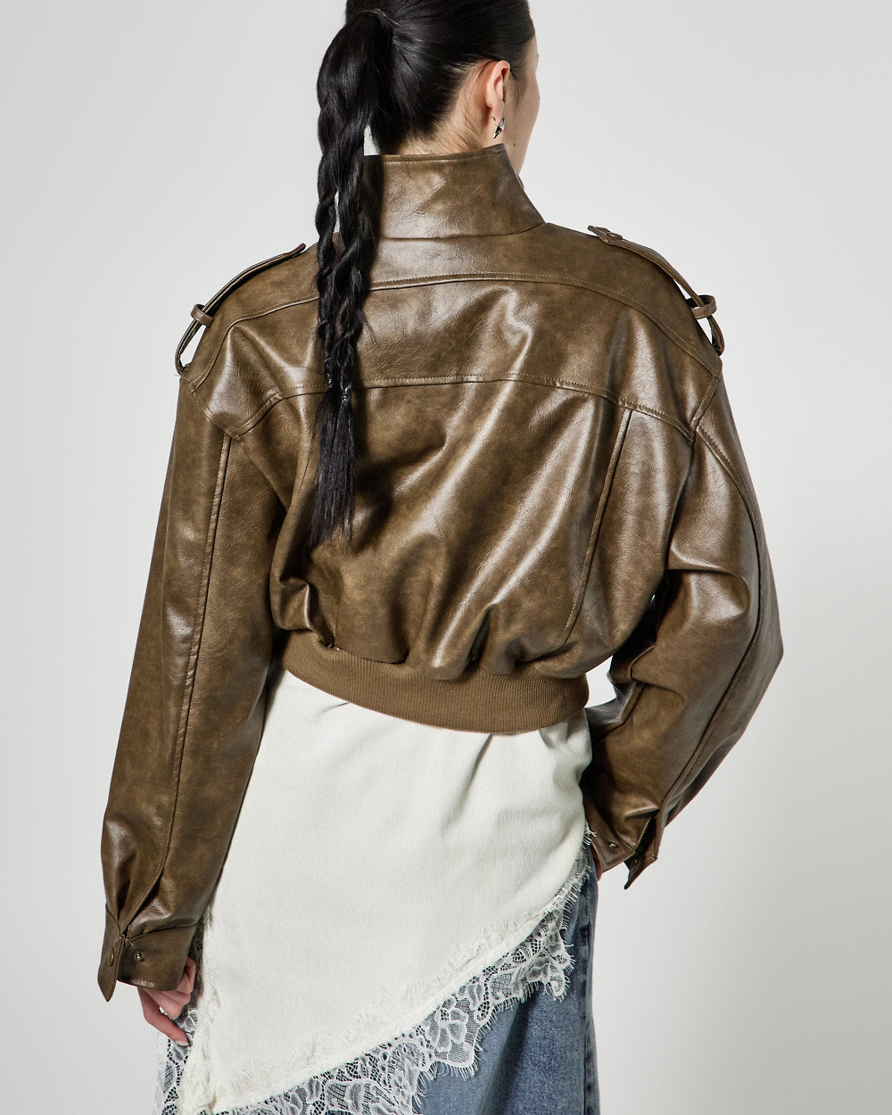 This is a leather short jumper with a casual mood.