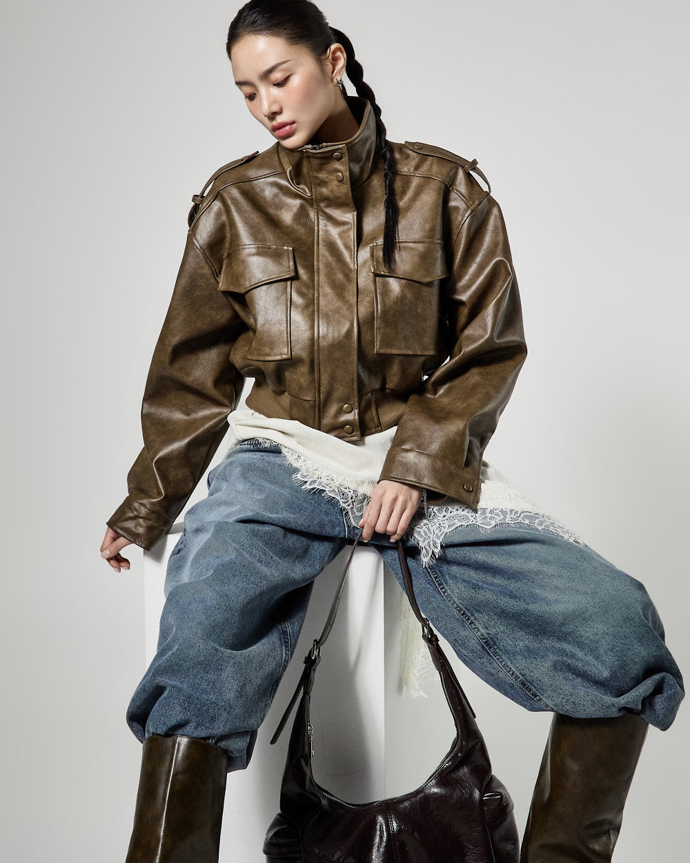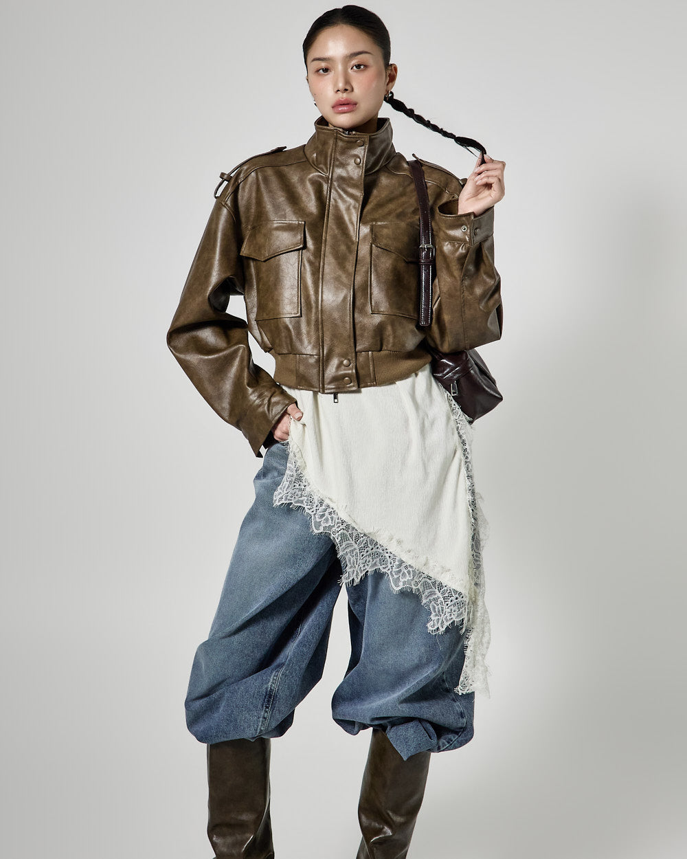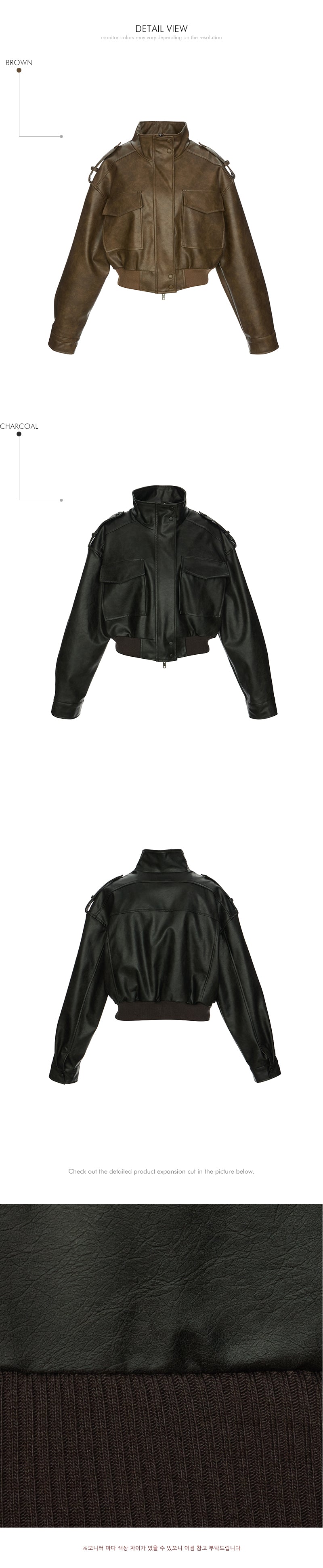 This is a leather short jumper with a casual mood.