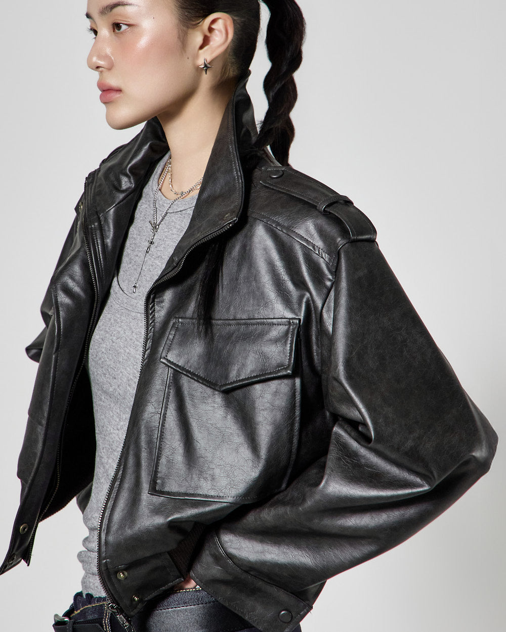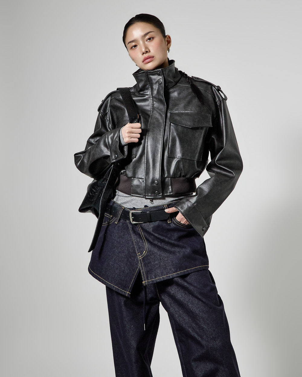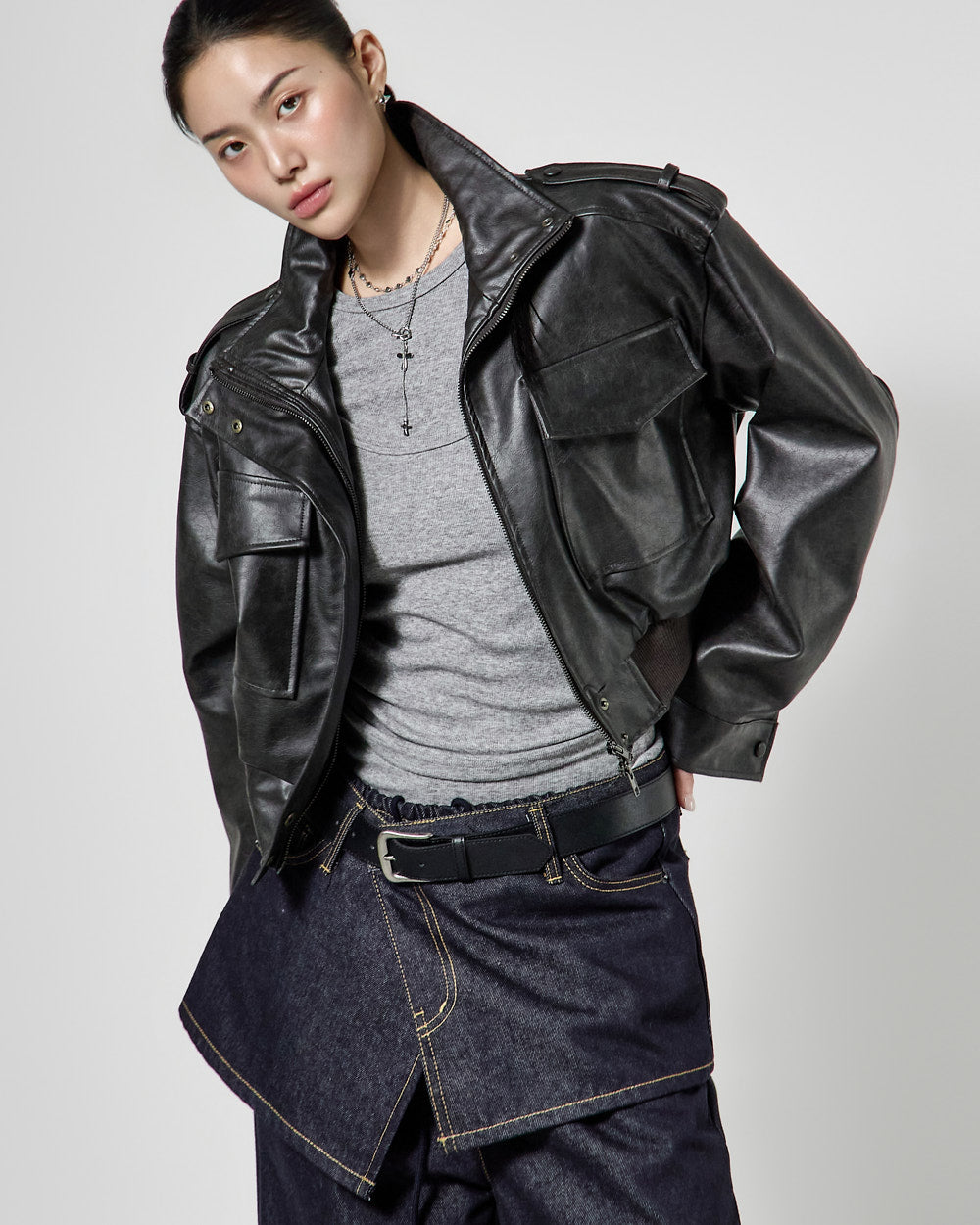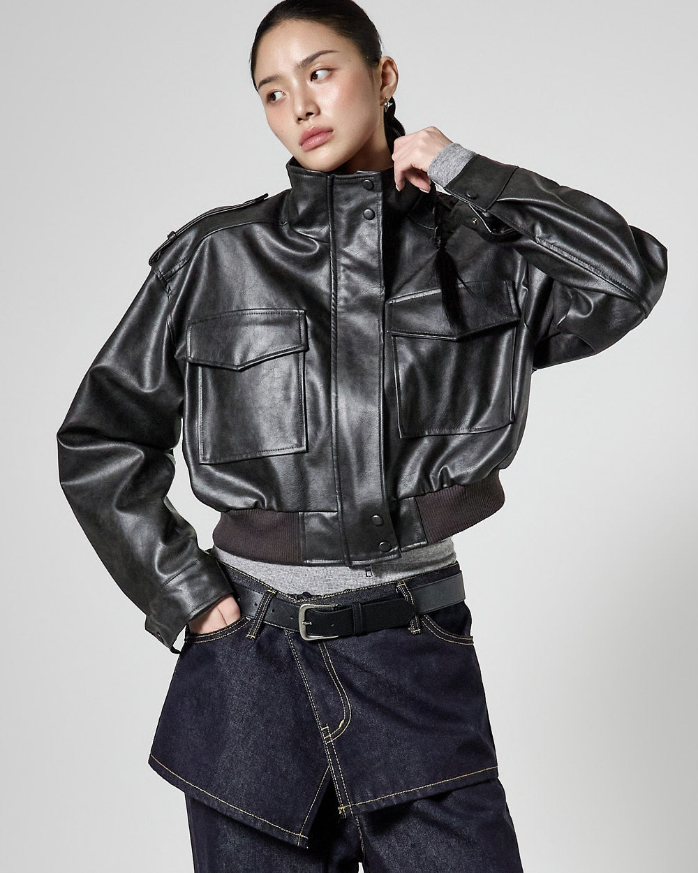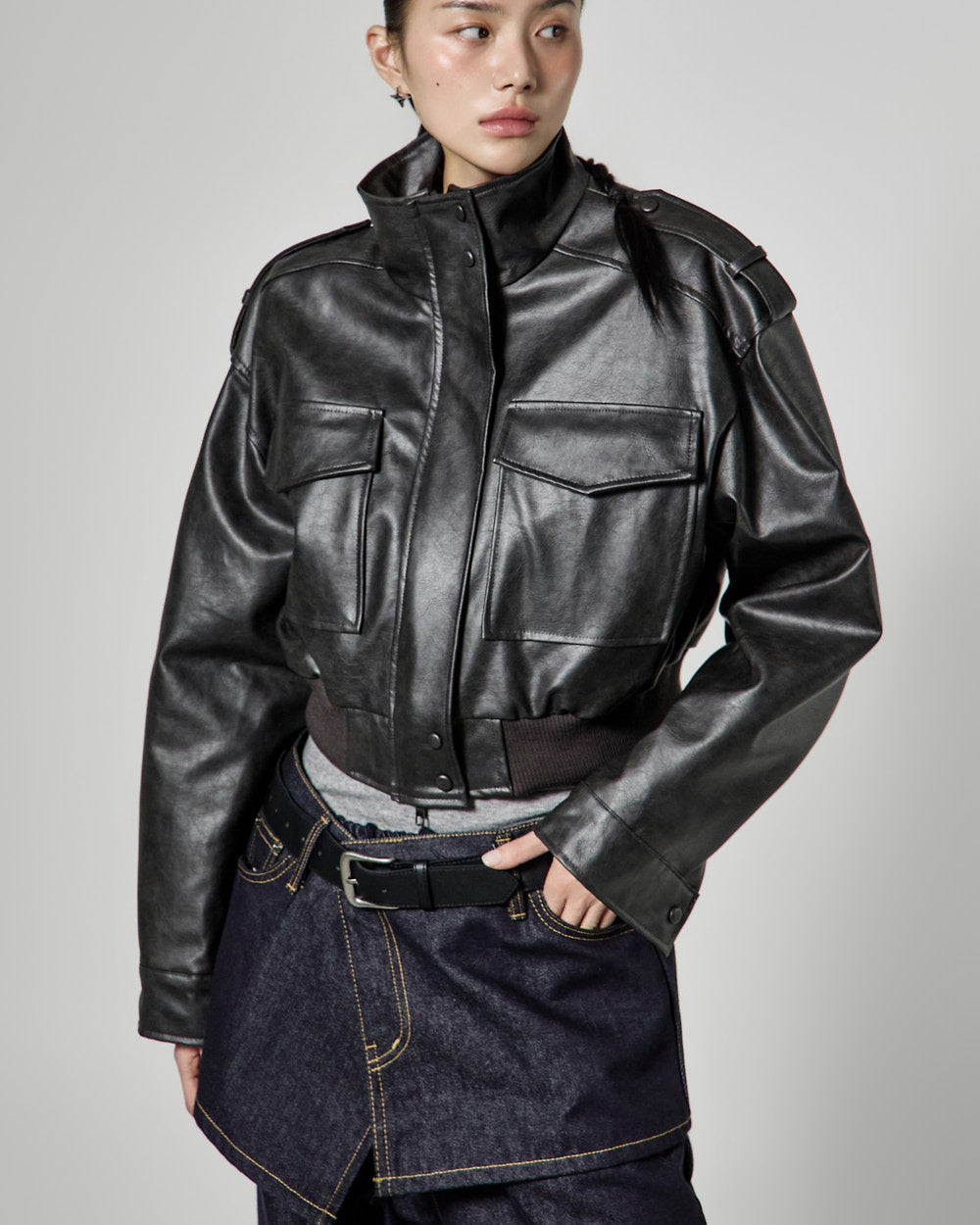 This is a leather short jumper with a casual mood.