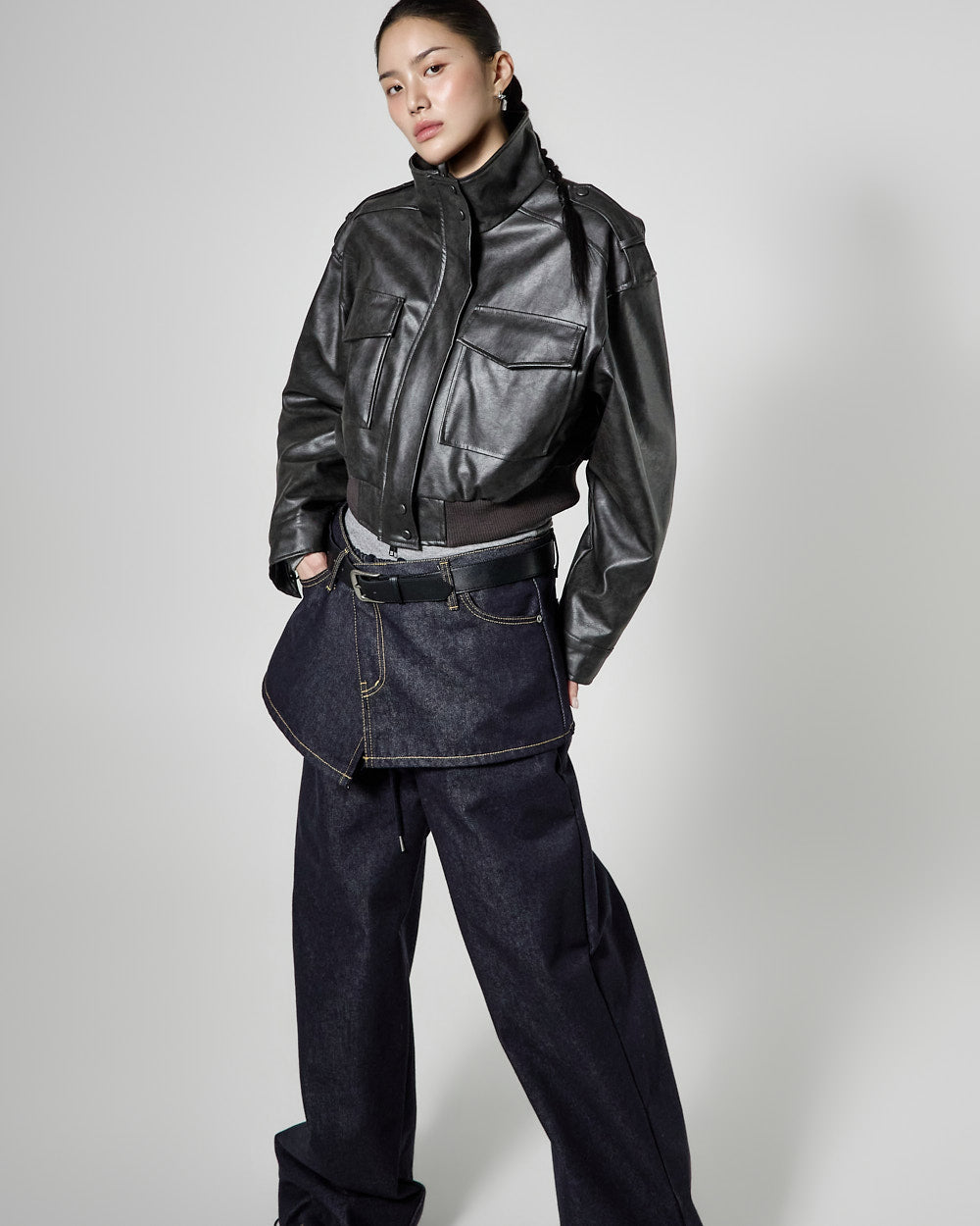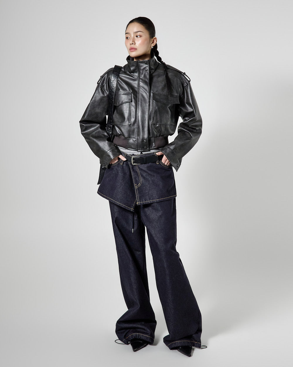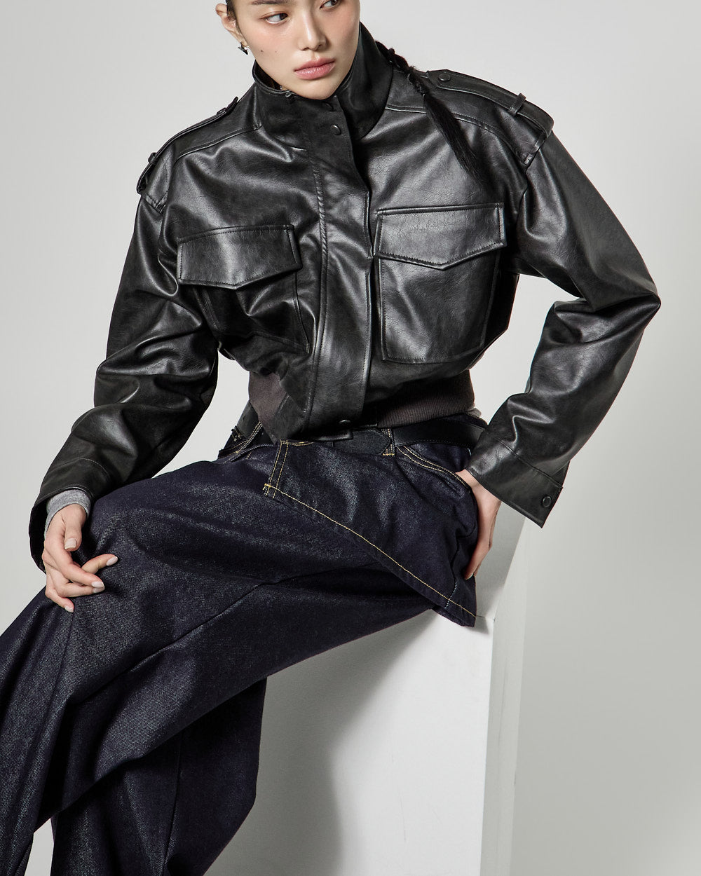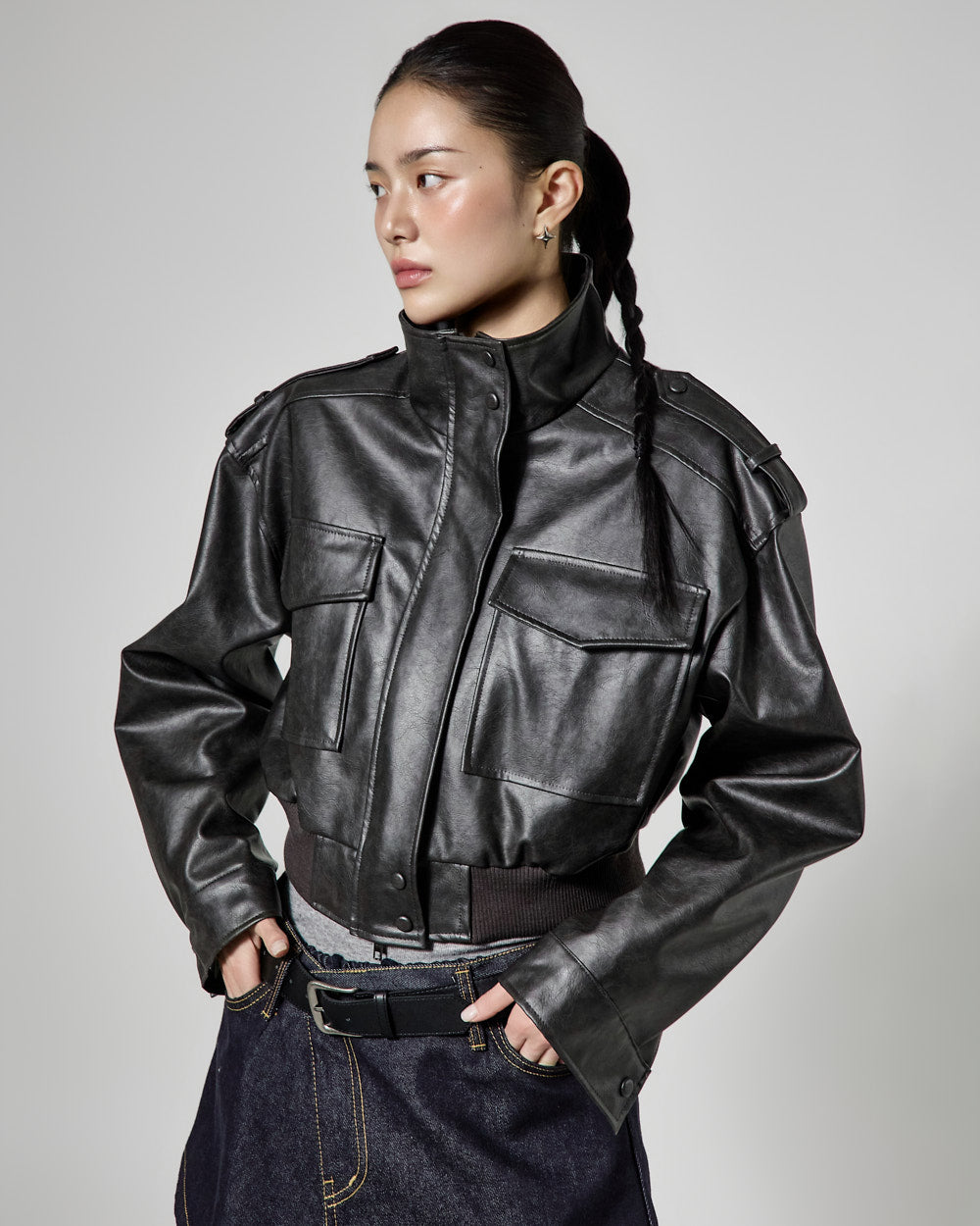 This is a leather short jumper with a casual mood.