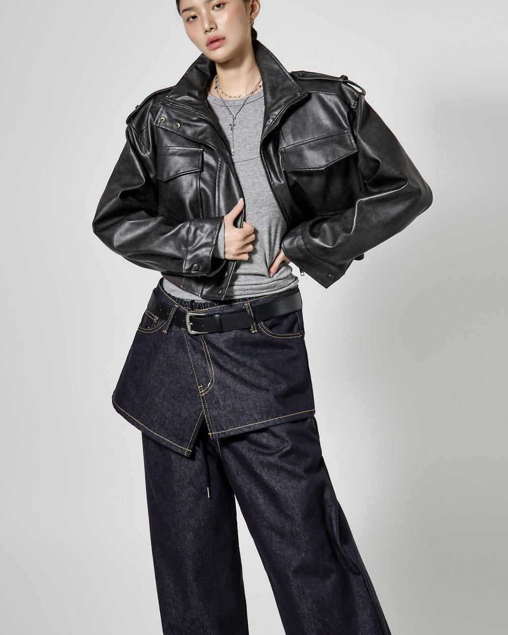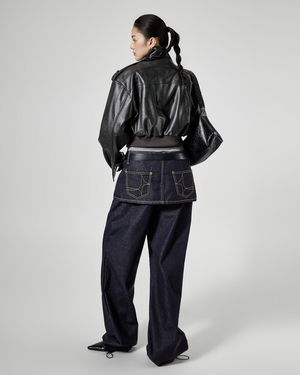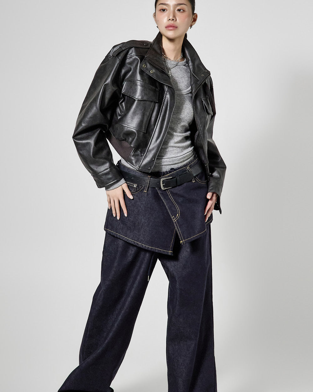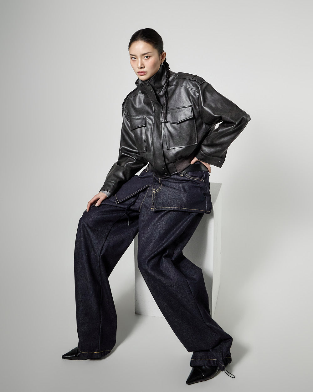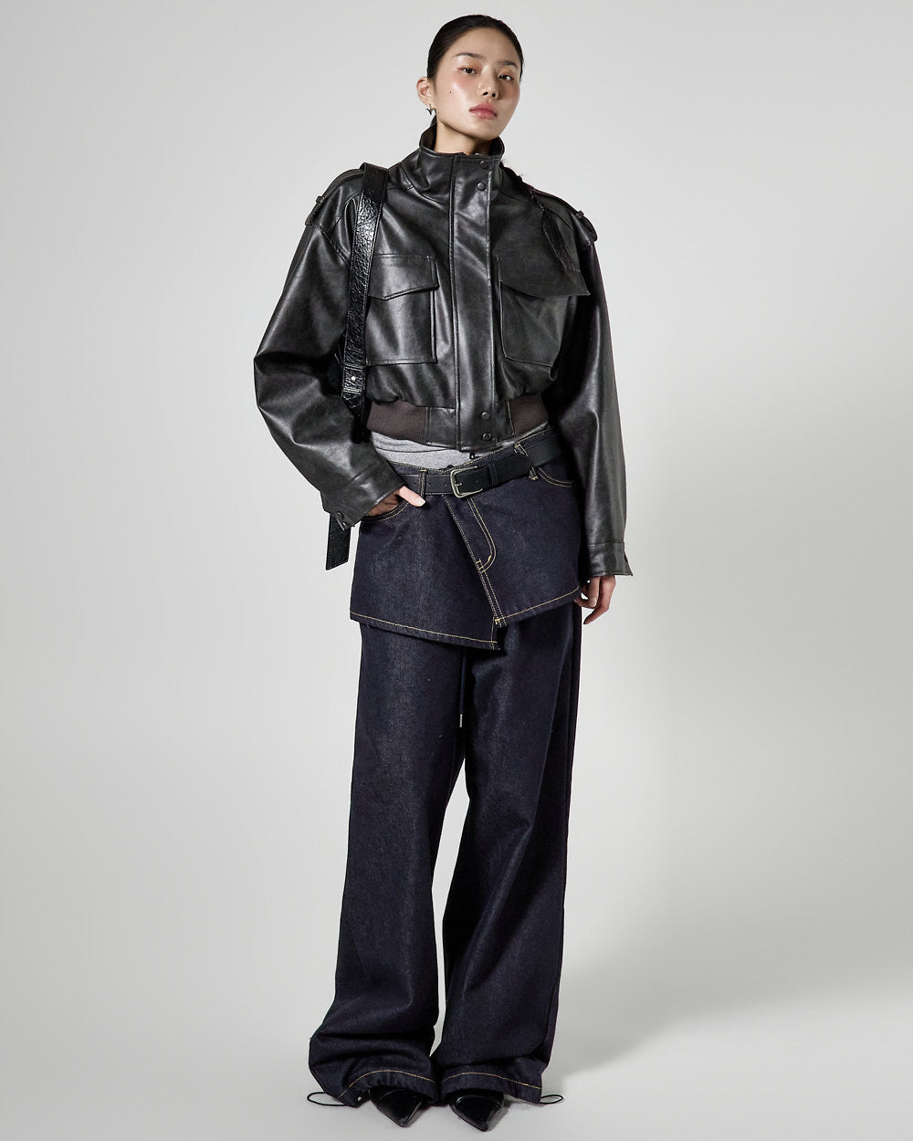 This is a leather short jumper with a casual mood.