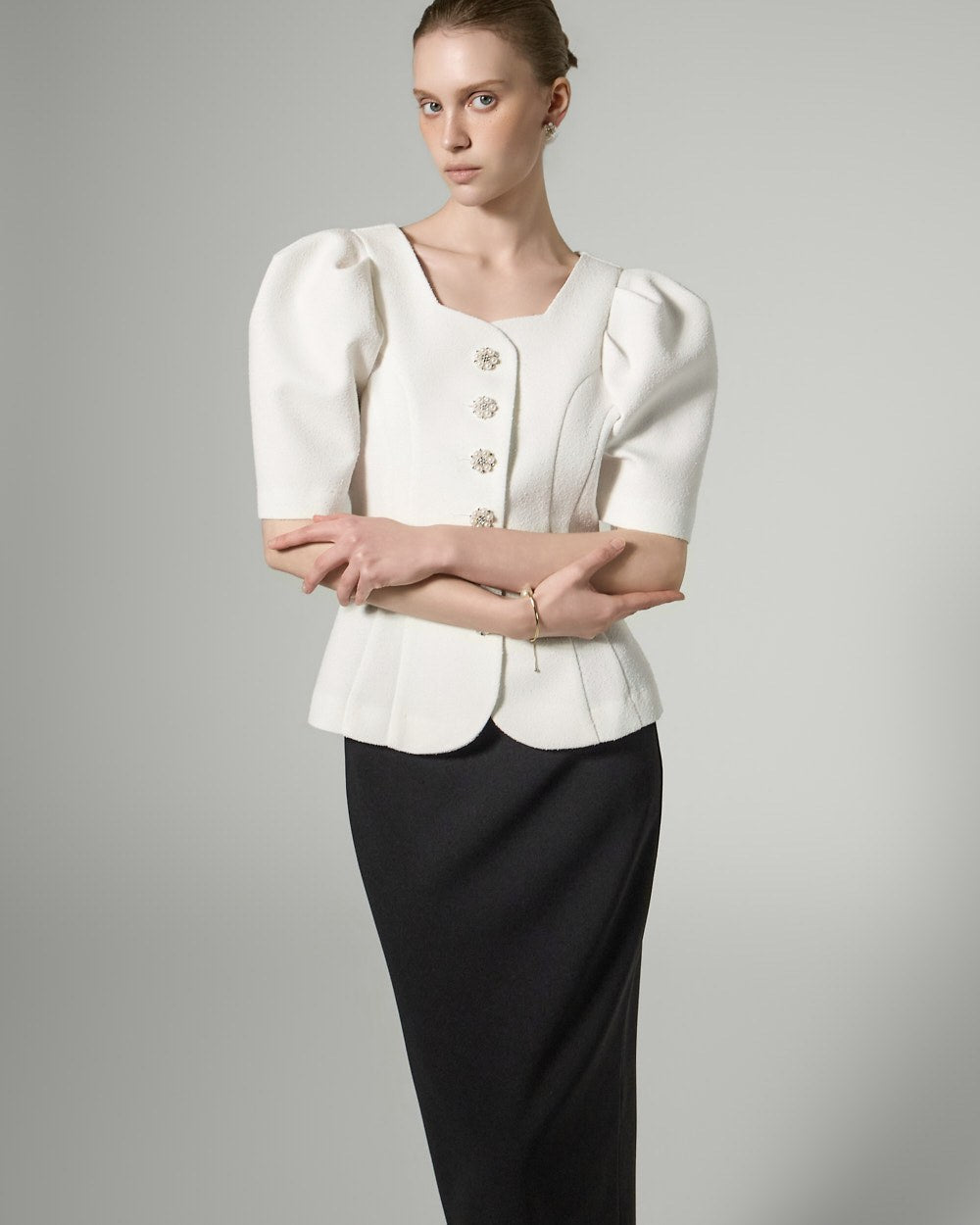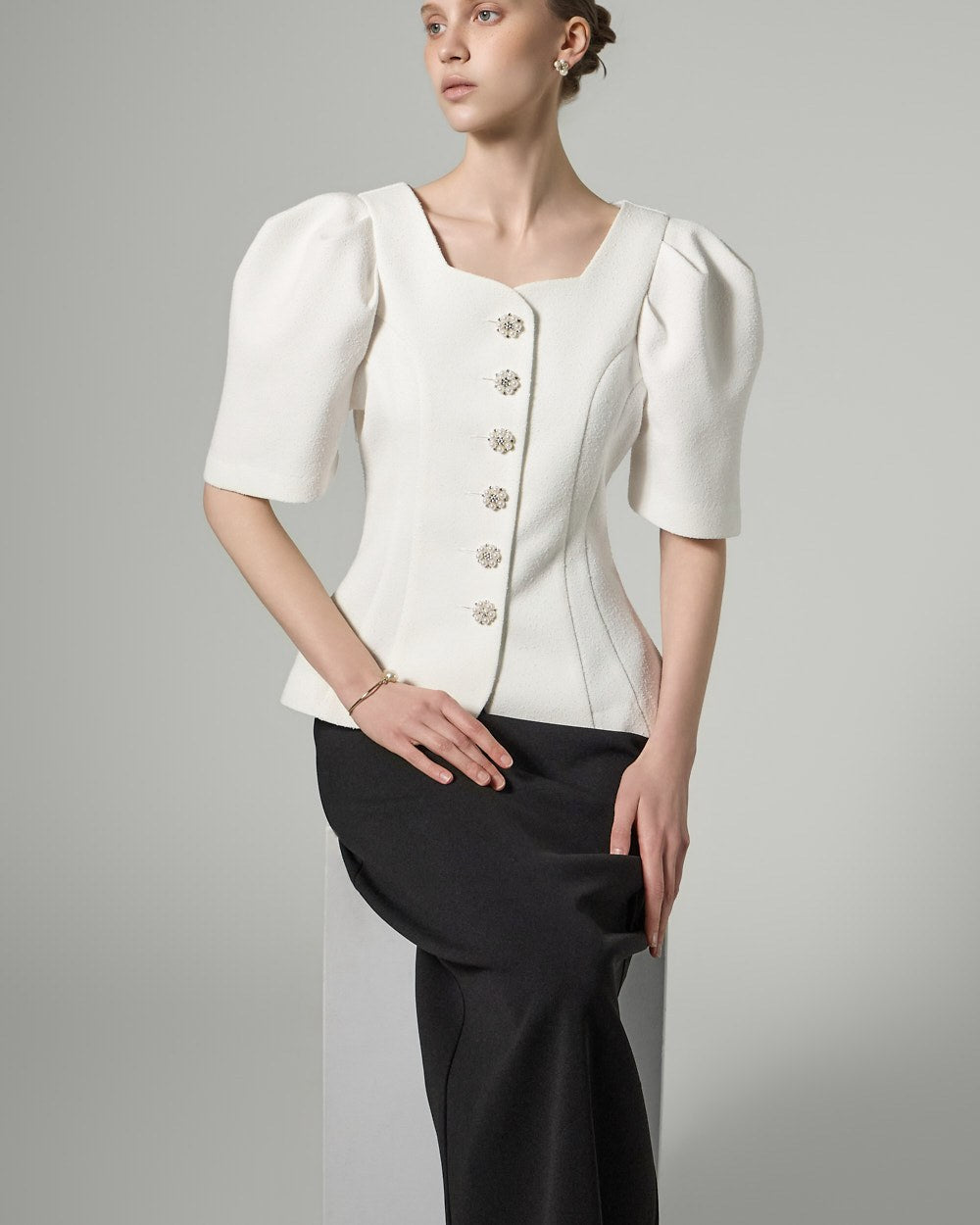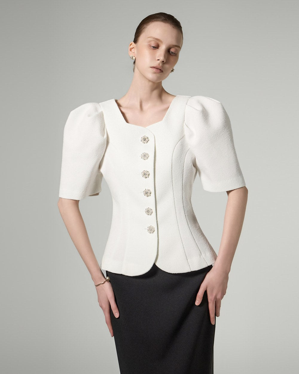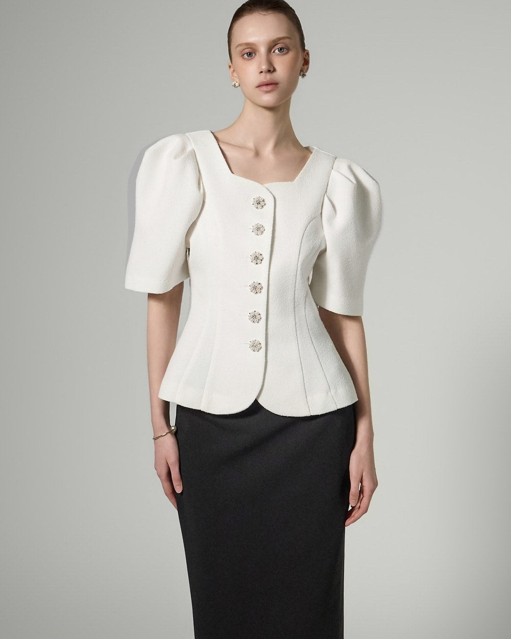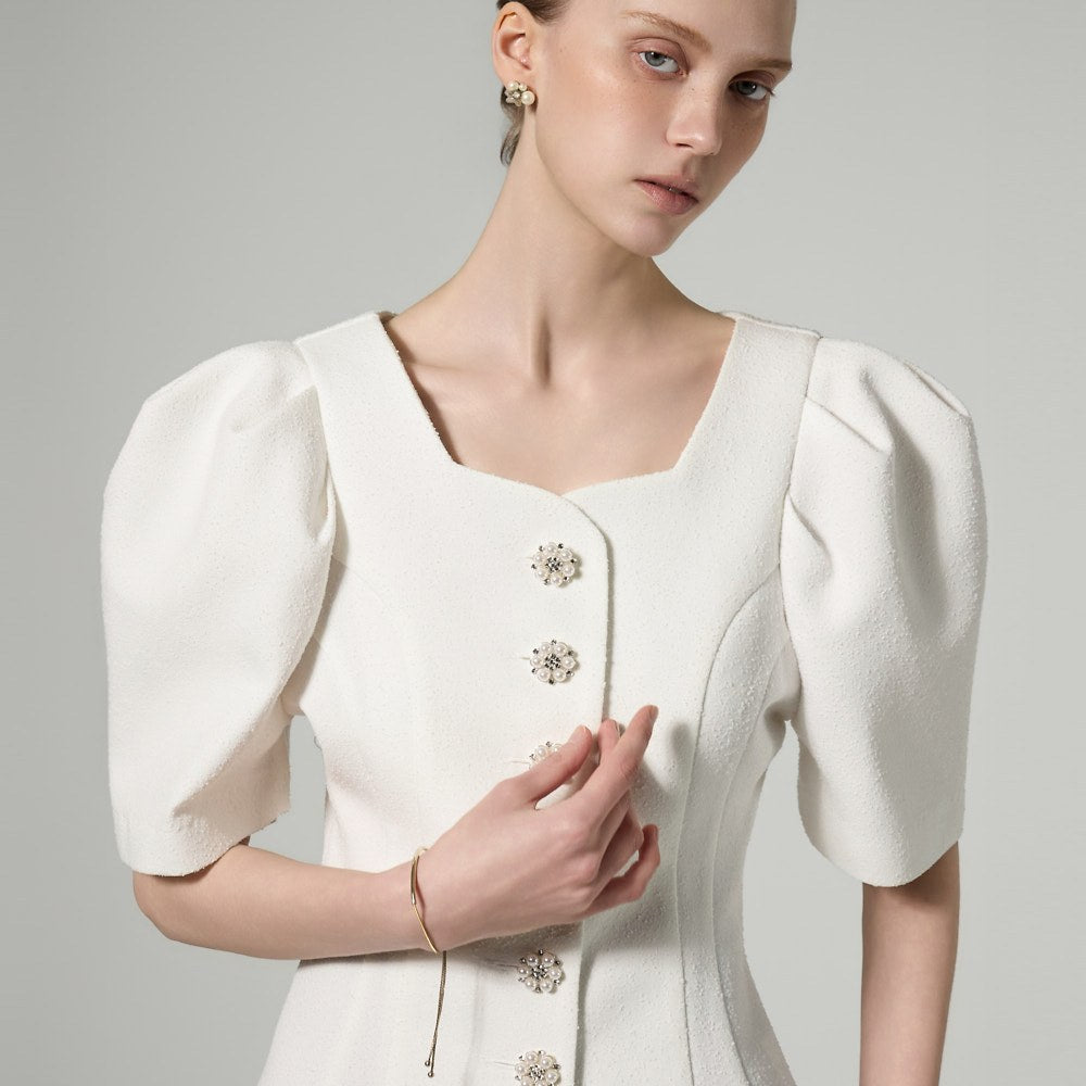 This button puff jacket exudes elegance and femininity.