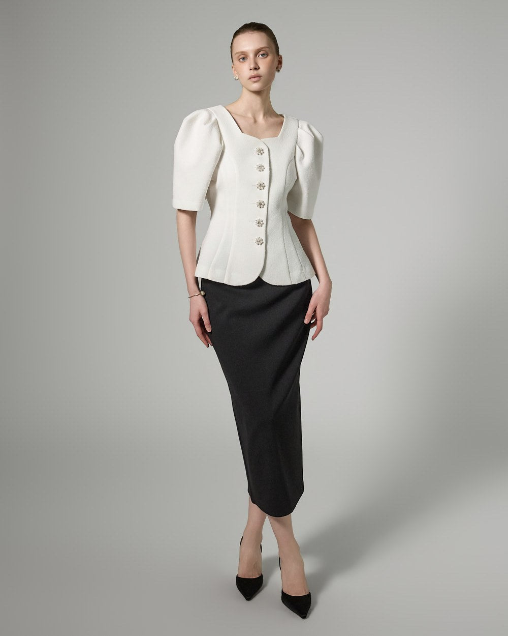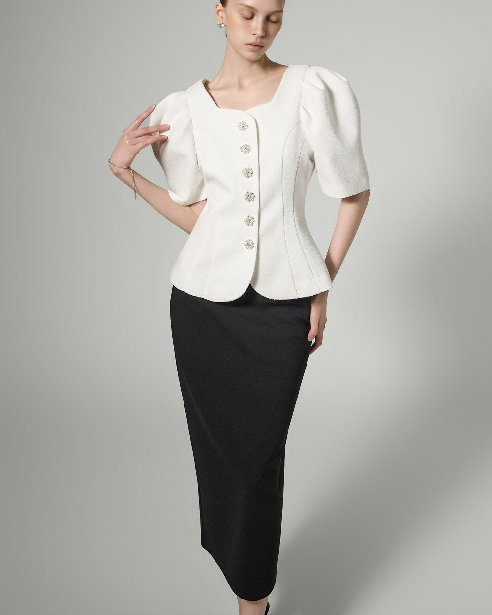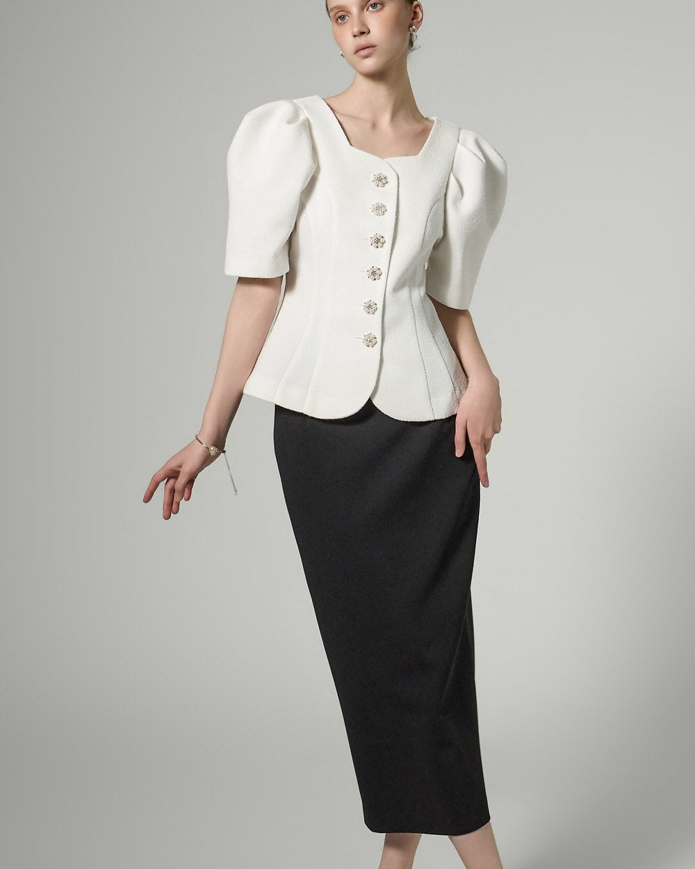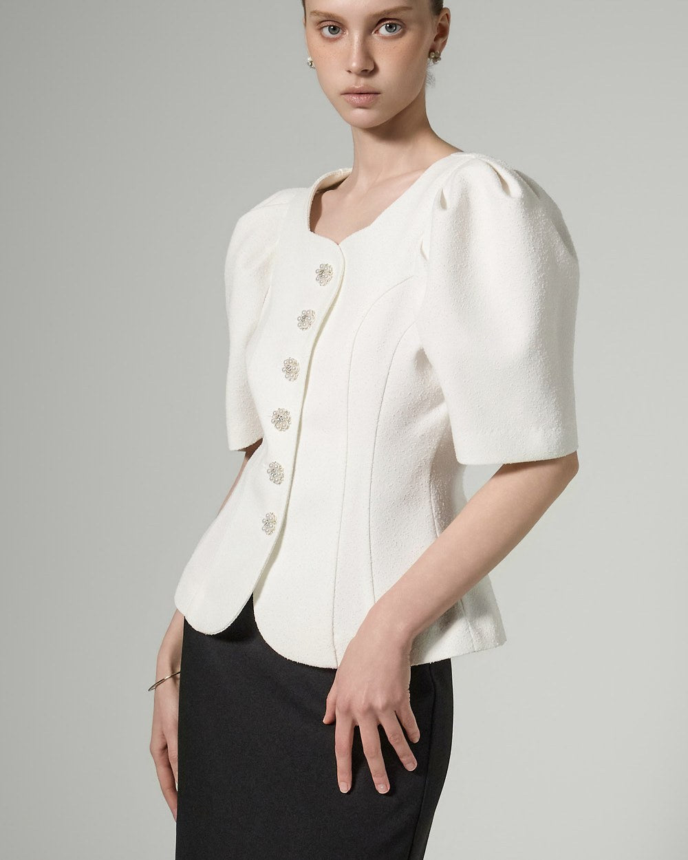This button puff jacket exudes elegance and femininity.