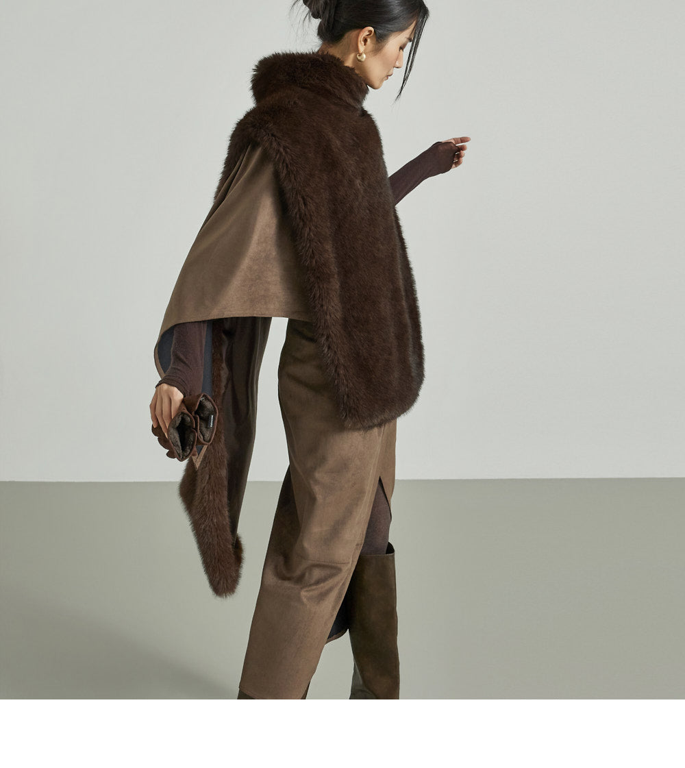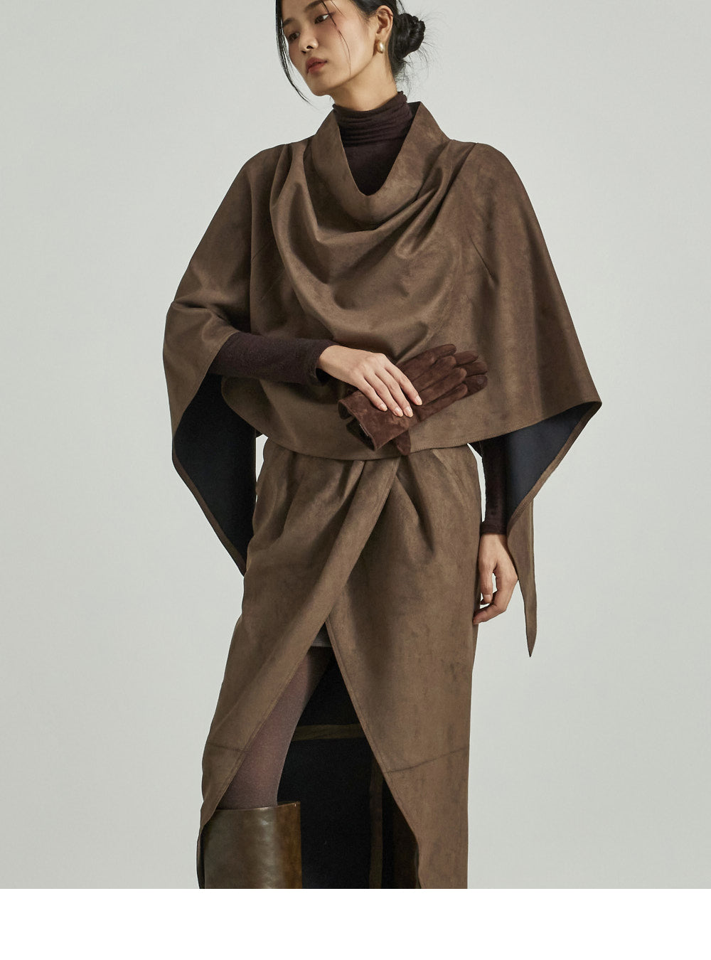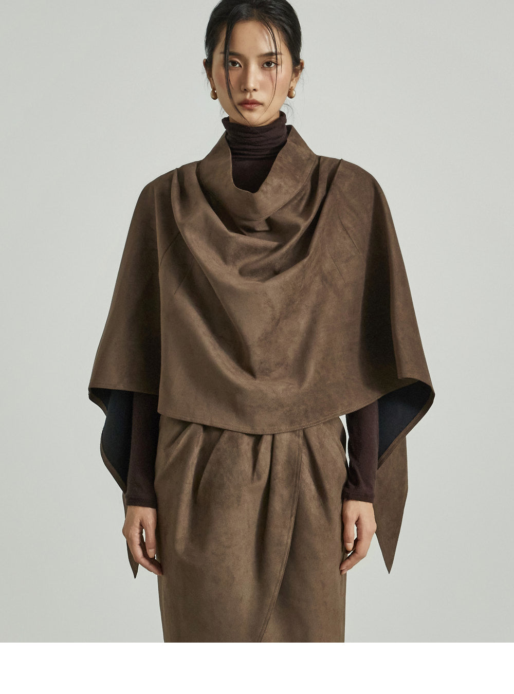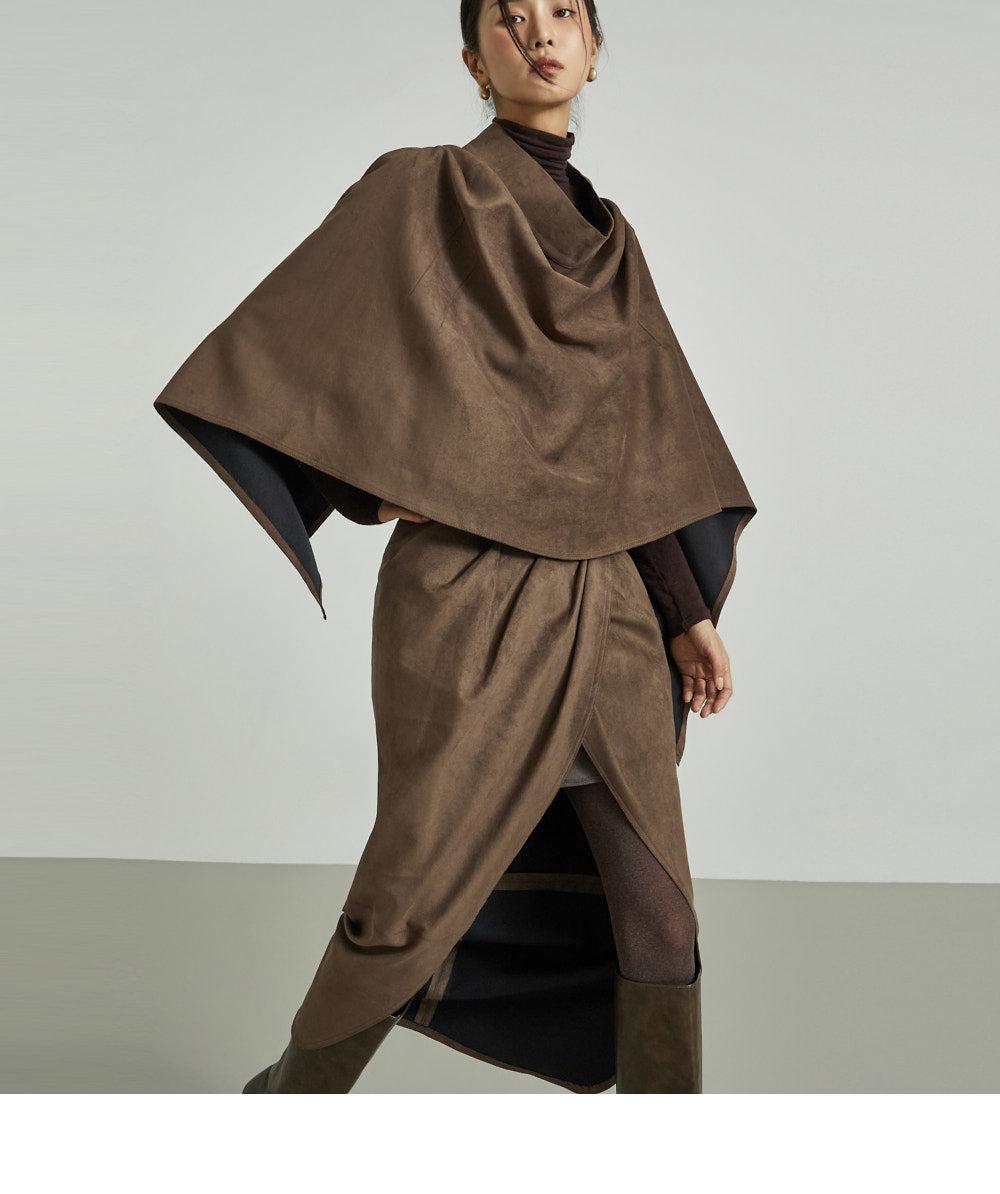 This suede drape cape exudes a modern vibe.