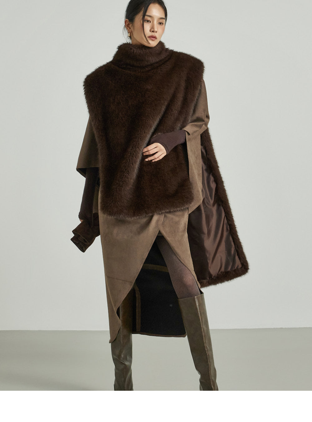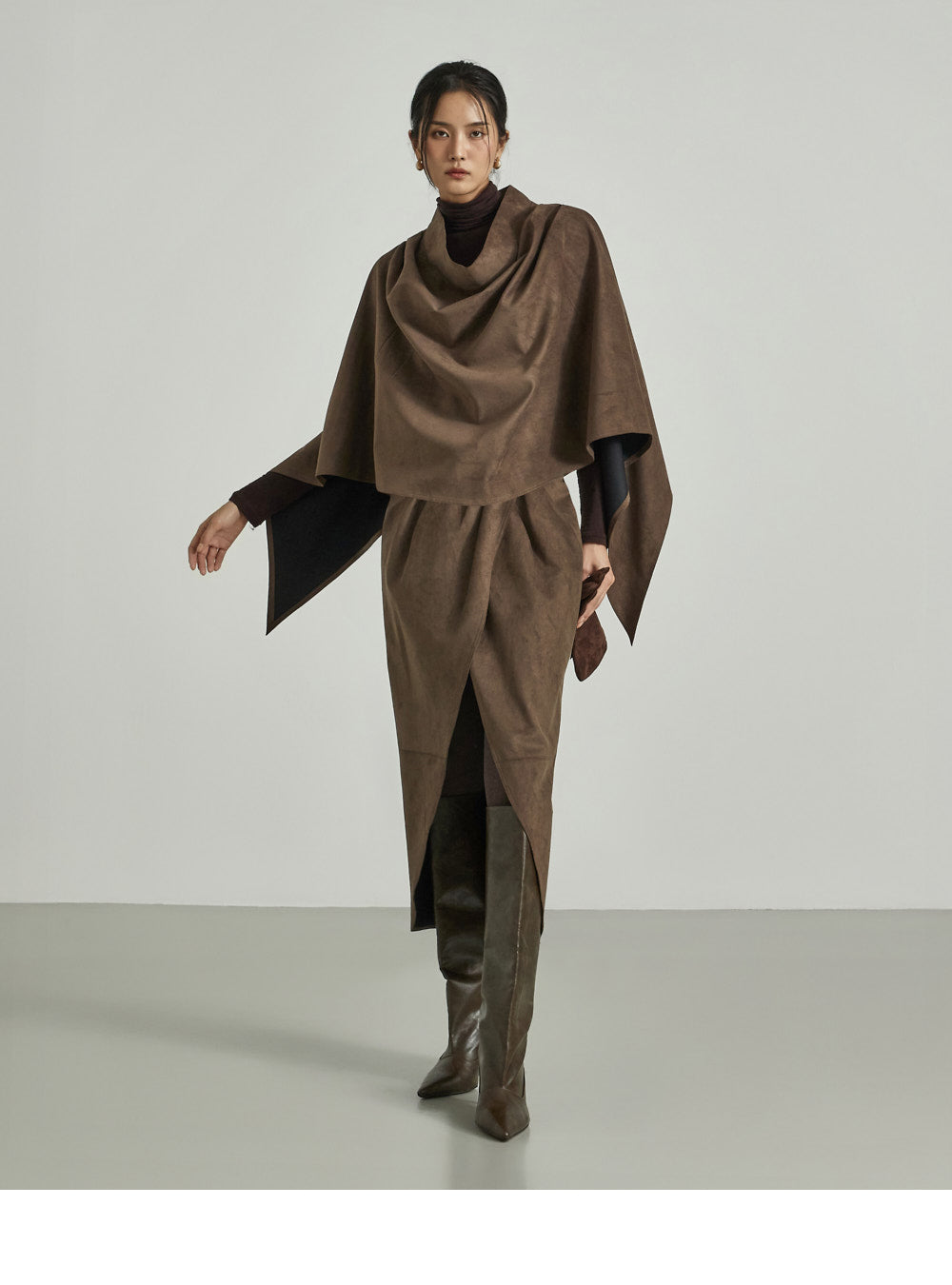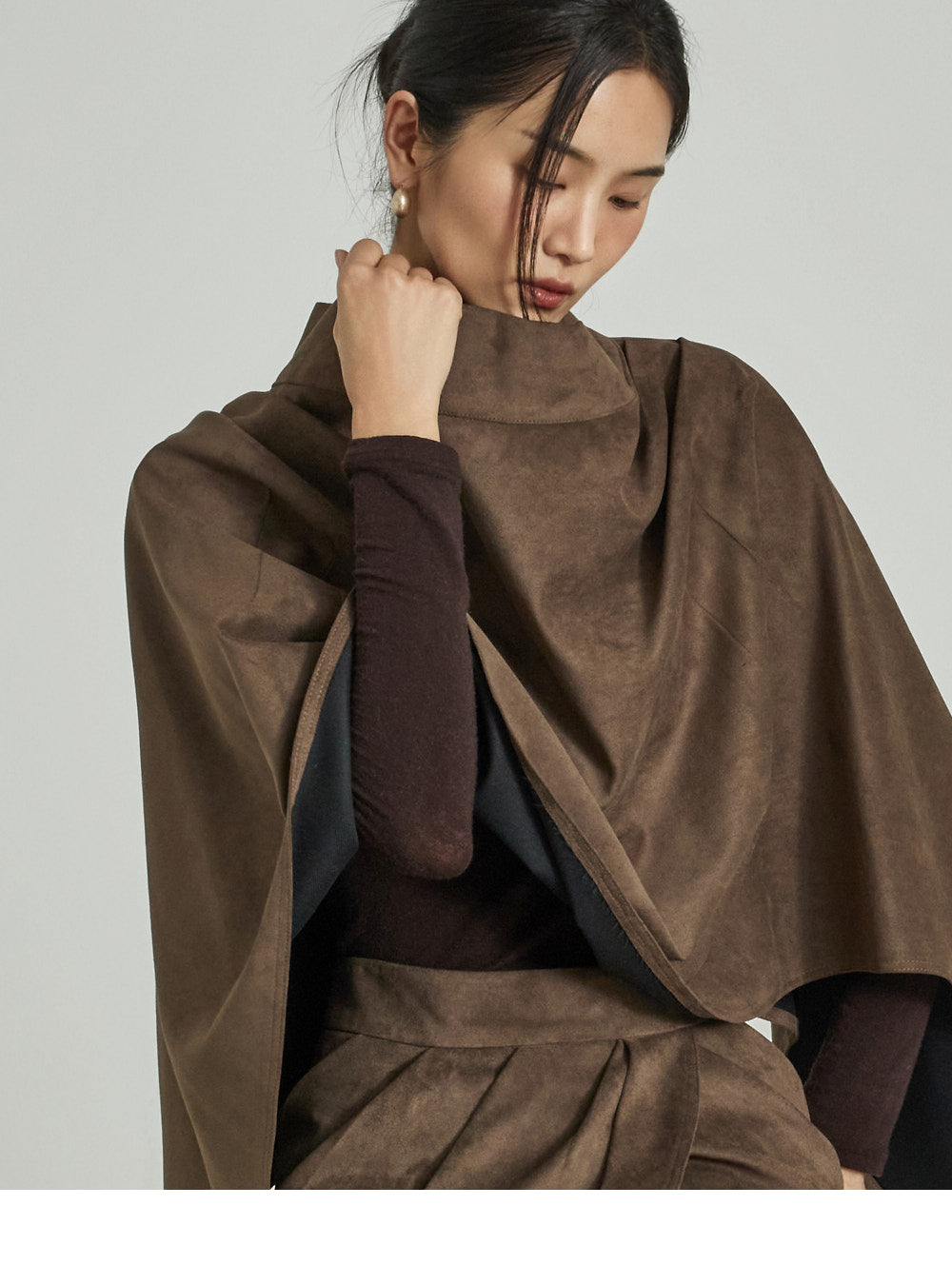 This suede drape cape exudes a modern vibe.