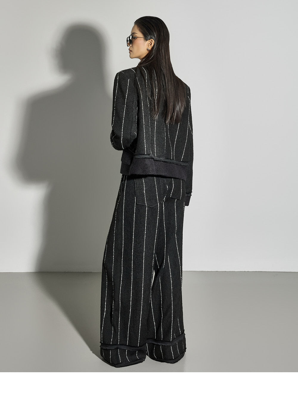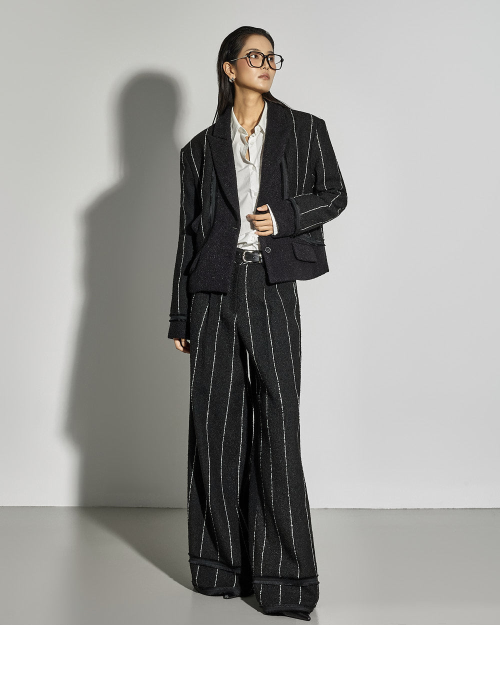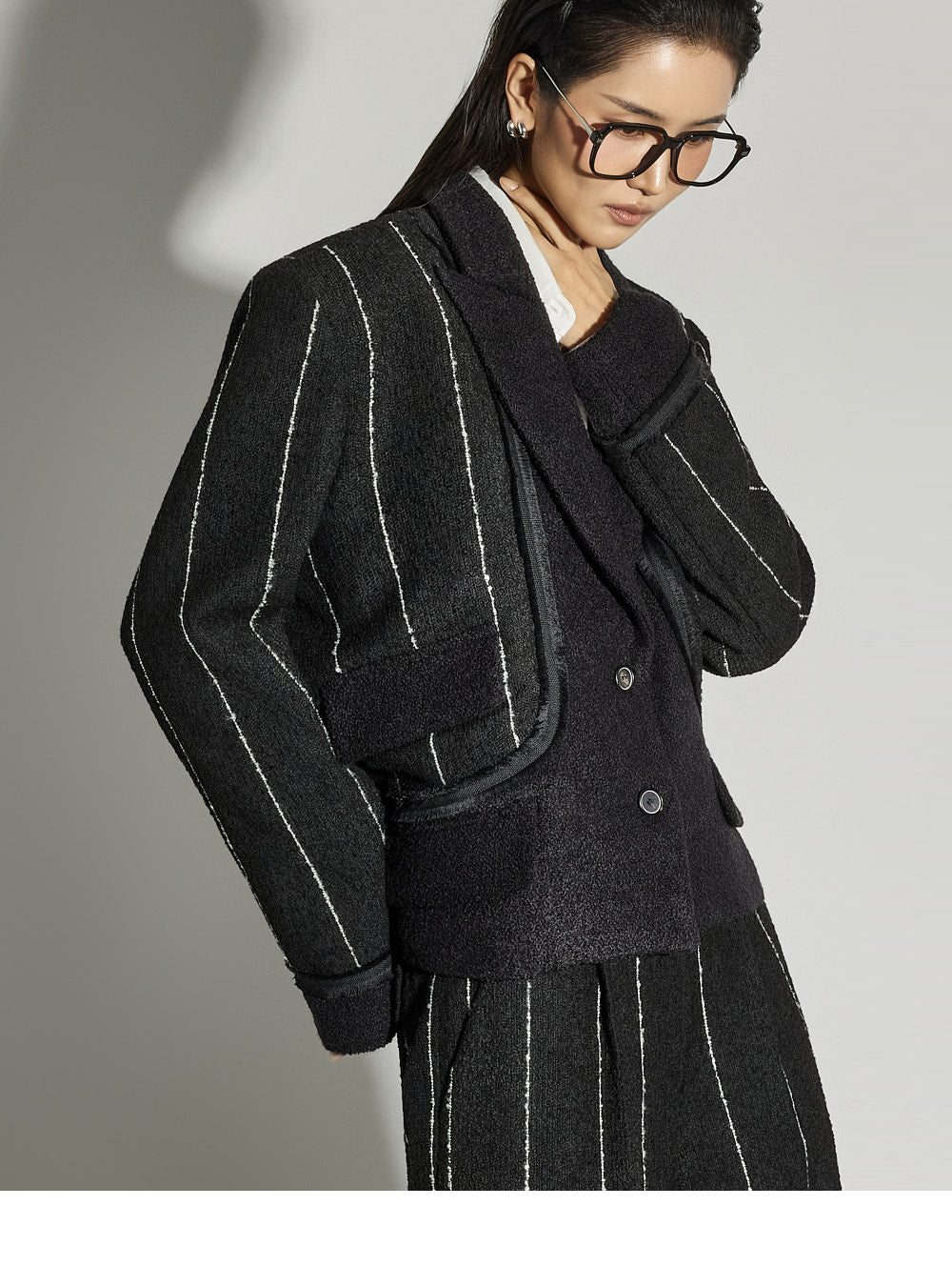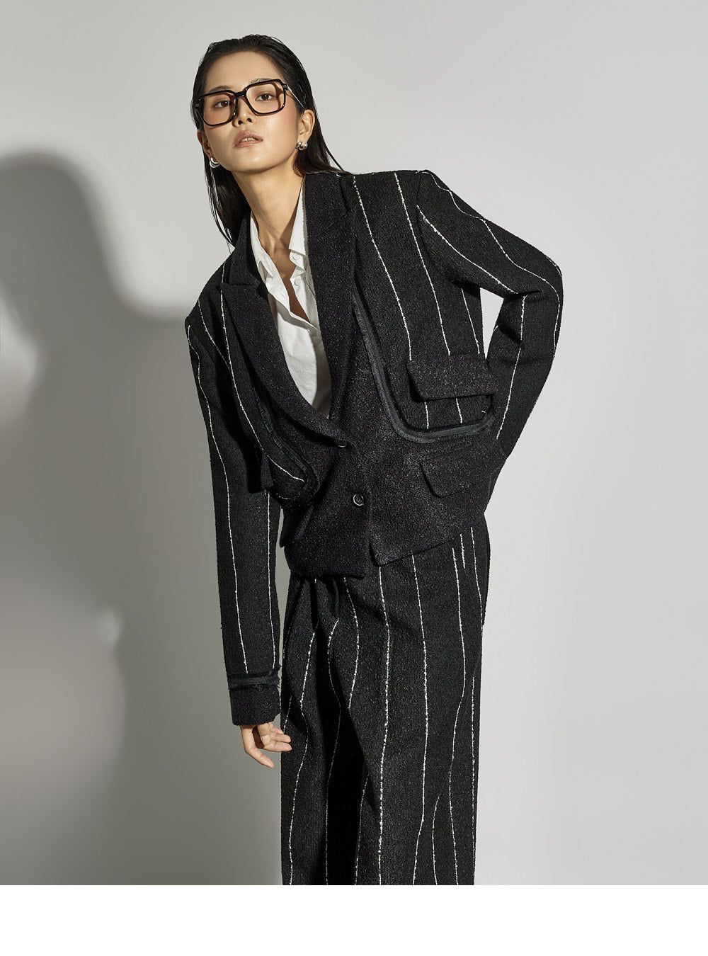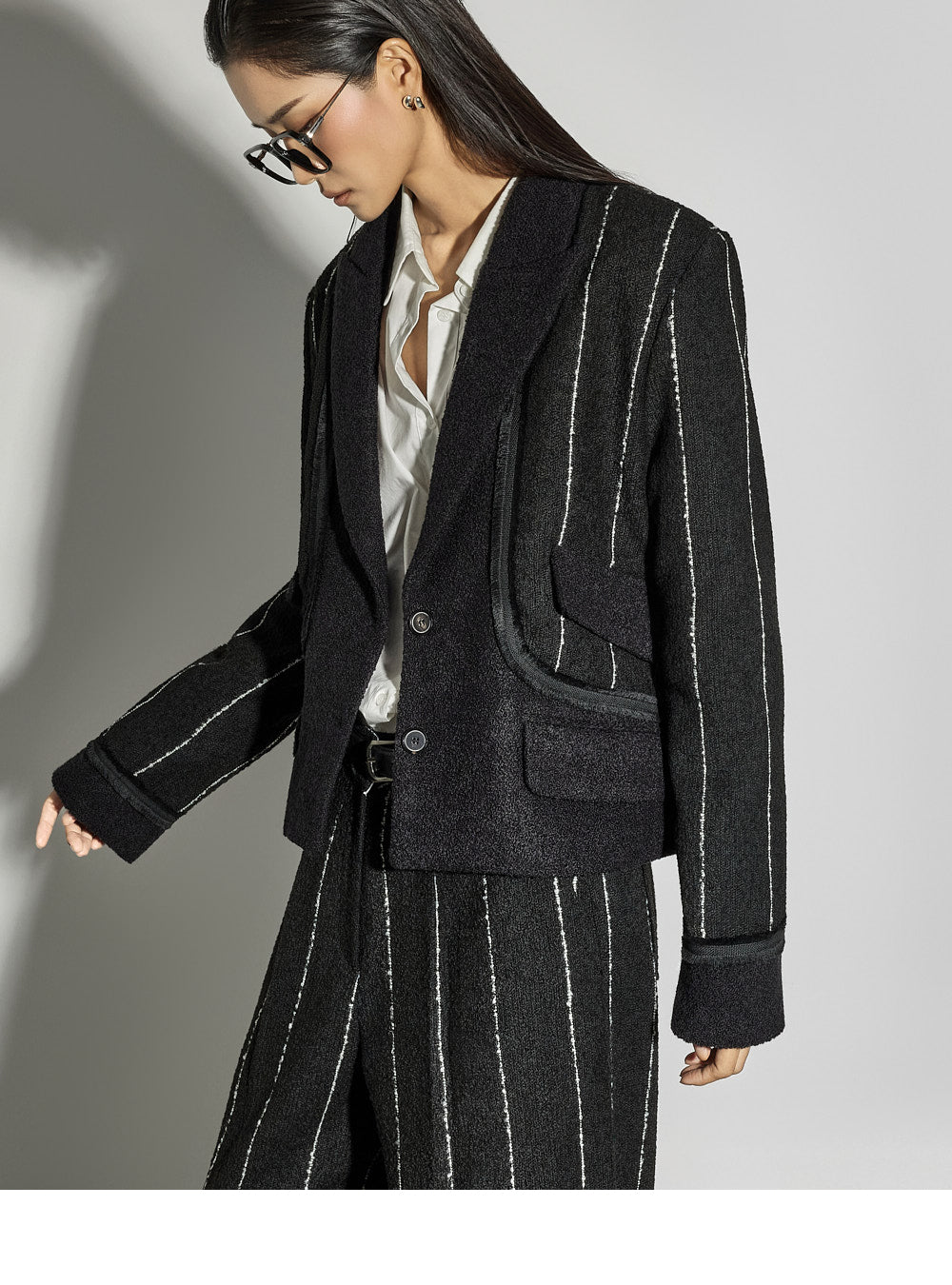 This chic cropped striped jacket is crafted from a polyester and wool blend,