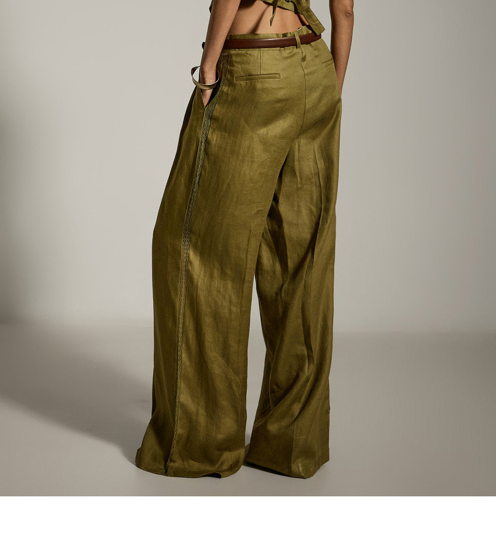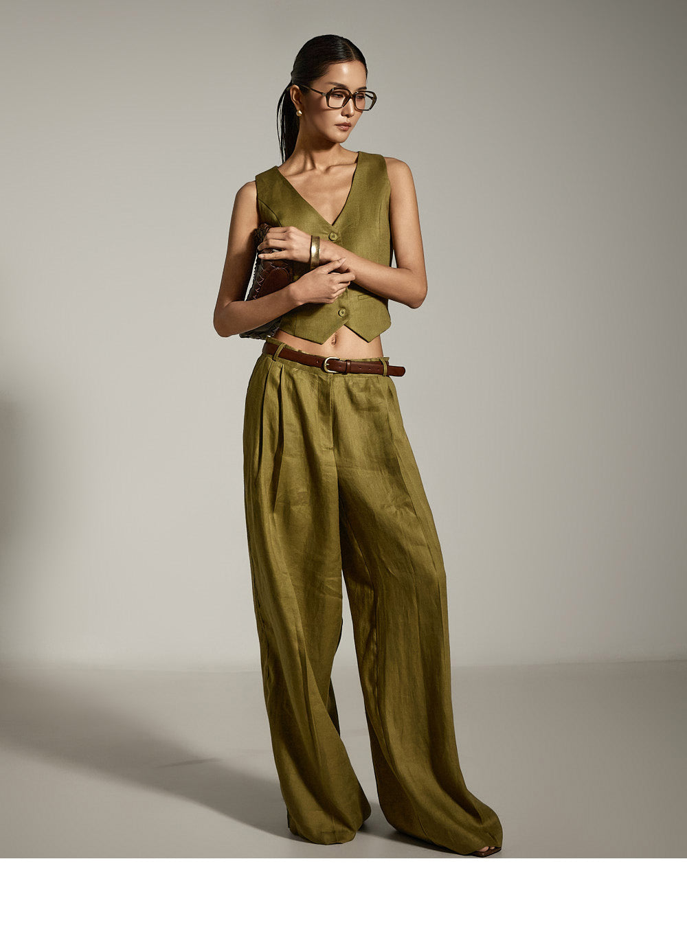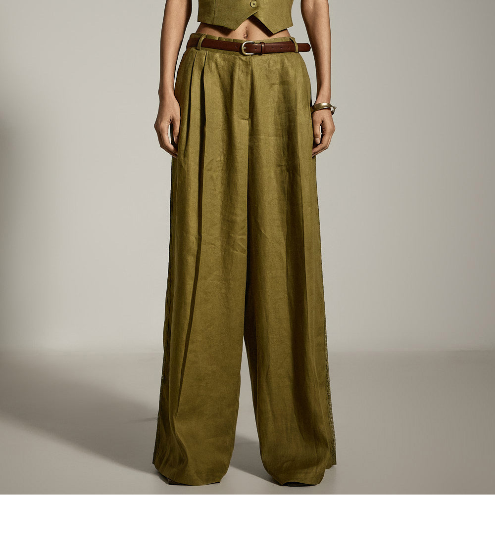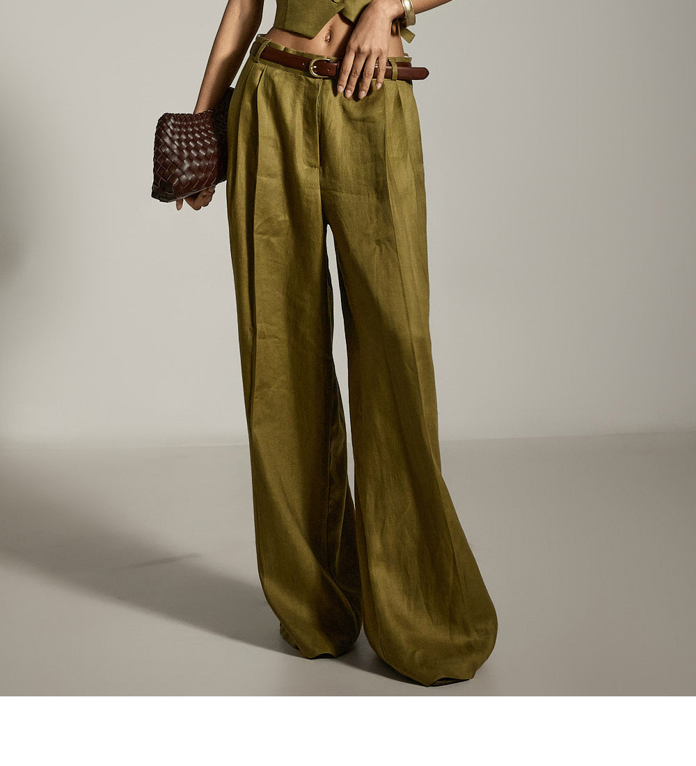 Front pleats lend a polished touch, while the front hook-and-zip closure