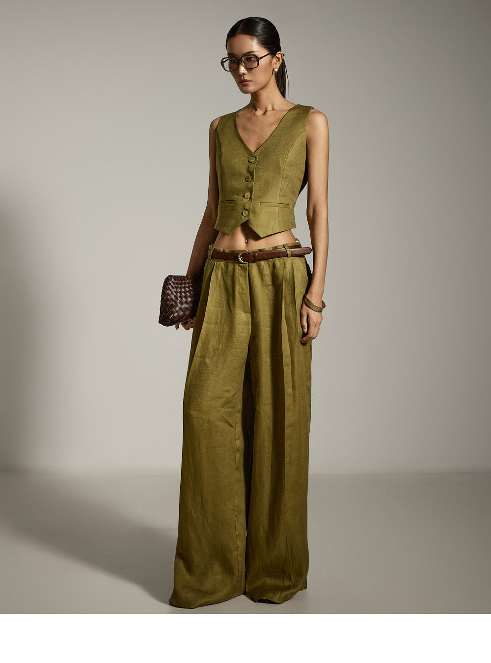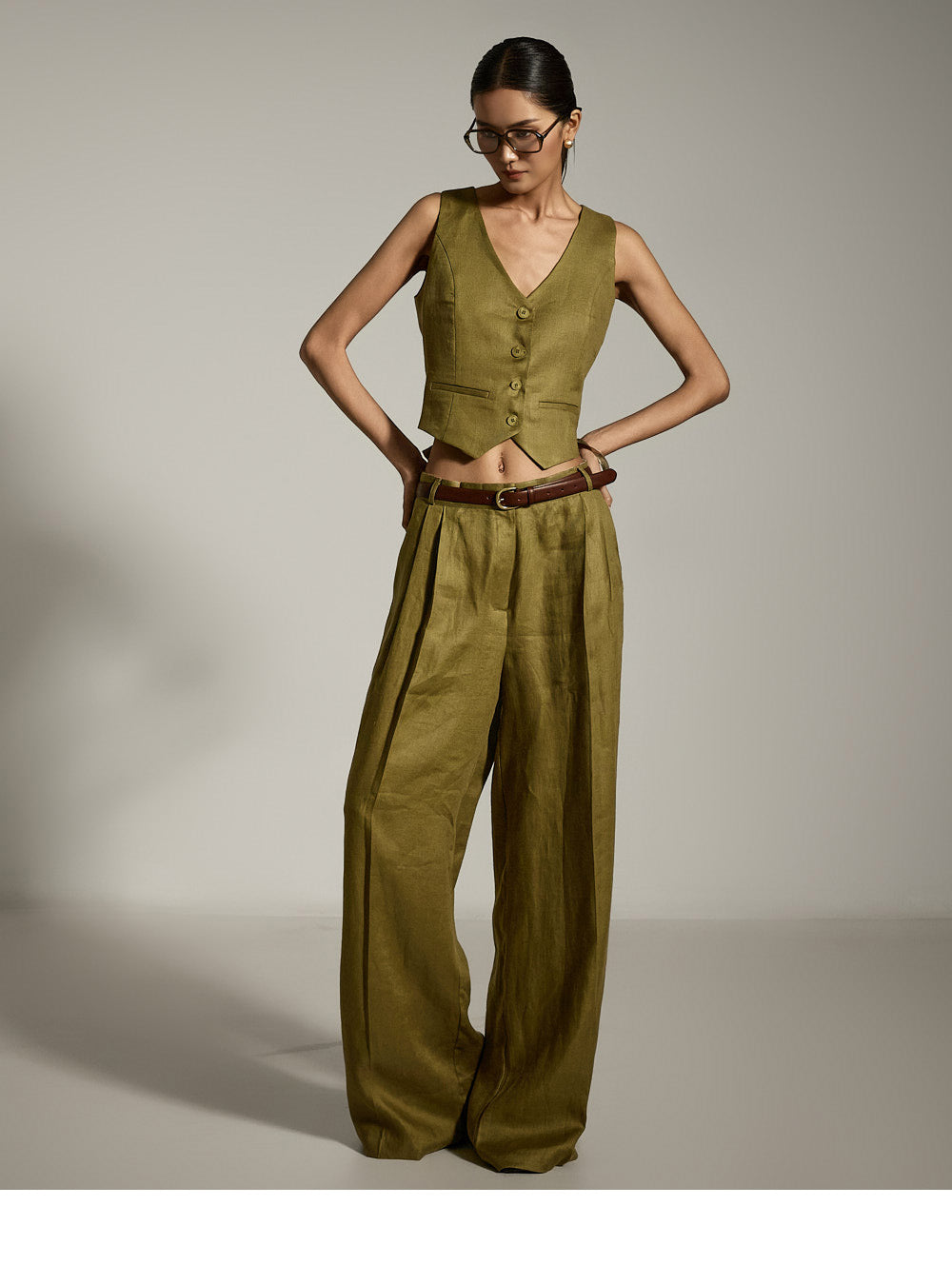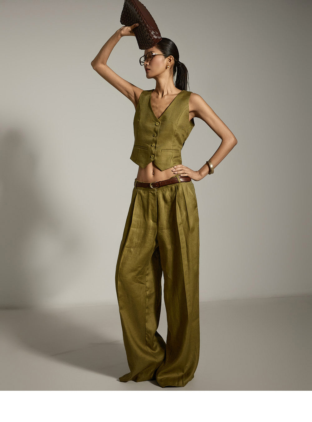 Front pleats lend a polished touch, while the front hook-and-zip closure