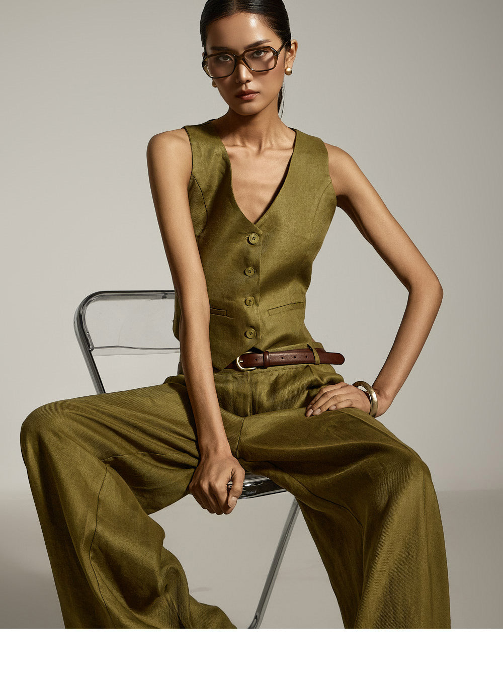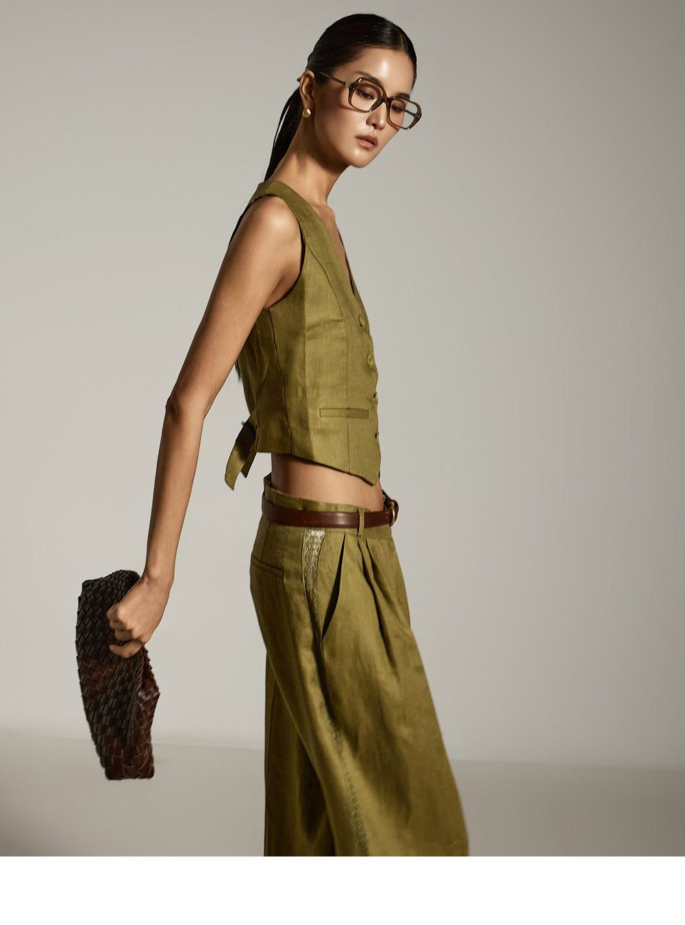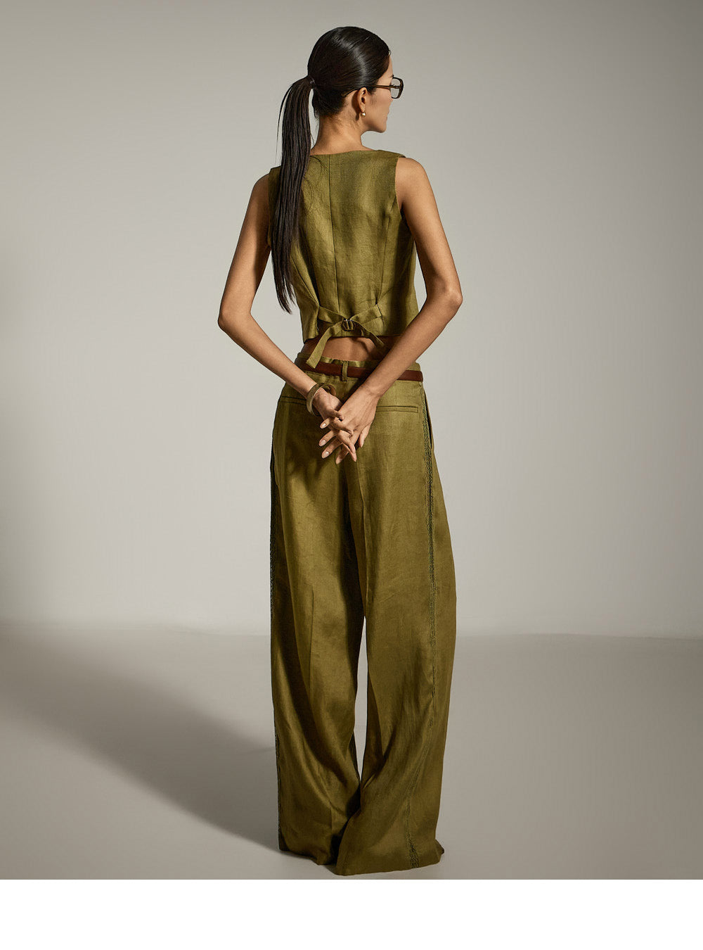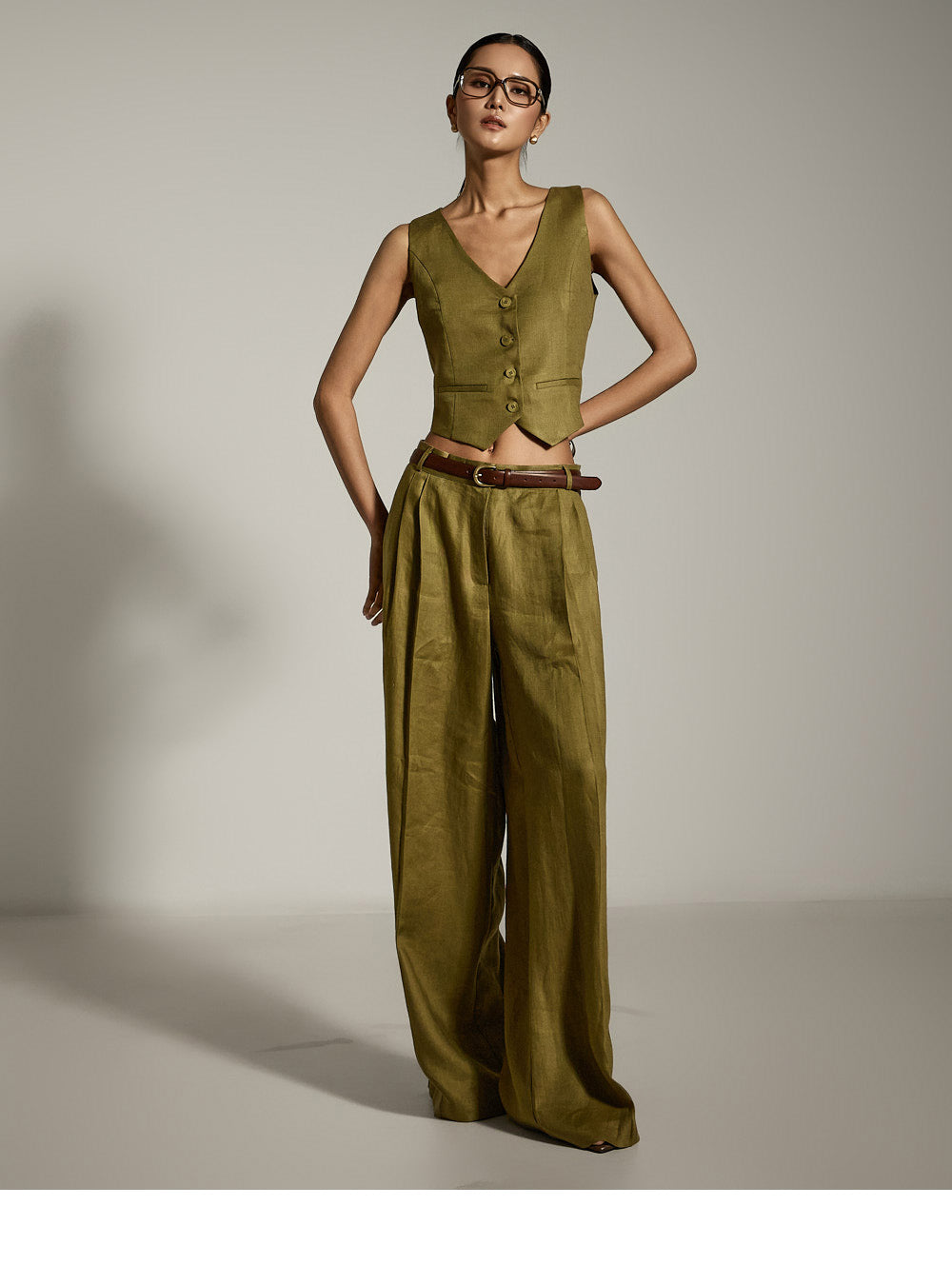 Front pleats lend a polished touch, while the front hook-and-zip closure