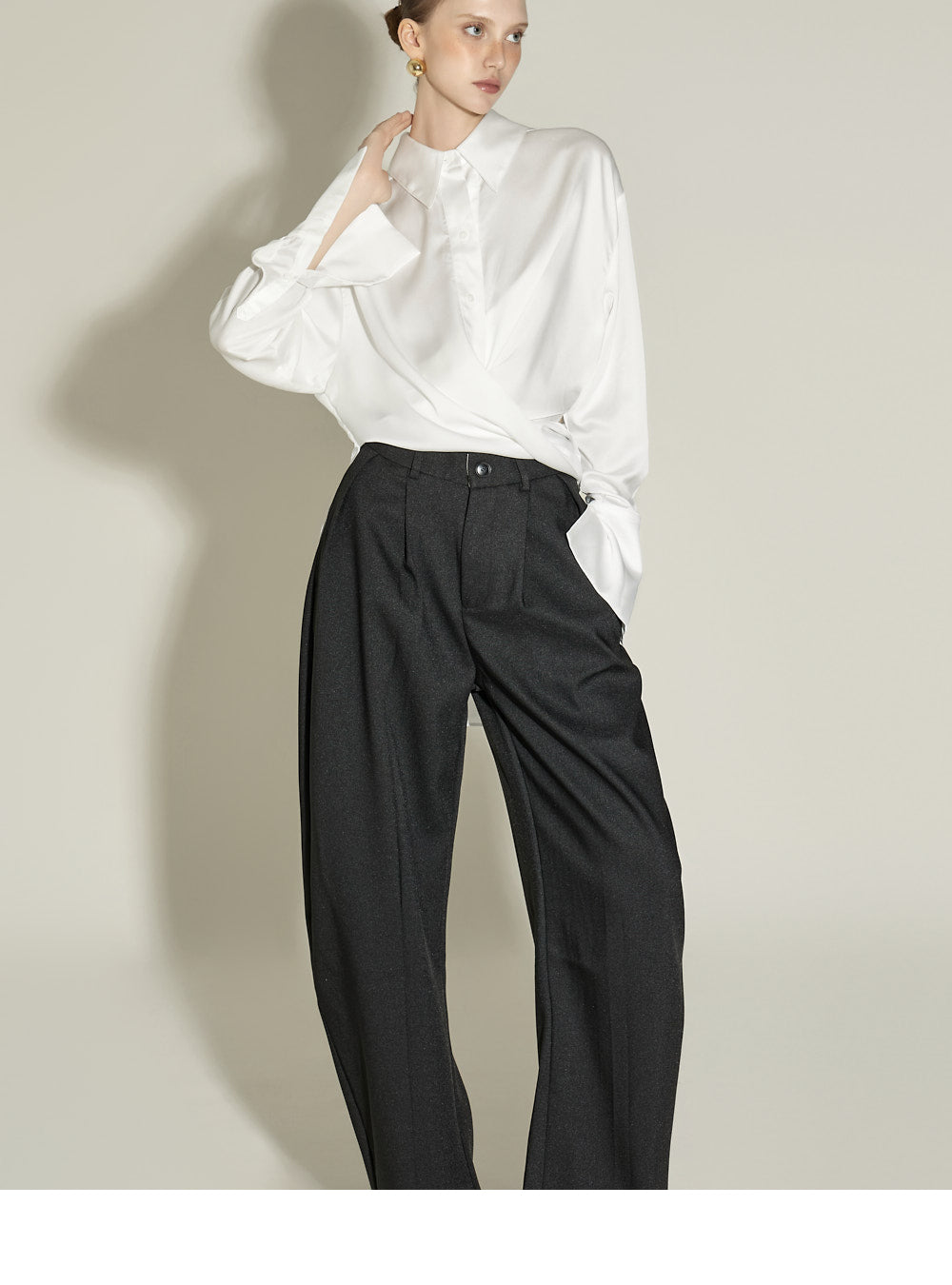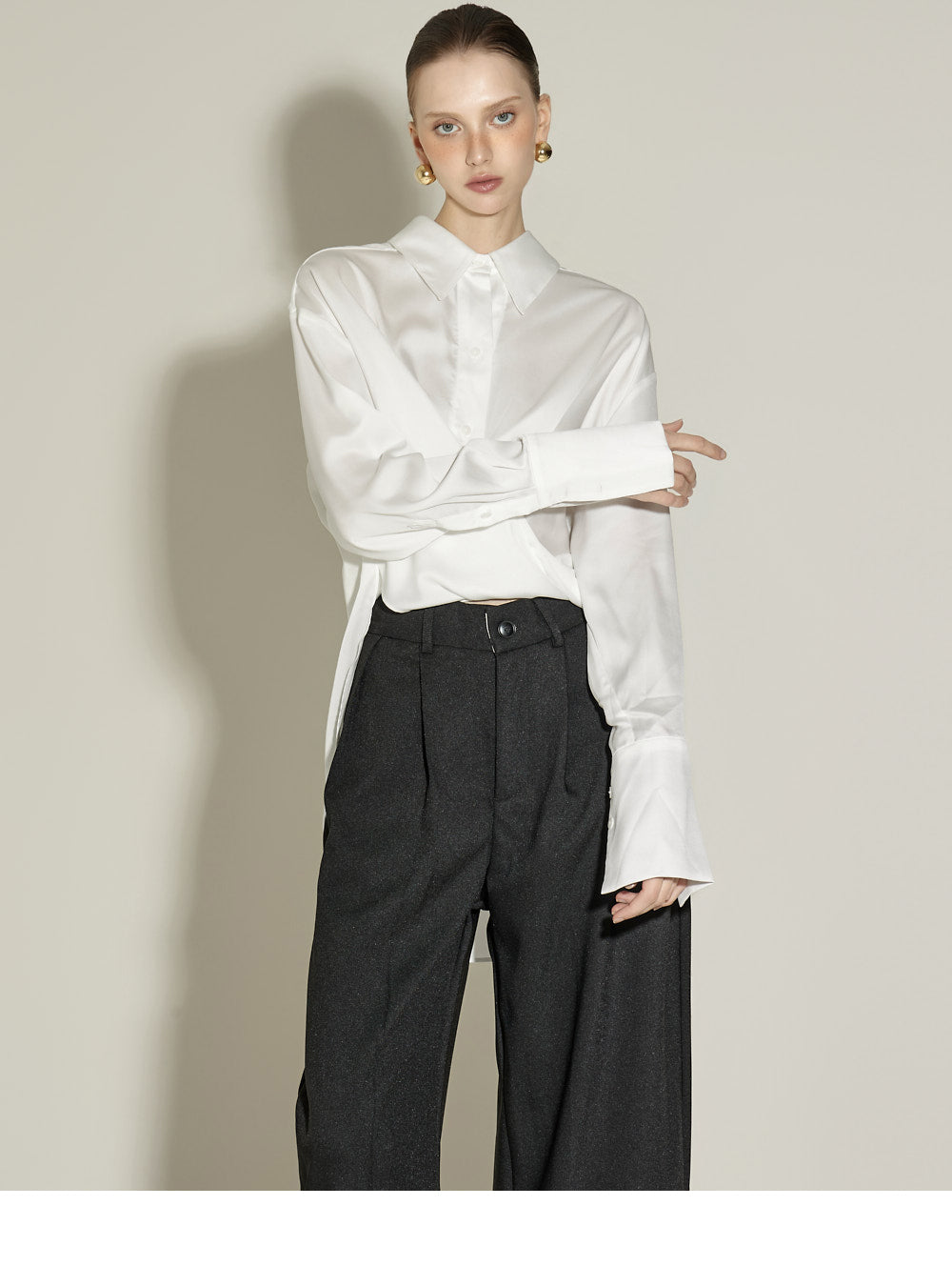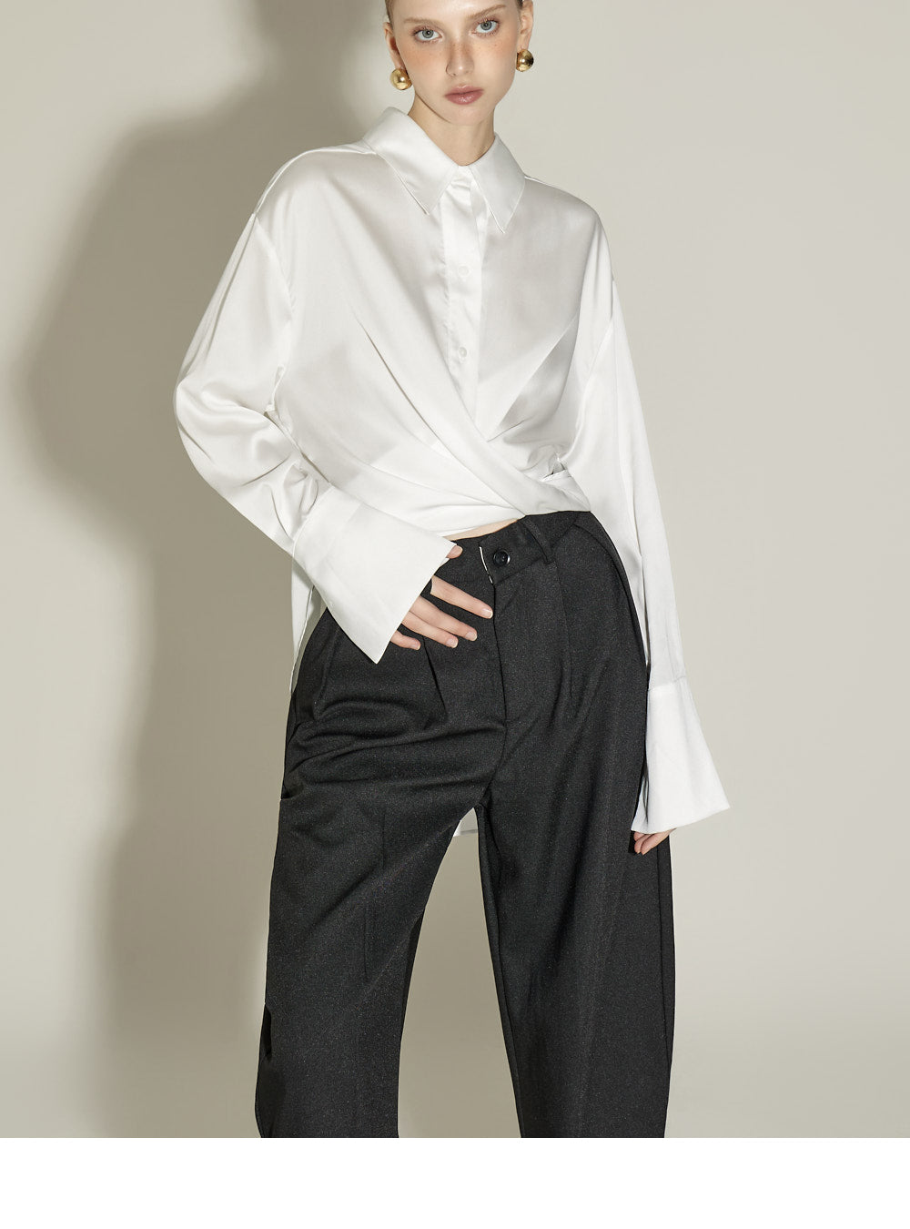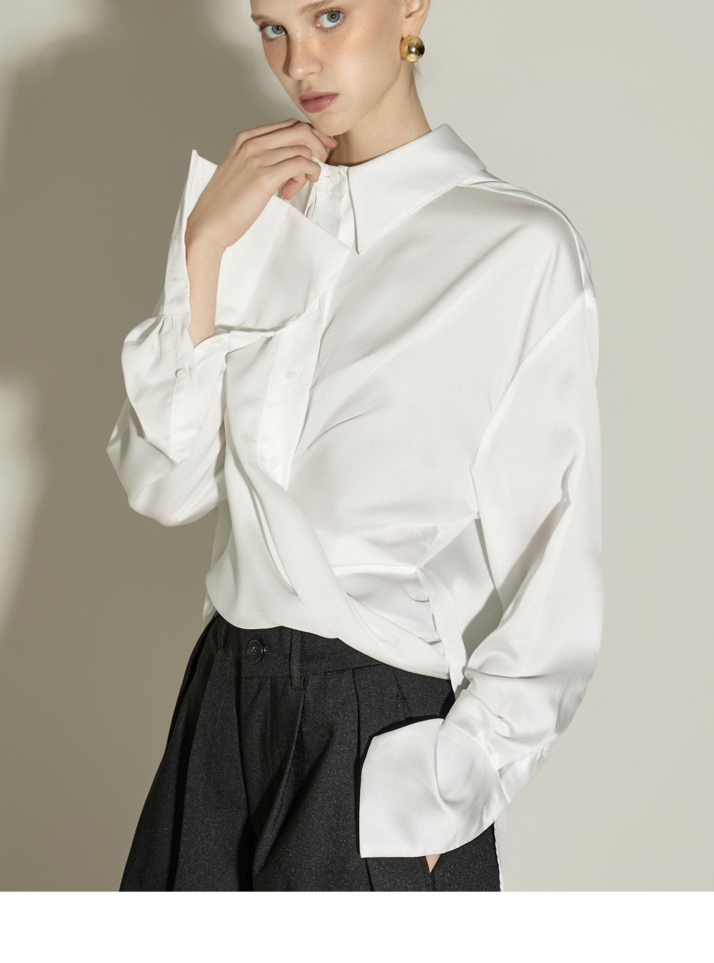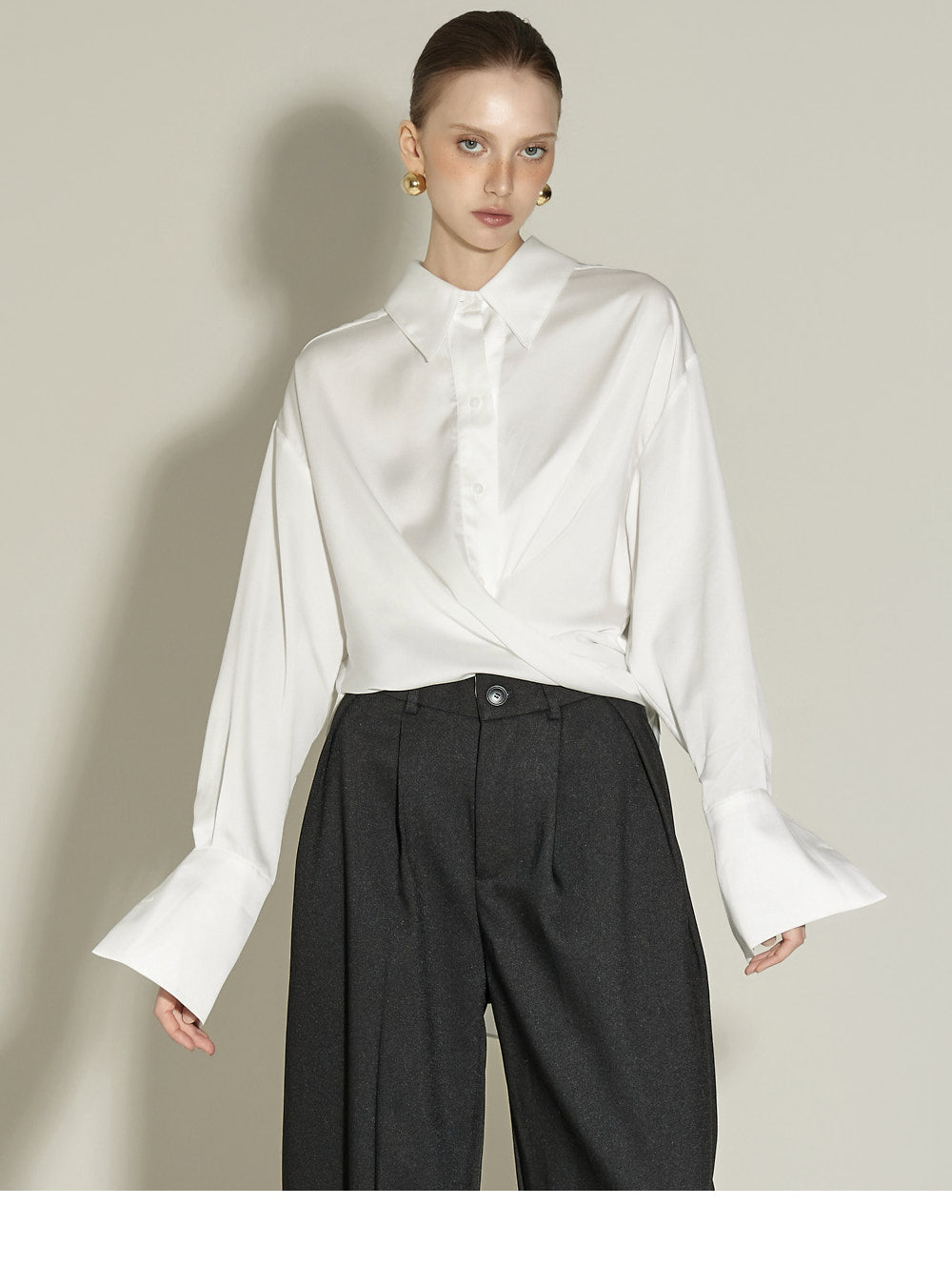 The front pintuck detail and voluminous cuffed fit