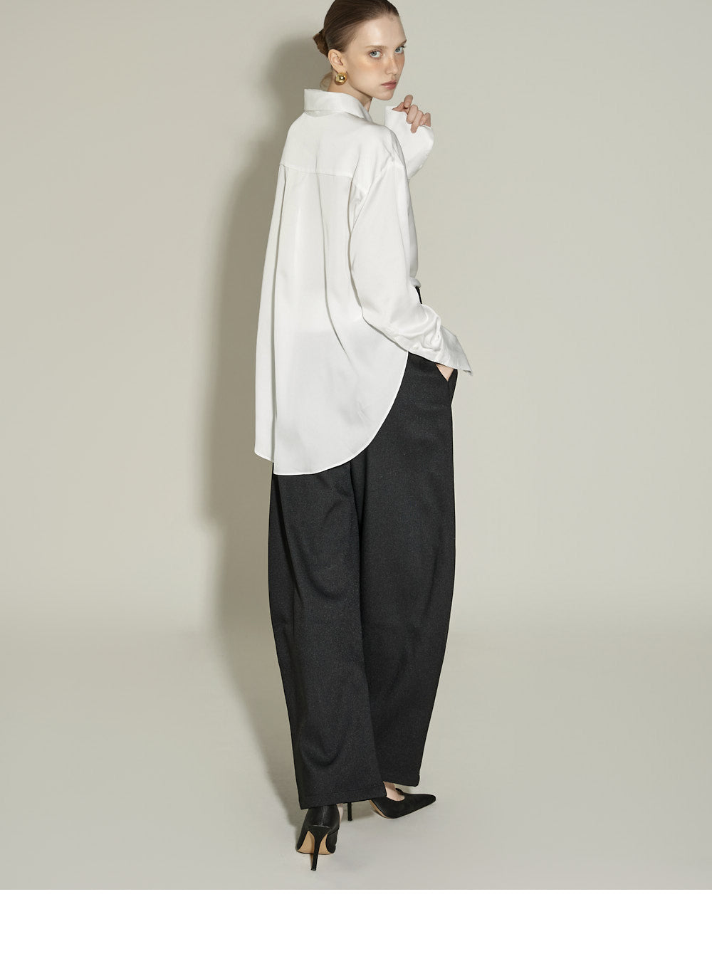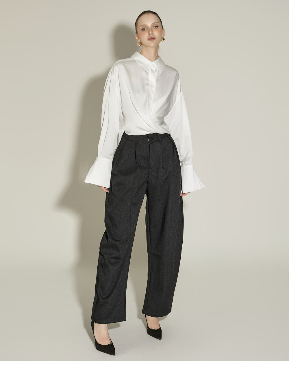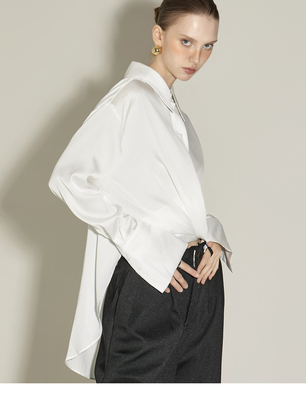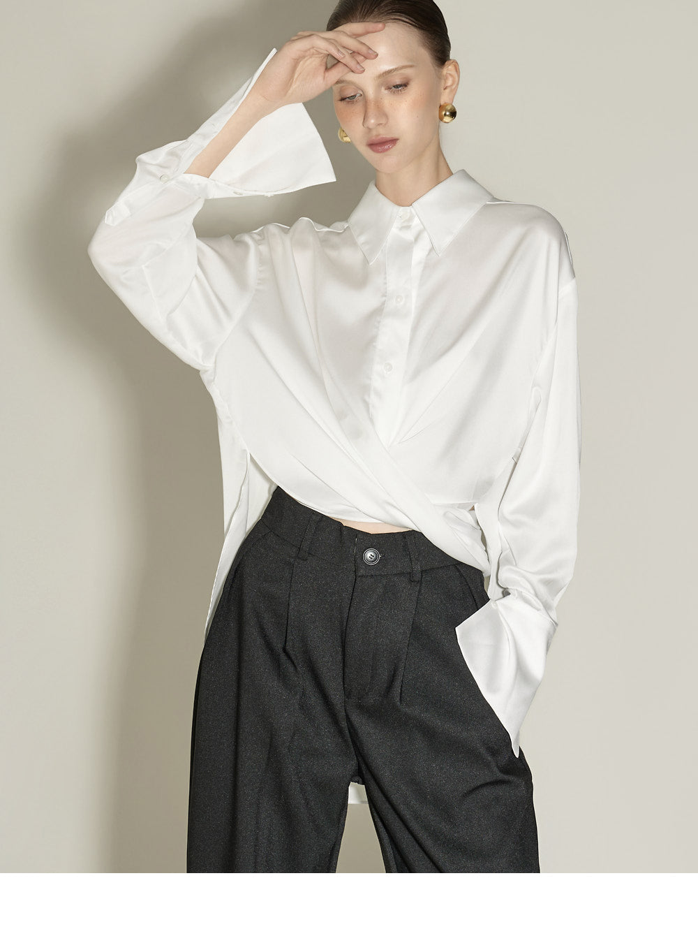 The front pintuck detail and voluminous cuffed fit