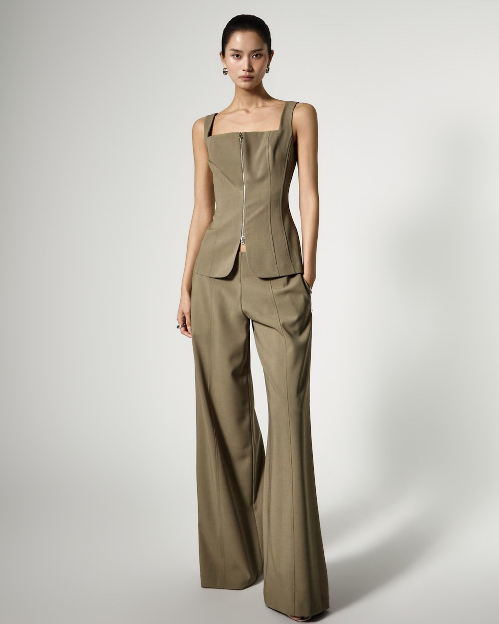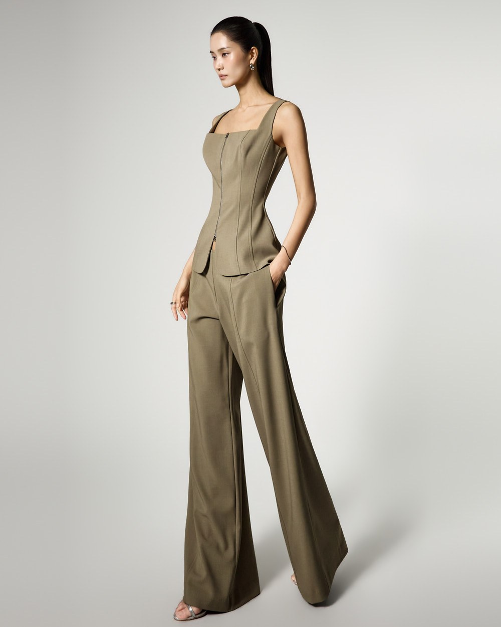The low-waist design sets the waistline low, completing a sophisticated yet cool look.