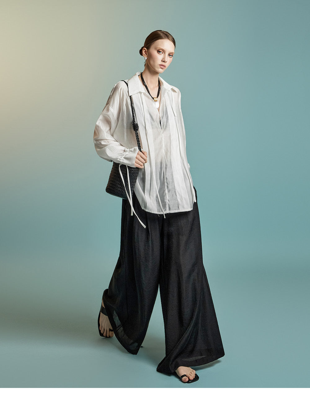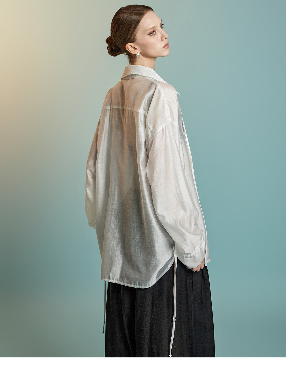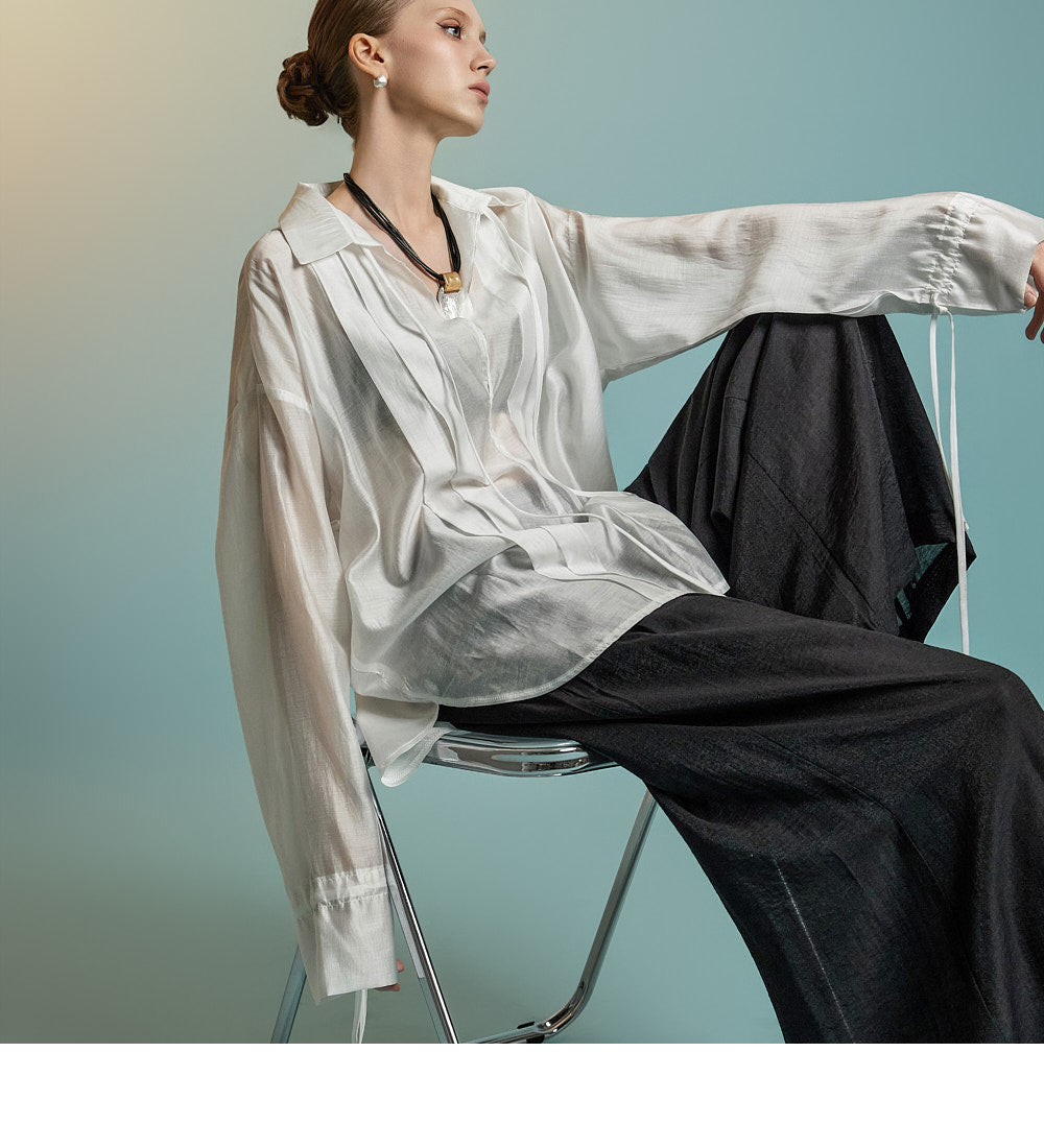 The loose silhouette and deep V-neck create a subtly sexy and delicate look.
