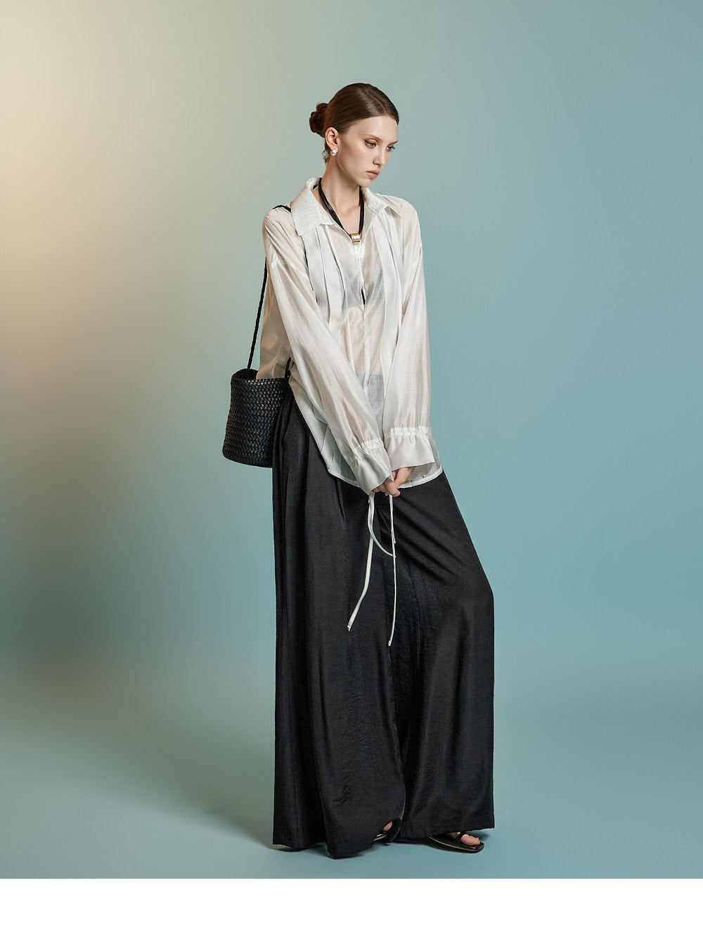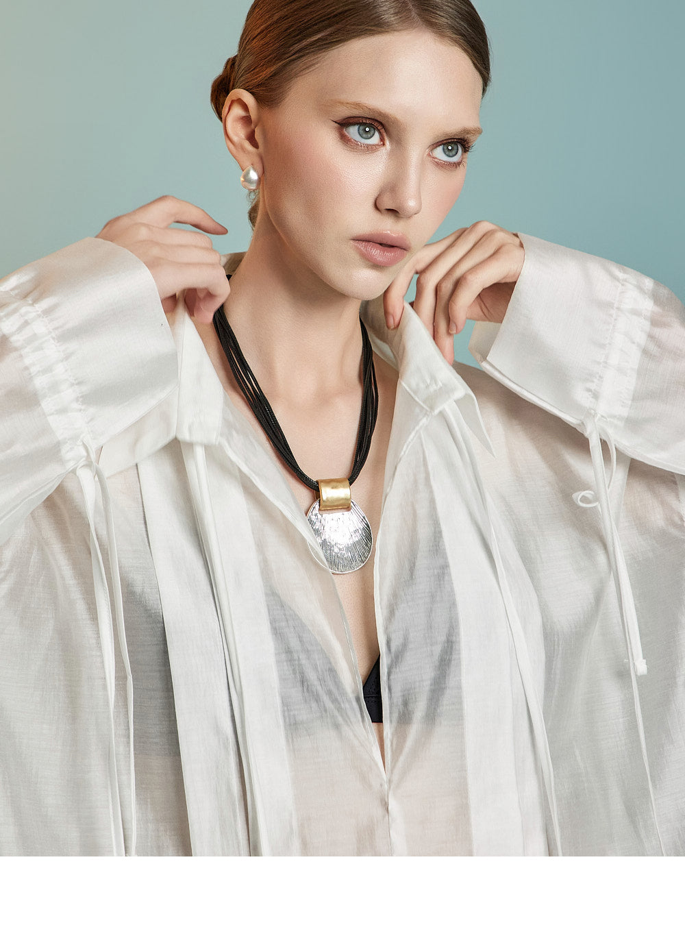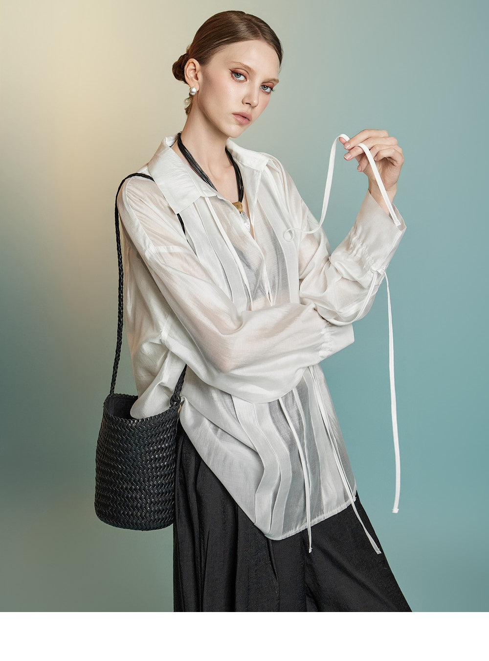 The loose silhouette and deep V-neck create a subtly sexy and delicate look.