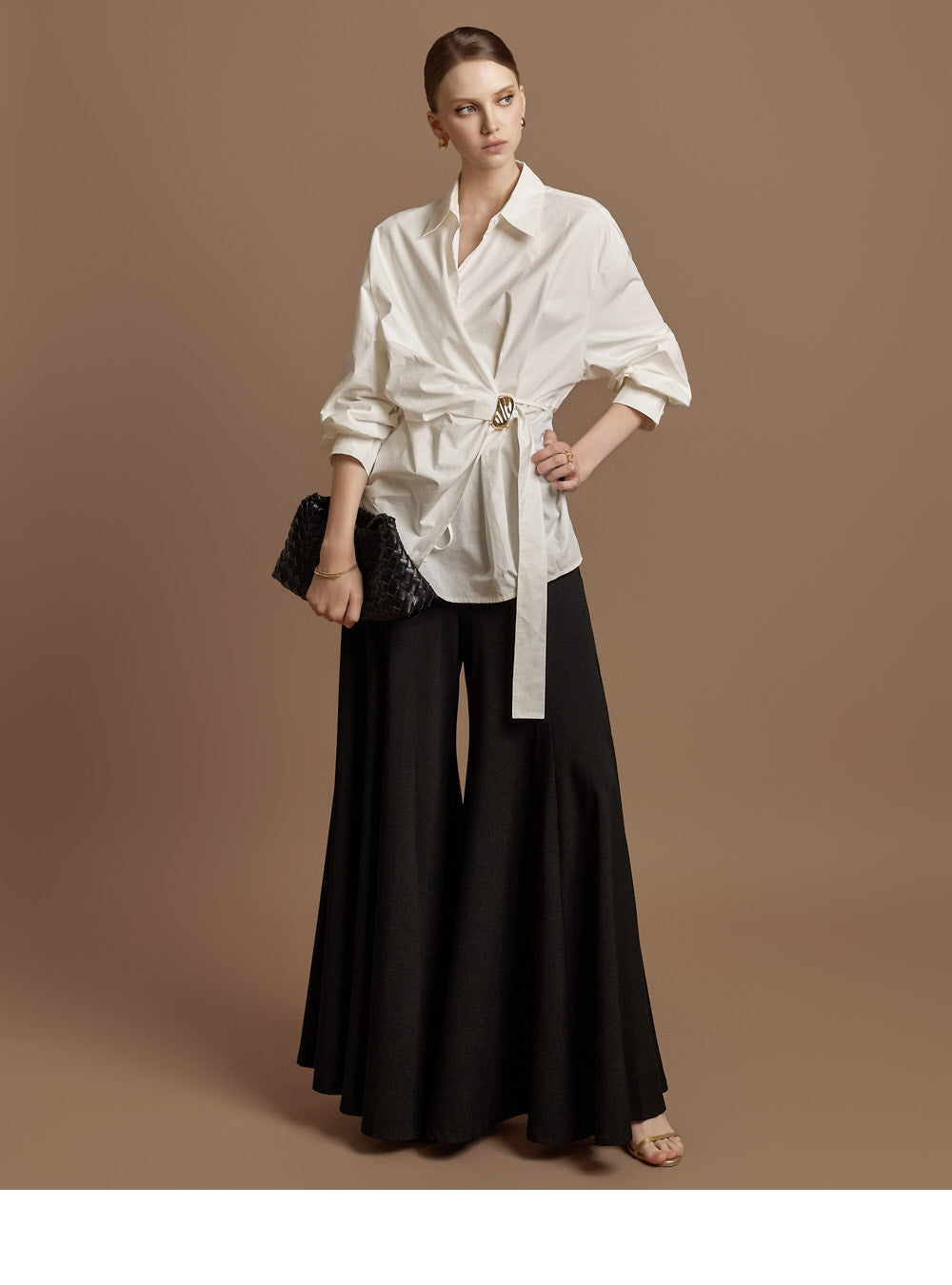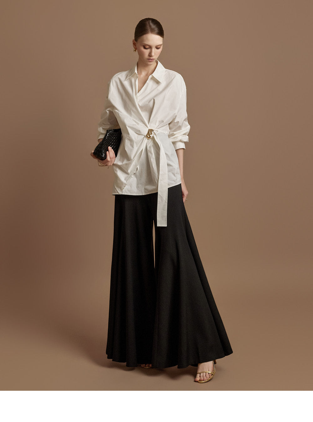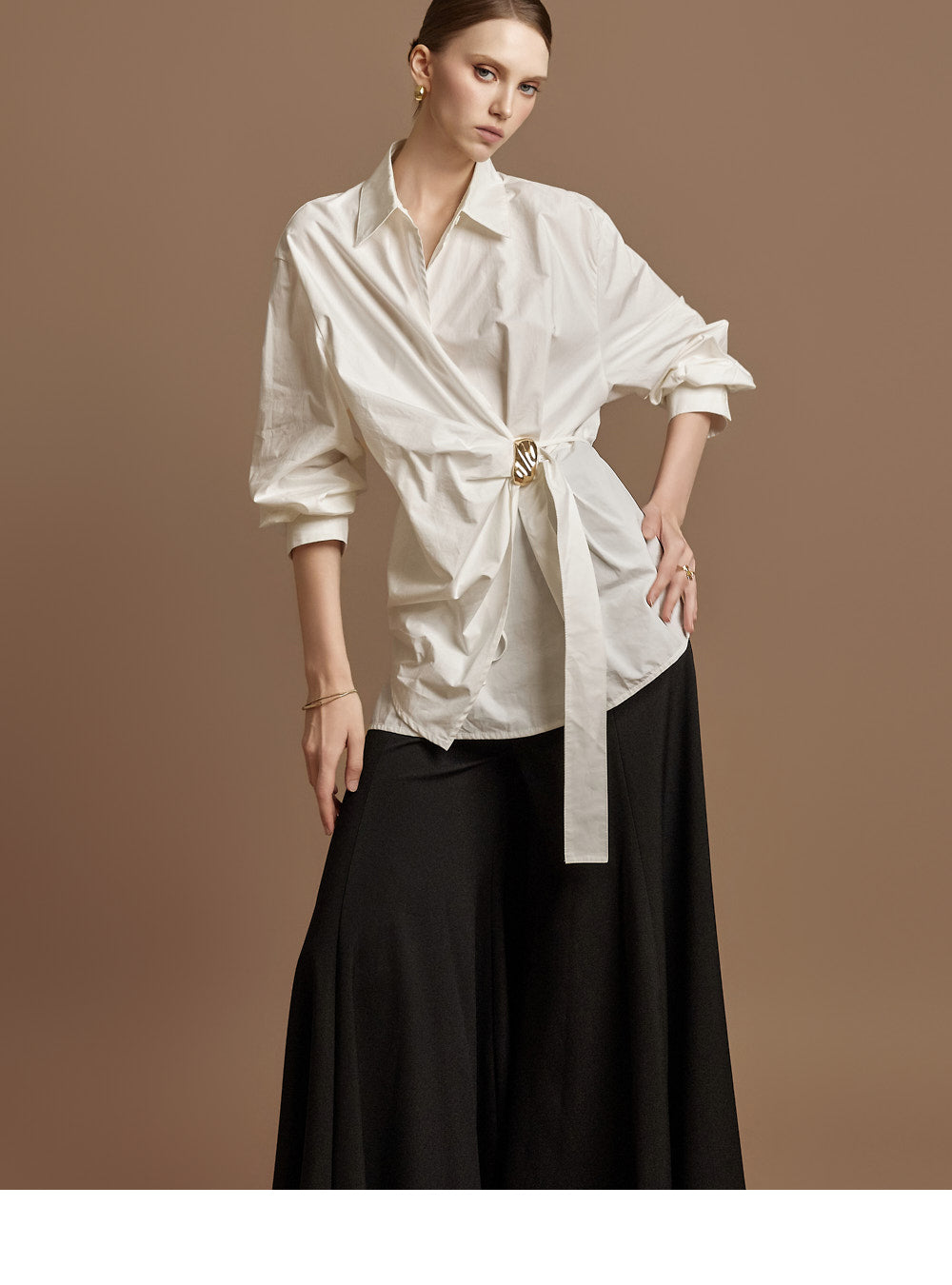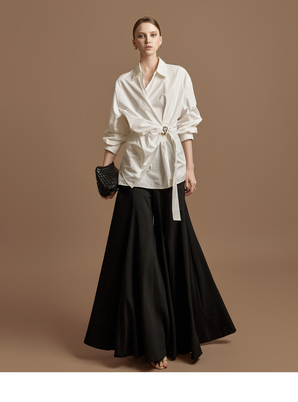 The waist features an integrated belt with a gold buckle,