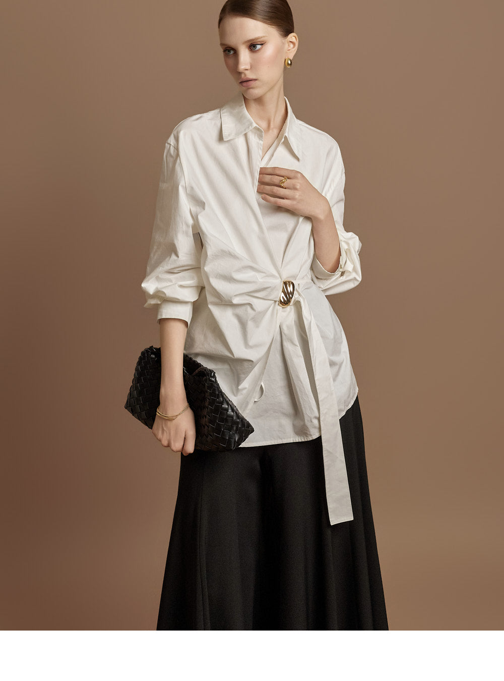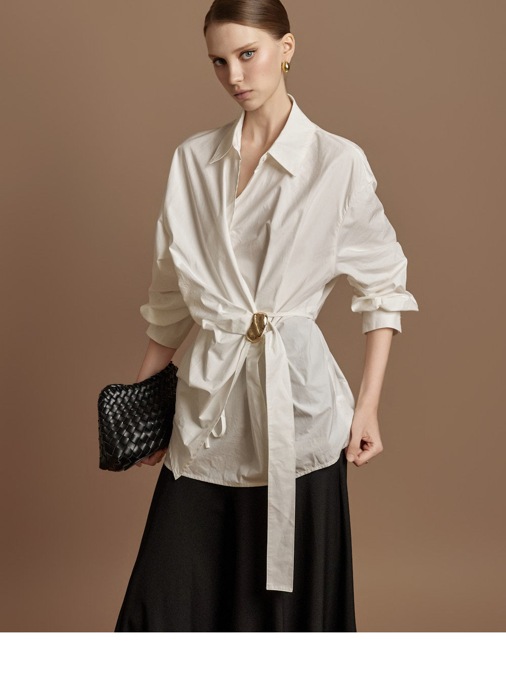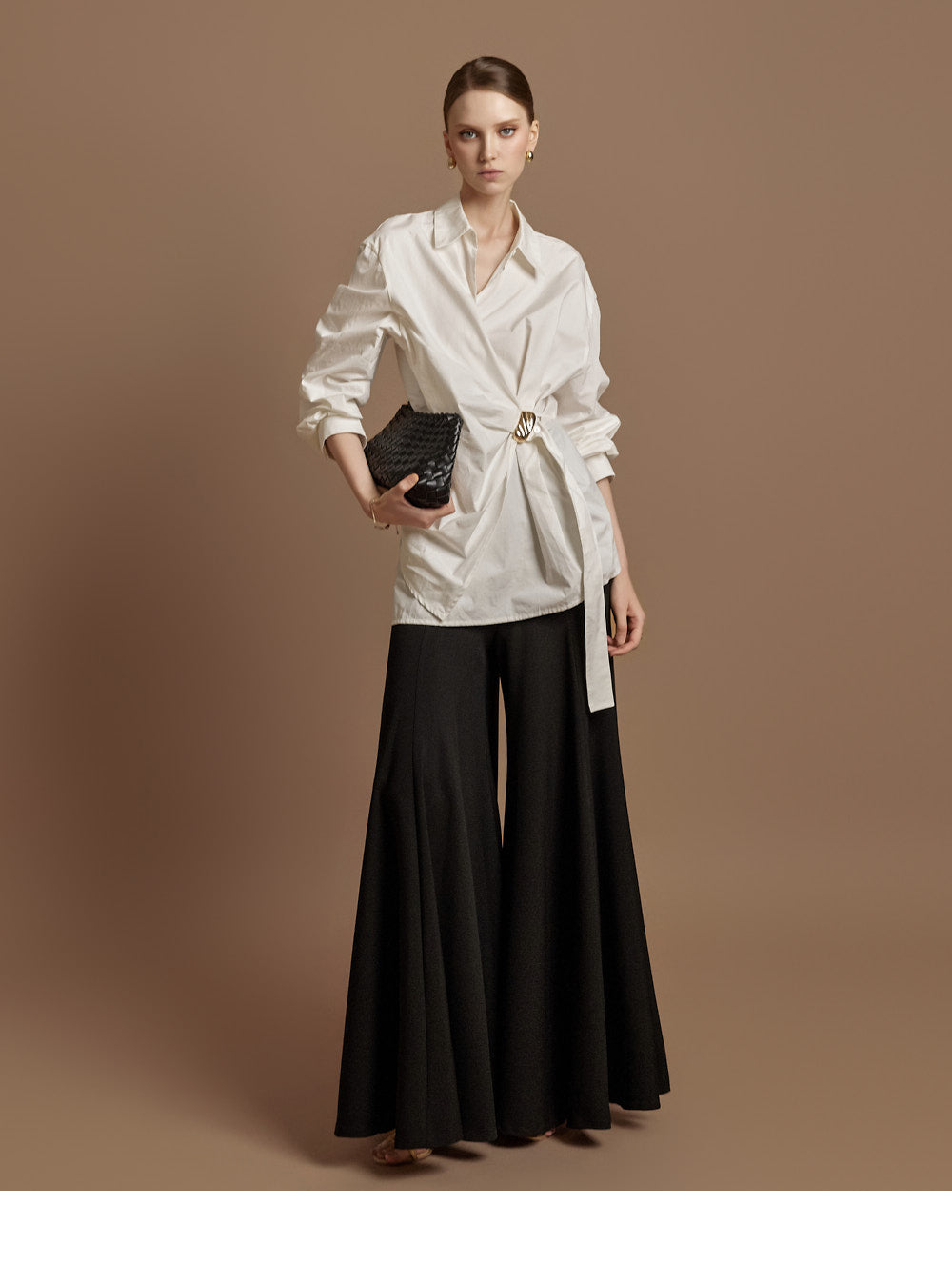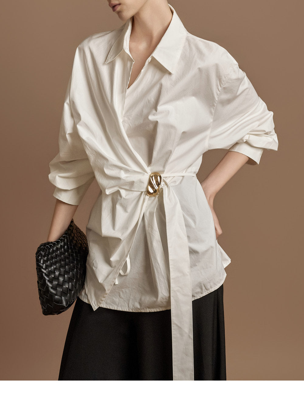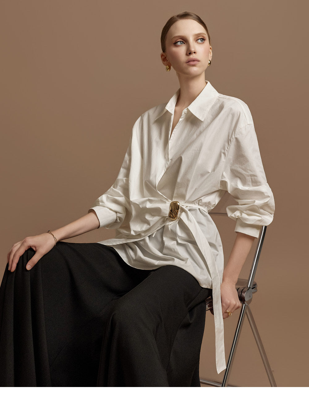 The waist features an integrated belt with a gold buckle,