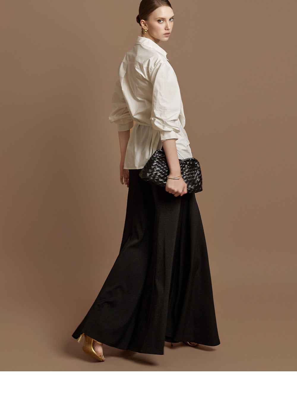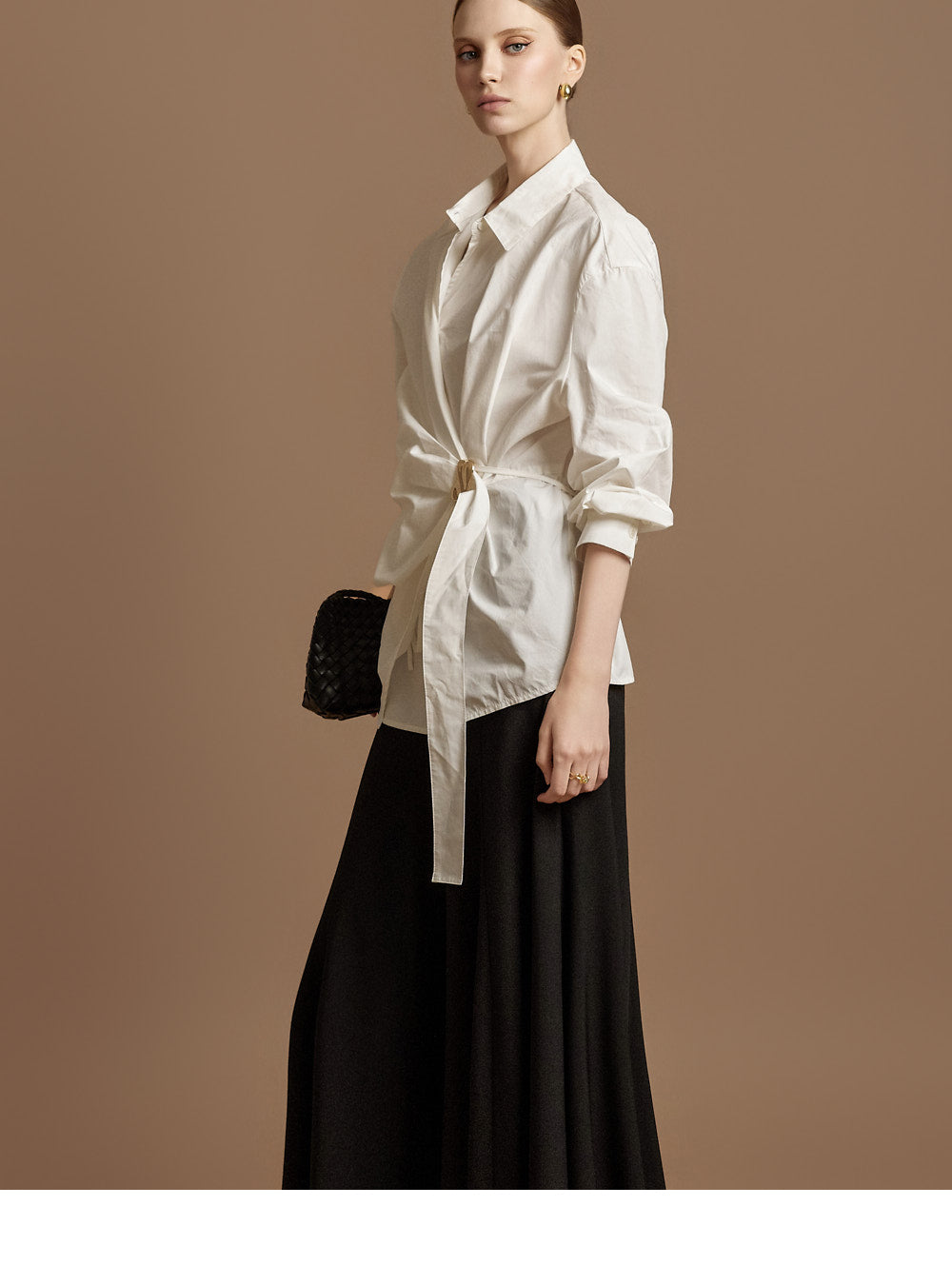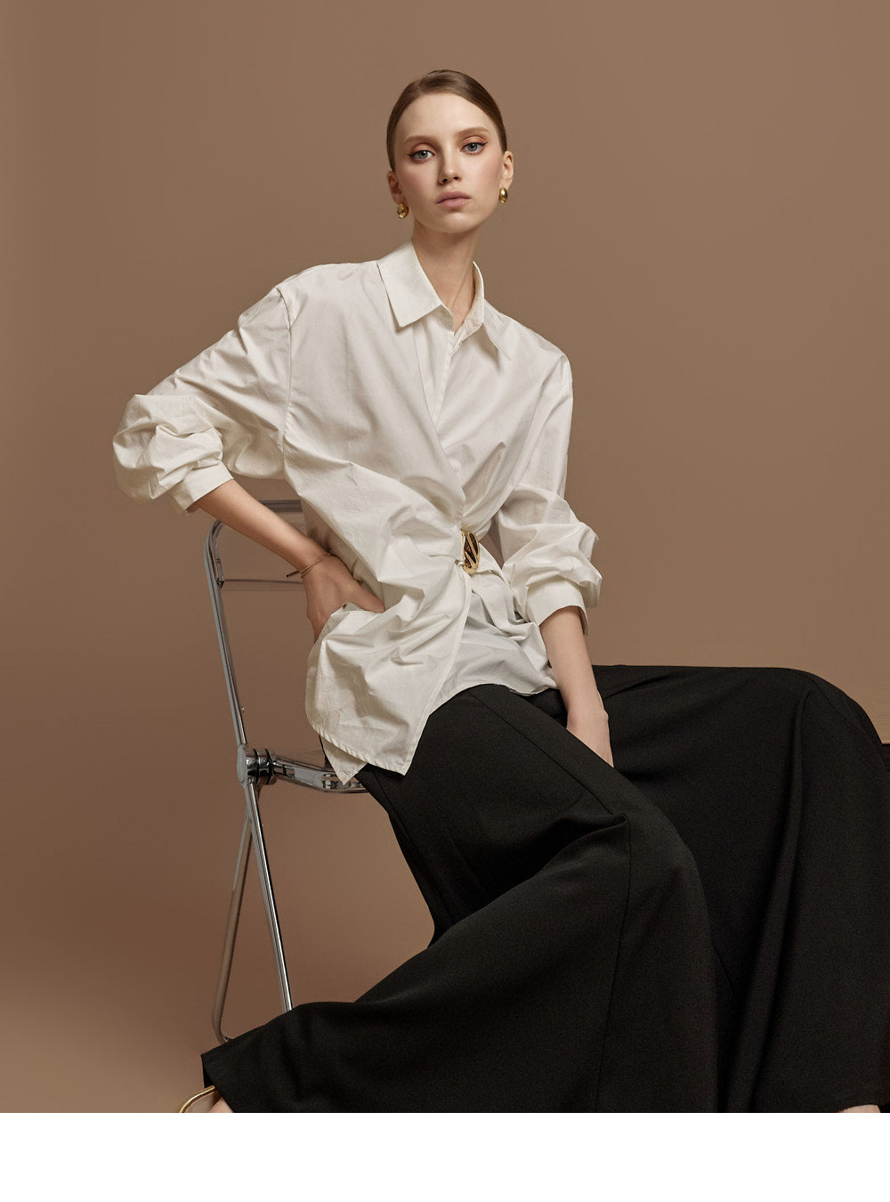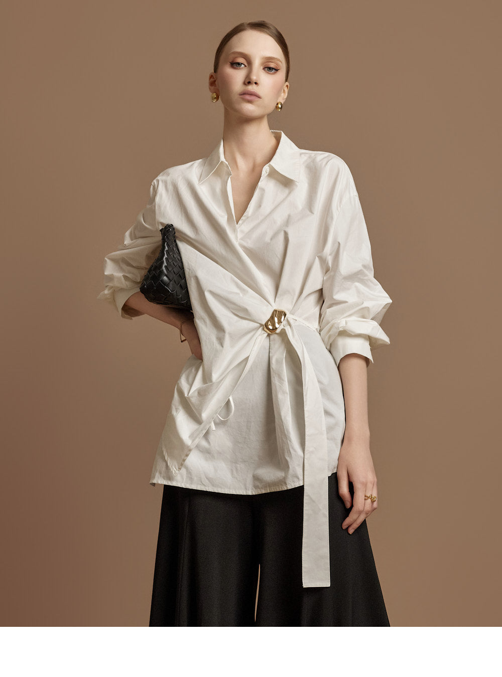 The waist features an integrated belt with a gold buckle,