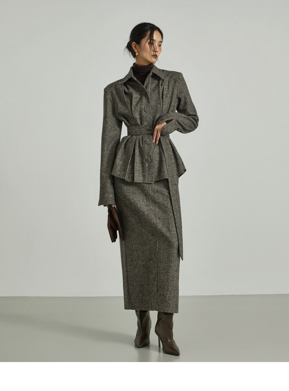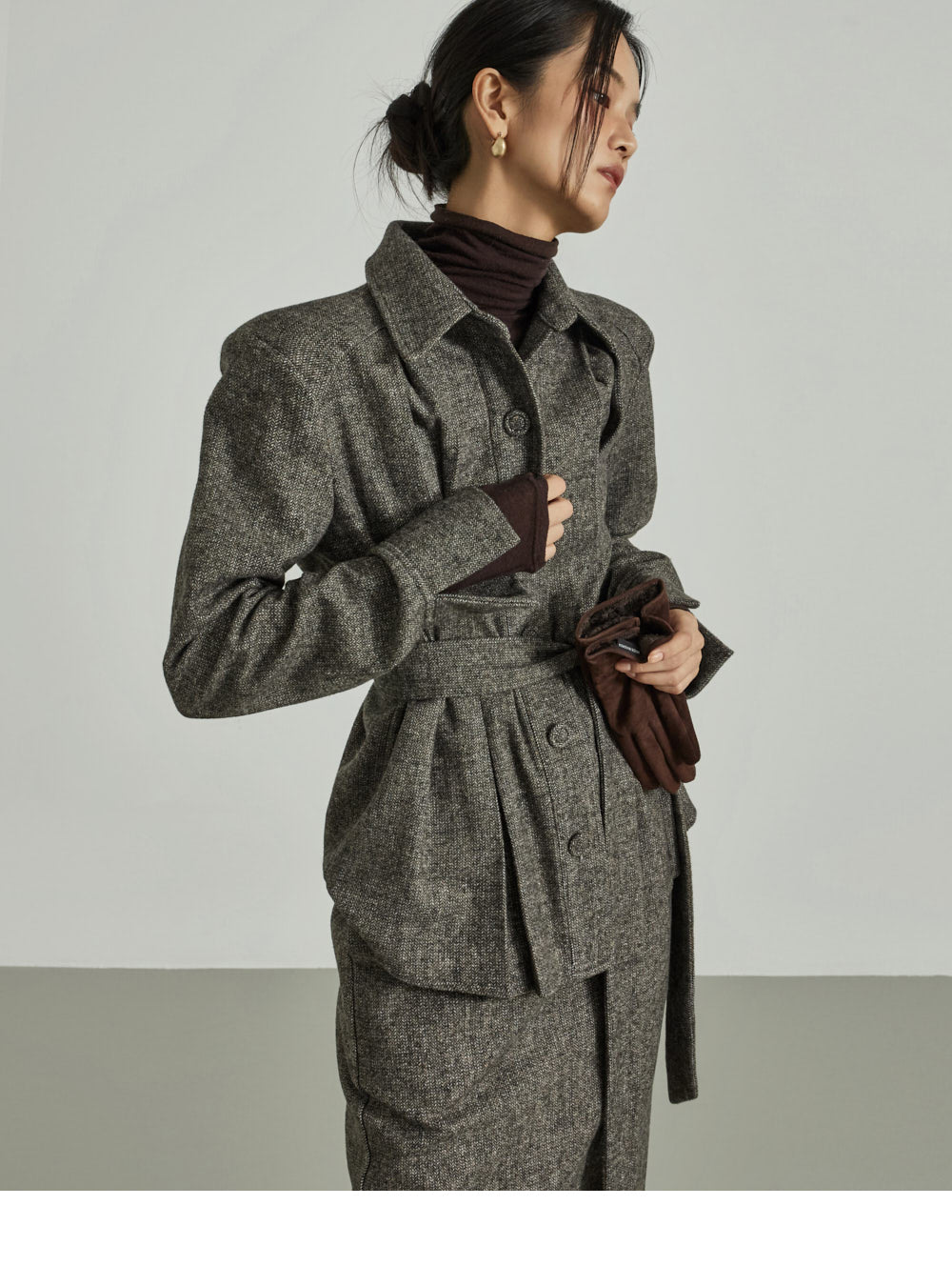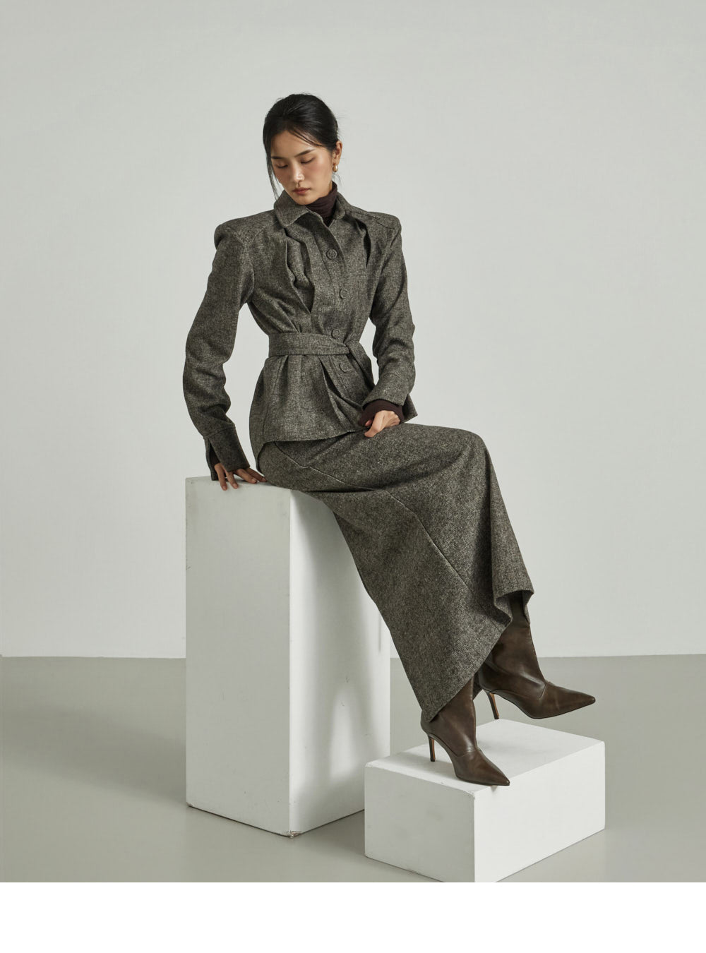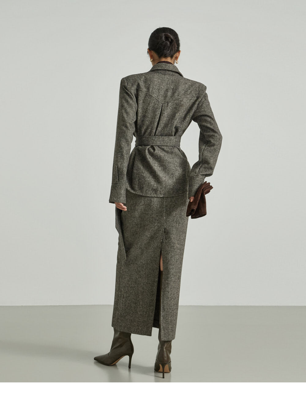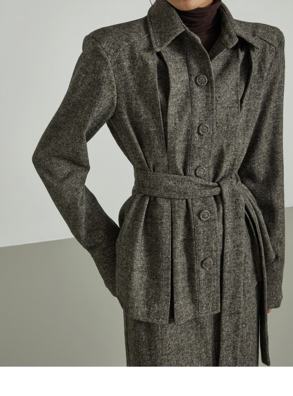 Slit sleeves and shoulder pads provide structure, ,completing a sophisticated fit.