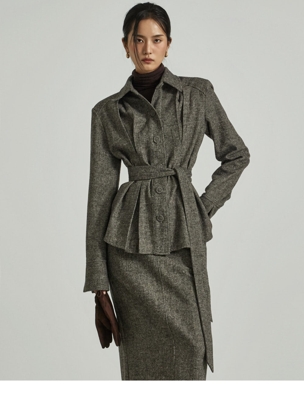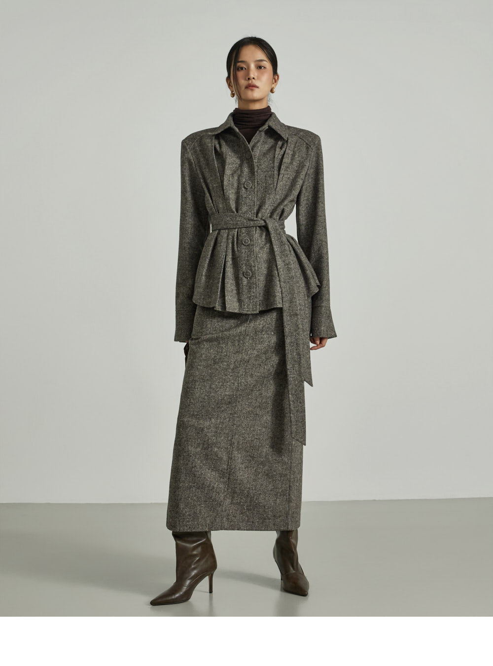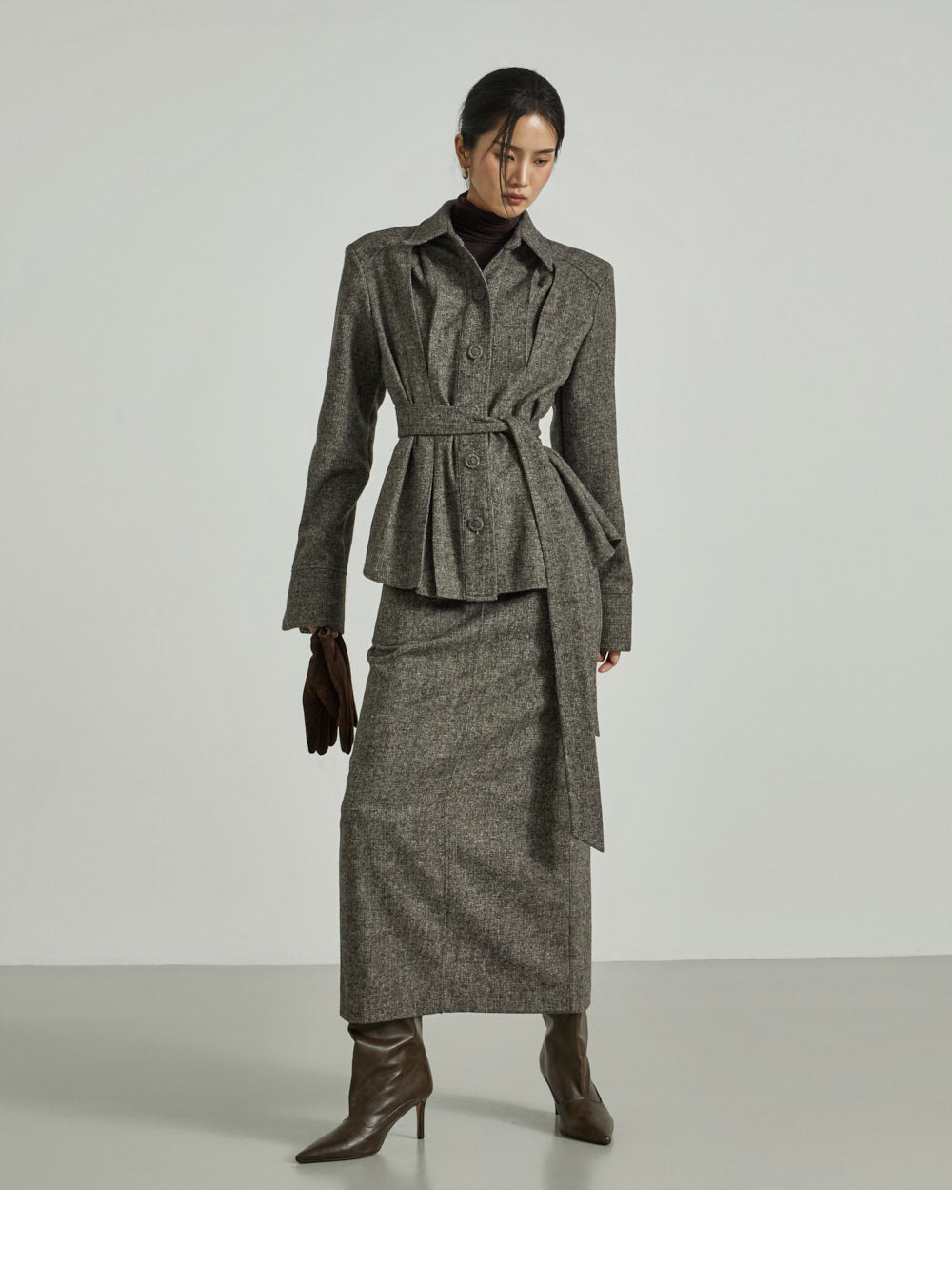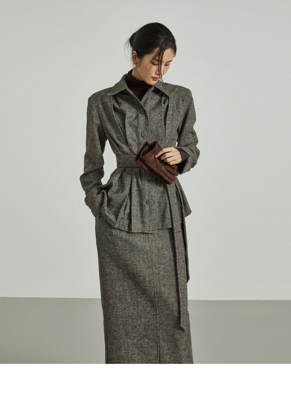 Slit sleeves and shoulder pads provide structure, ,completing a sophisticated fit.
